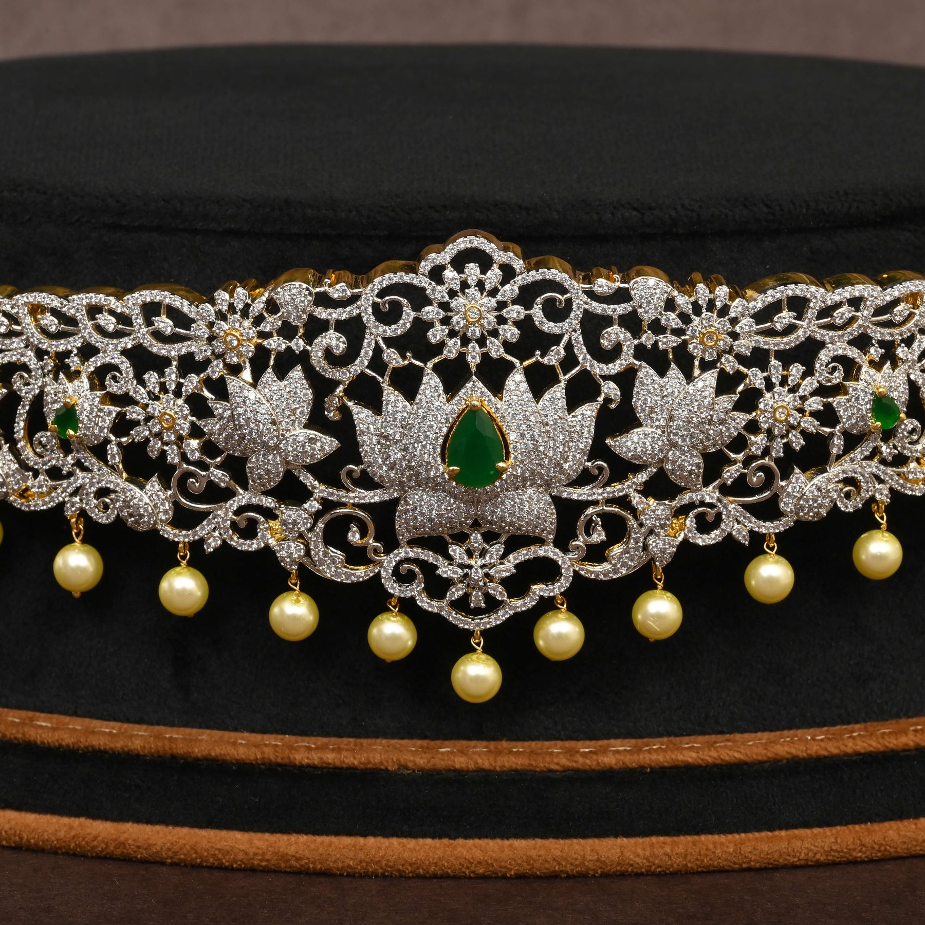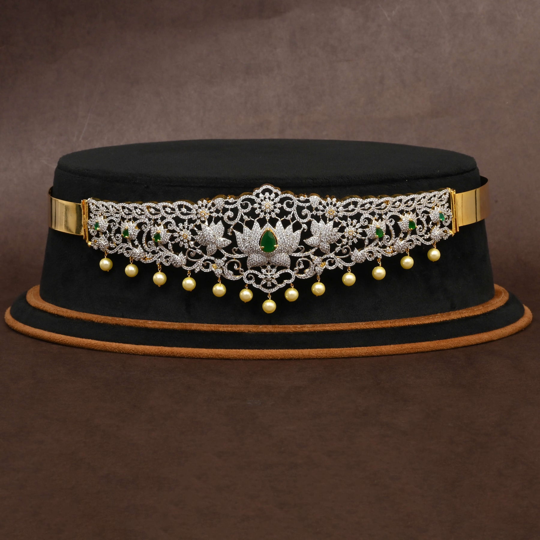 This CZ Baby Vaddanam features a stunning, handcrafted design that blends the brilliance of real diamond-like cubic zirconia with the vibrant allure of semi-precious emerald stones. Expertly crafted for a one-of-a-kind look, this chain vaddanam offers delicate elegance perfect for your baby’s special occasions, combining traditional charm with lasting beauty.