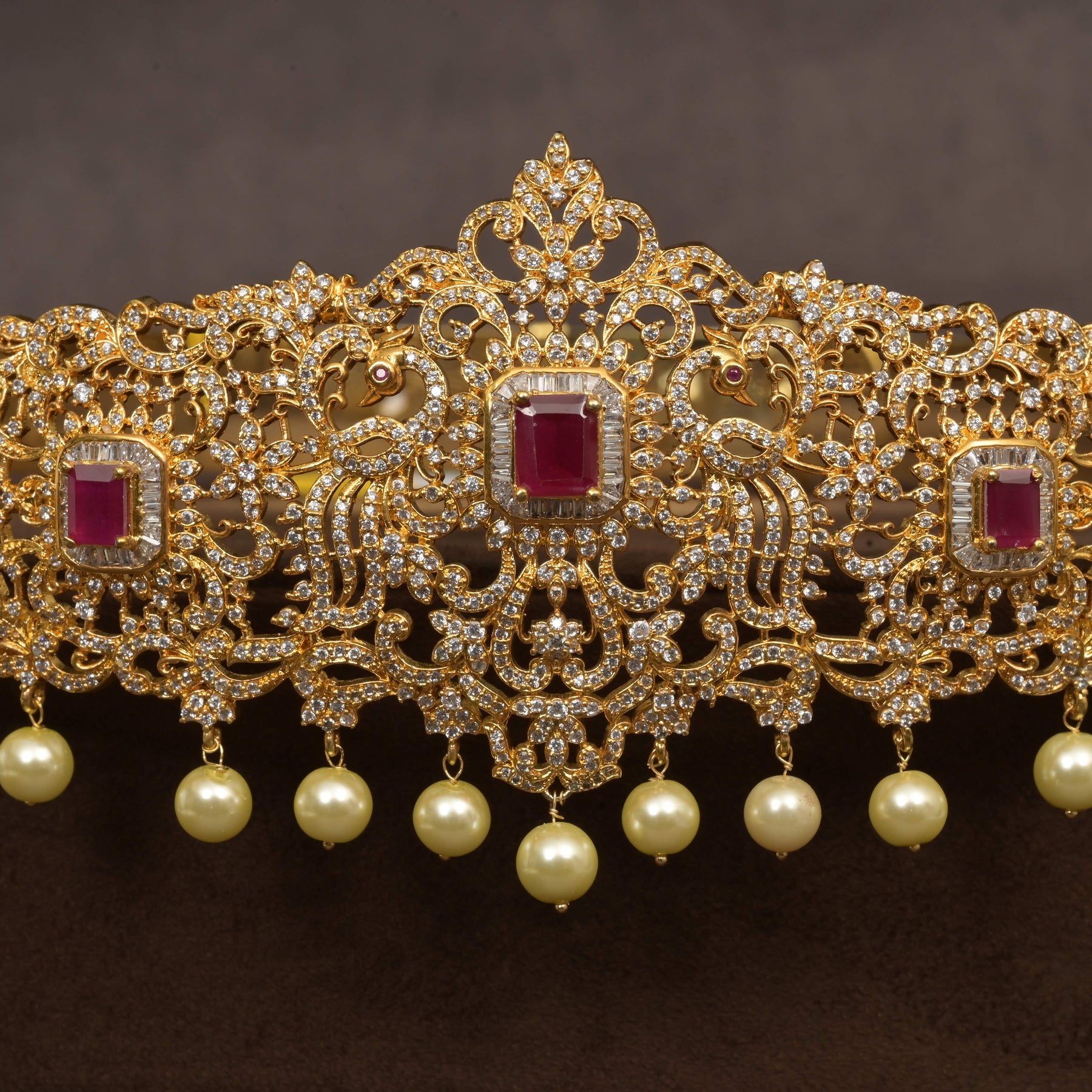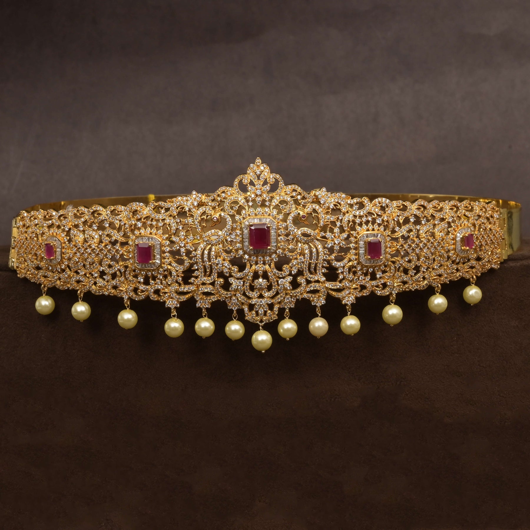 Elevate your little one's elegance with this exquisite CZ Baby Vaddanam, meticulously handcrafted in lustrous gold finish. Featuring brilliant cubic zirconia stones that capture the radiance of real diamonds, complemented by semi-precious ruby accents, this waist ornament delivers timeless sophistication. Each piece is uniquely designed, making it a distinctive treasure for special occasions and celebrations. Perfect for gifting or personal collection, this one-of-a-kind creation combines traditional craftsmanship with contemporary allure.