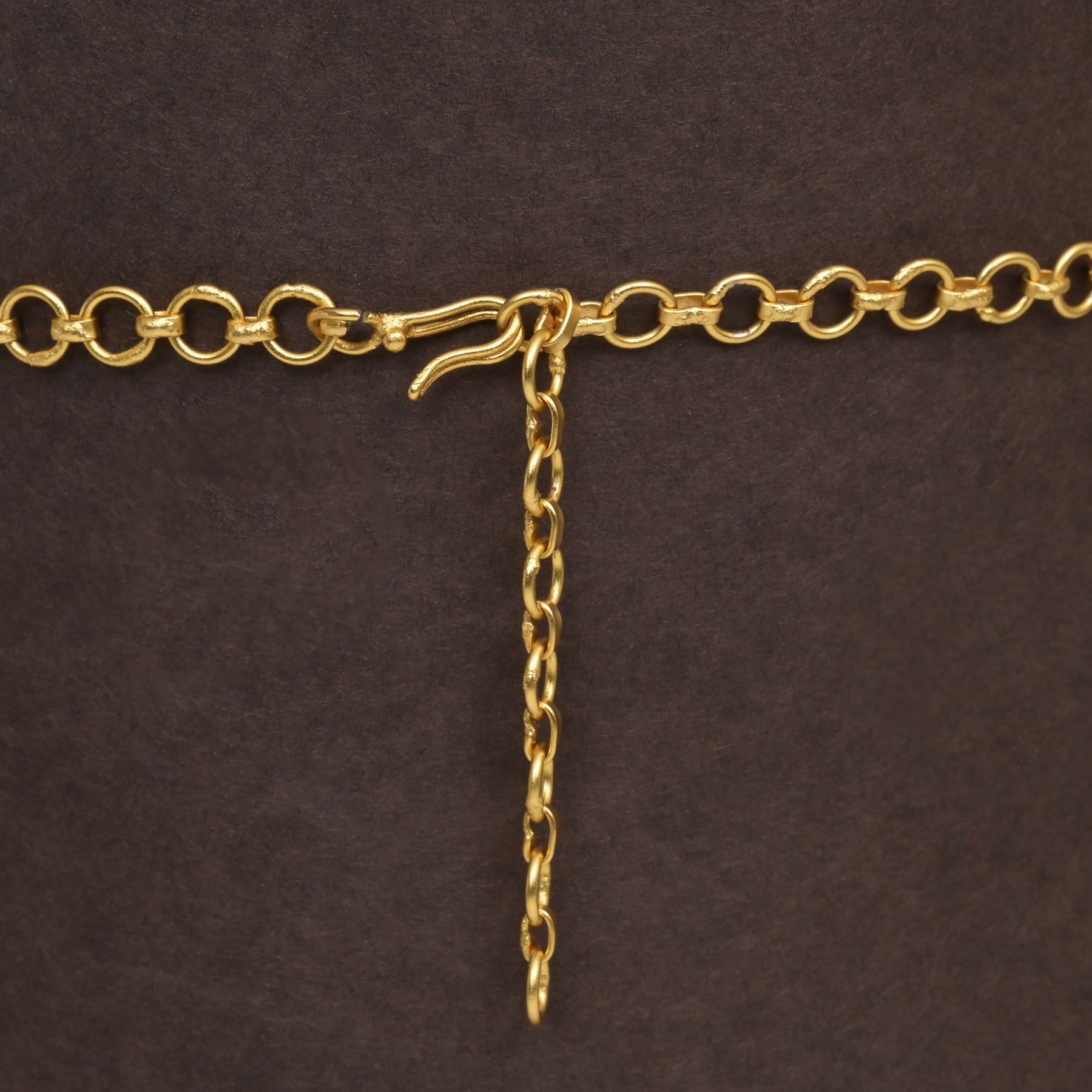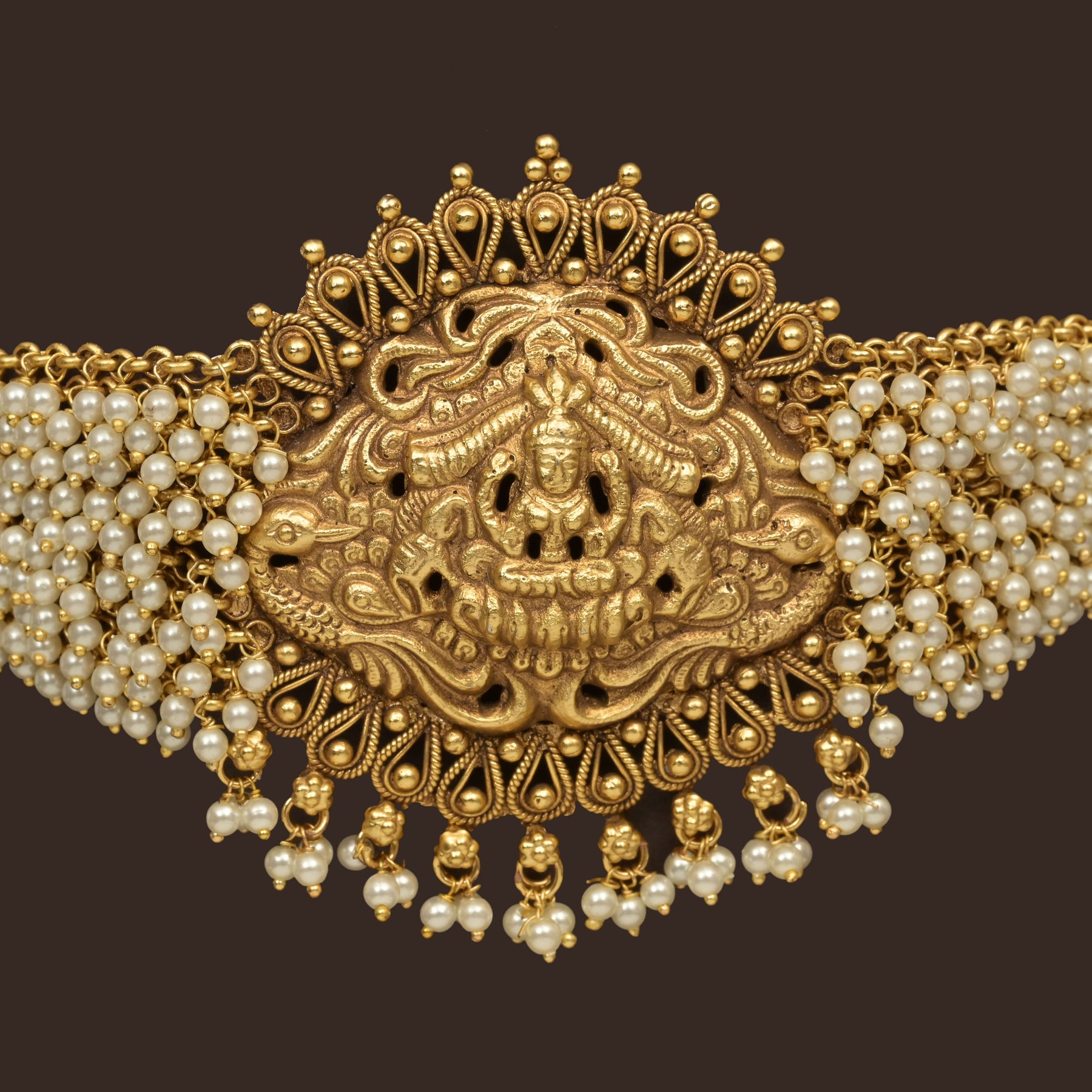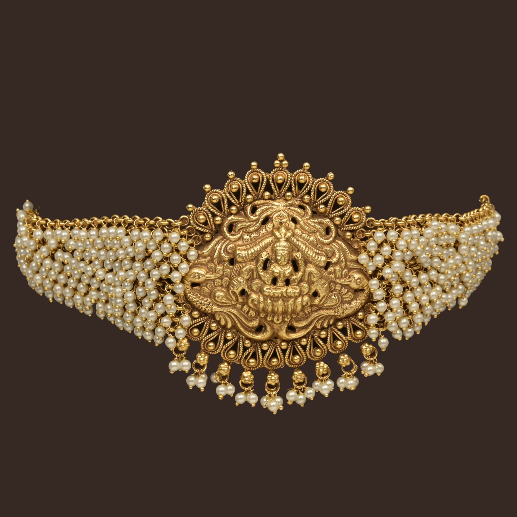 Temple Baby Vaddanam features an exquisite real gold finish with lustrous pearls delicately embedded throughout. Each piece is meticulously handcrafted, showcasing traditional artistry and attention to detail. This one-of-a-kind design captures the essence of temple jewelry, making it an ideal choice for special occasions, festivals, or as a cherished heirloom. The combination of authentic gold aesthetics and pearl embellishments creates a timeless accessory that celebrates heritage craftsmanship.