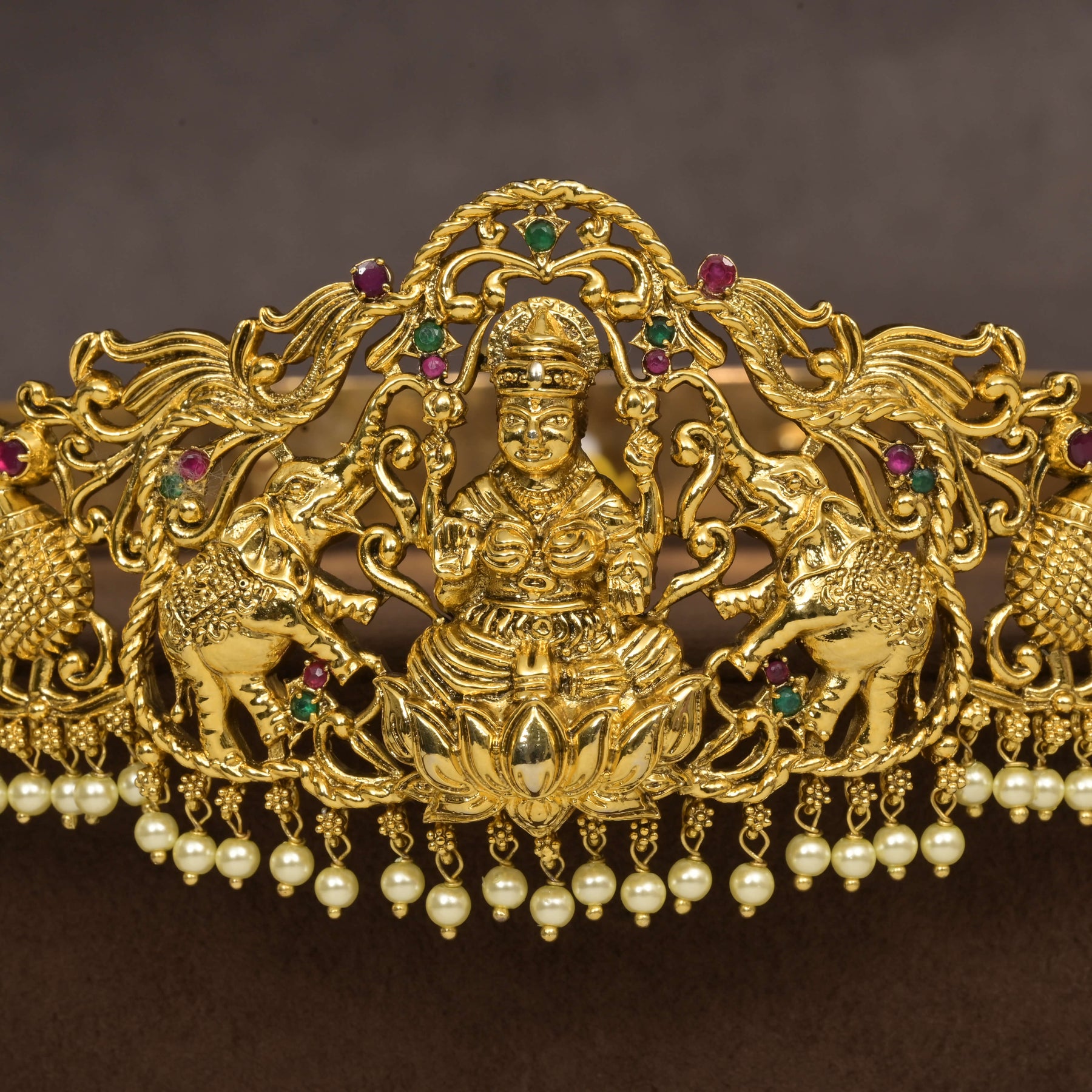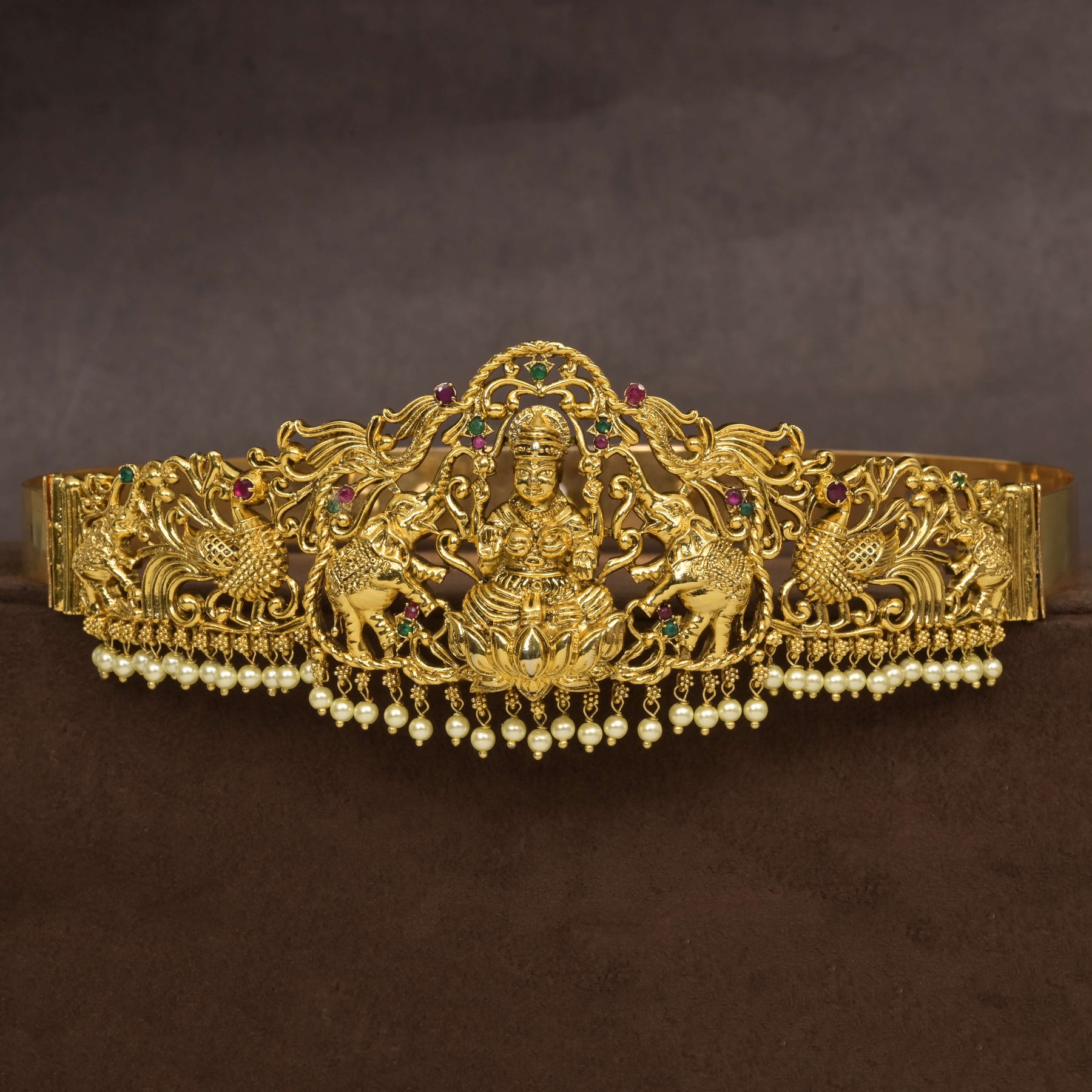 Adorn your little one with this exquisite Temple Baby Vaddanam, a handcrafted waist ornament inspired by traditional temple jewelry. Featuring a stunning real gold-like finish paired with lustrous pearls that dance gracefully with every movement, this piece captures the divine essence of Goddess Lakshmi. Each vaddanam is meticulously crafted as a one-of-a-kind design, blending heritage craftsmanship with timeless elegance. Perfect for special occasions, festivals, or everyday wear, this ornament celebrates cultural artistry while adding a touch of spiritual grace to your child's wardrobe.