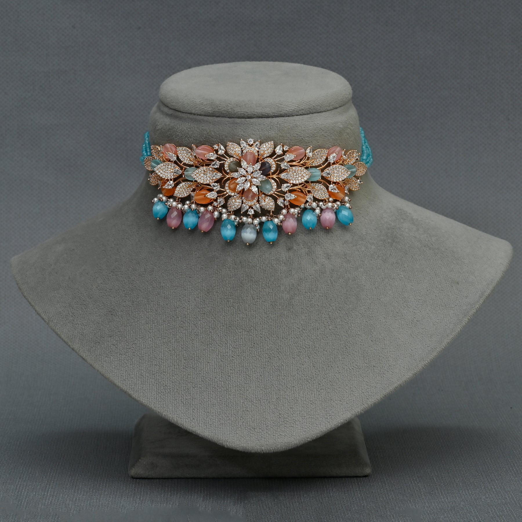 Elevate your neckline with this exquisite Beads Choker Set, meticulously handcrafted in lustrous rose gold finish. Each piece features authentic cubic zirconia stones that capture light with brilliant sparkle, delivering the sophistication of fine jewelry. The one-of-a-kind design showcases intricate beadwork that combines contemporary elegance with timeless appeal. Perfect for those who appreciate distinctive, artisanal craftsmanship, this choker makes a refined statement for both special occasions and elevated everyday wear.