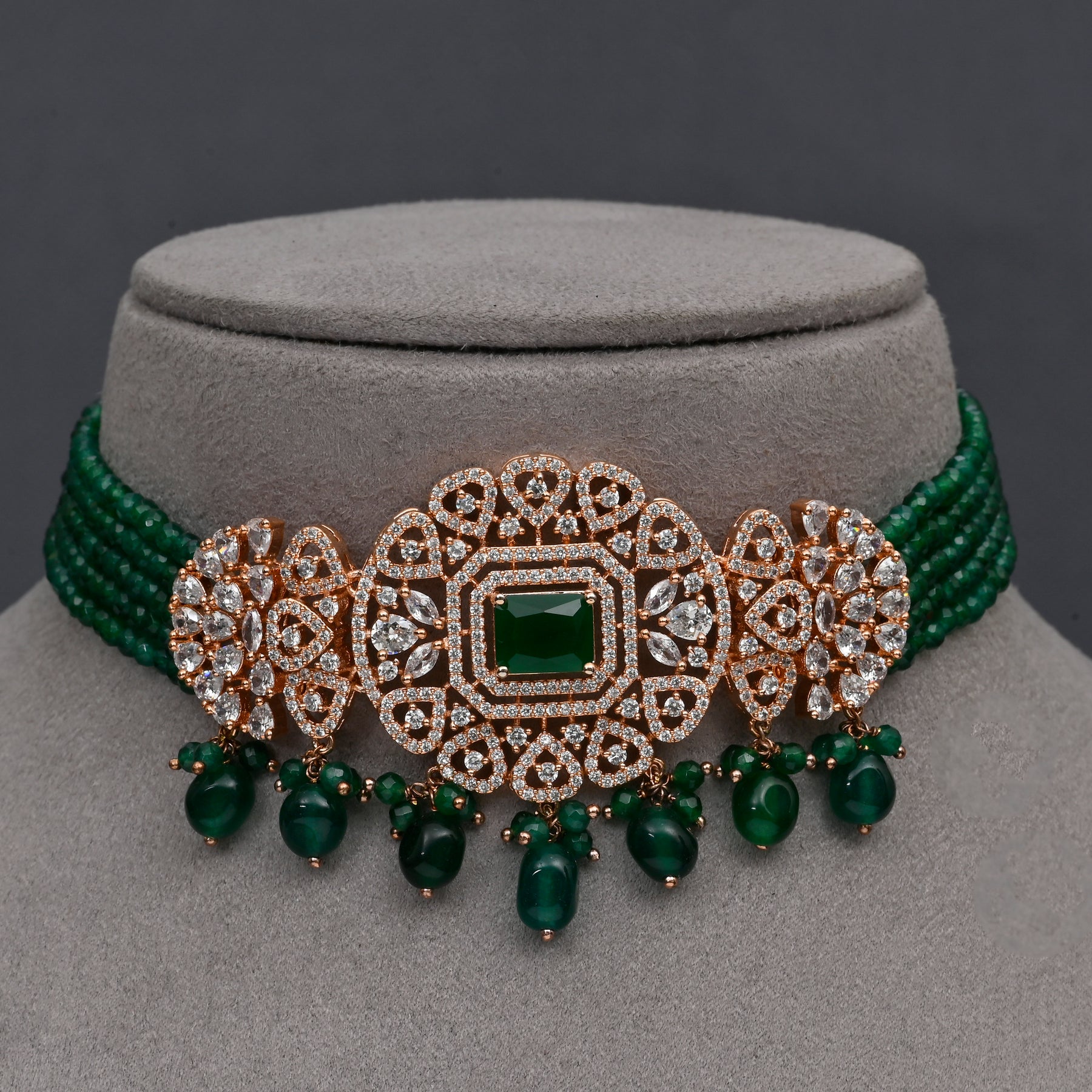 Elevate your jewelry collection with this exquisite Beads Choker Set, meticulously handcrafted in lustrous rose gold finish. Adorned with authentic CZ stones that sparkle with brilliance, this piece combines timeless elegance with contemporary design sensibilities. Each choker is individually crafted, ensuring a truly one-of-a-kind aesthetic that sets you apart. The refined beadwork and sophisticated silhouette deliver a classy, versatile look suitable for both special occasions and elevated everyday wear. A testament to fine craftsmanship and distinctive style.