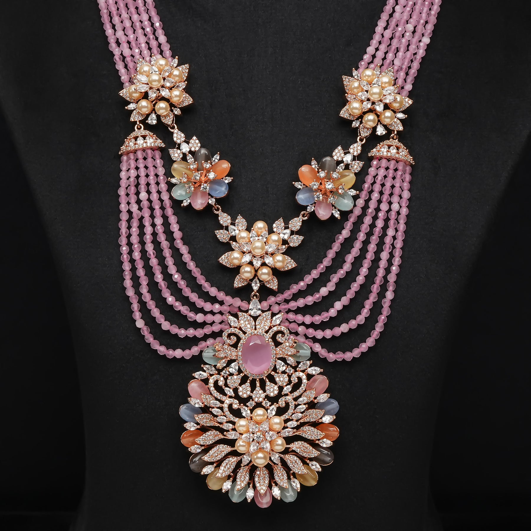 This handcrafted beads necklace set features sparkling real CZ stones arranged in multiple bead strands, creating a unique and elegant accessory. Each piece is designed with expert craftsmanship, ensuring a one-of-a-kind design that adds refined sophistication to any outfit. Perfect for those who appreciate distinct, high-quality jewelry.
