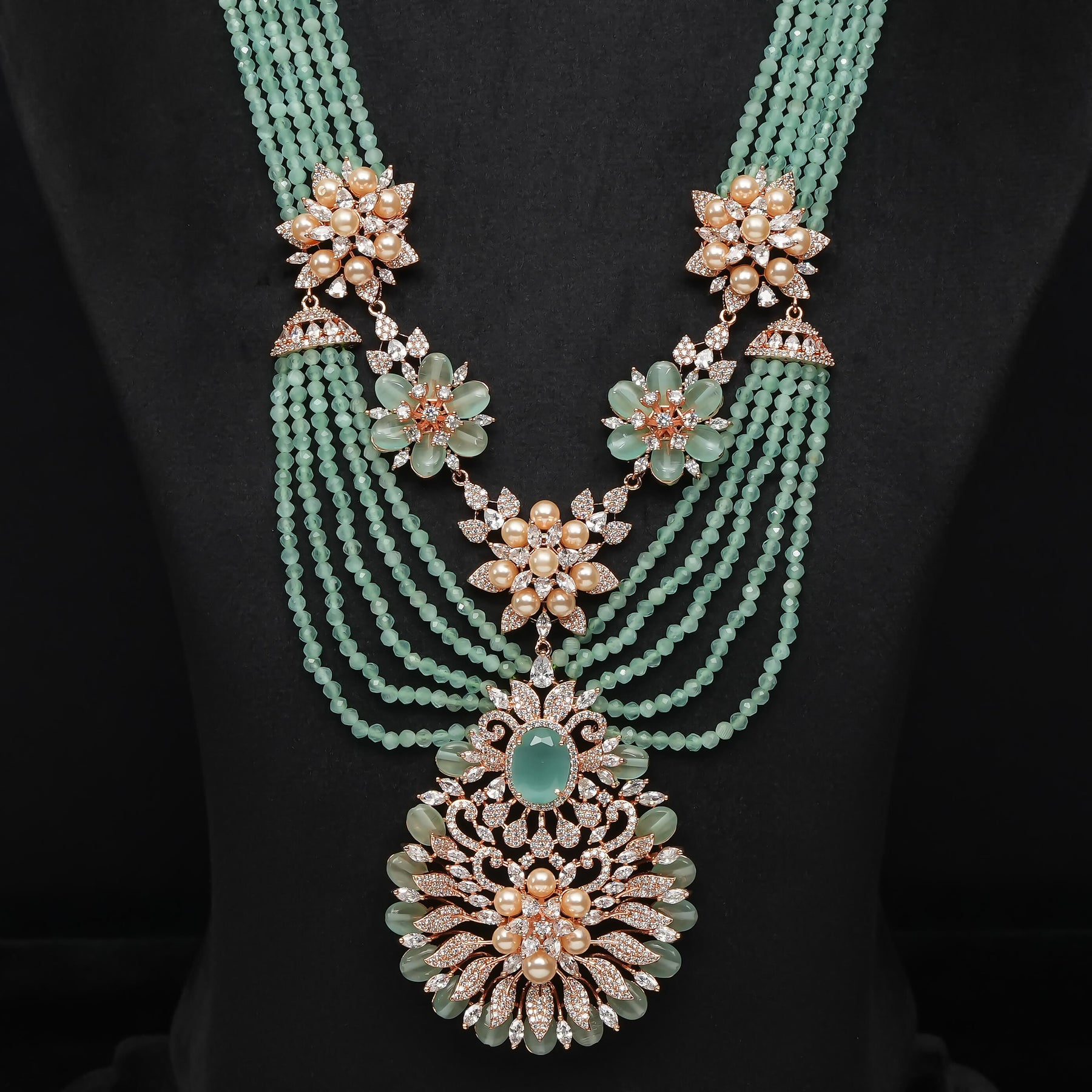 This handcrafted necklace set features multi-strand crystal beads accented with genuine cubic zirconia stones, ensuring brilliance and durability. Each piece is uniquely designed, offering a one-of-a-kind accessory that combines expert craftsmanship with timeless elegance, perfect for enhancing any outfit with refined sparkle.