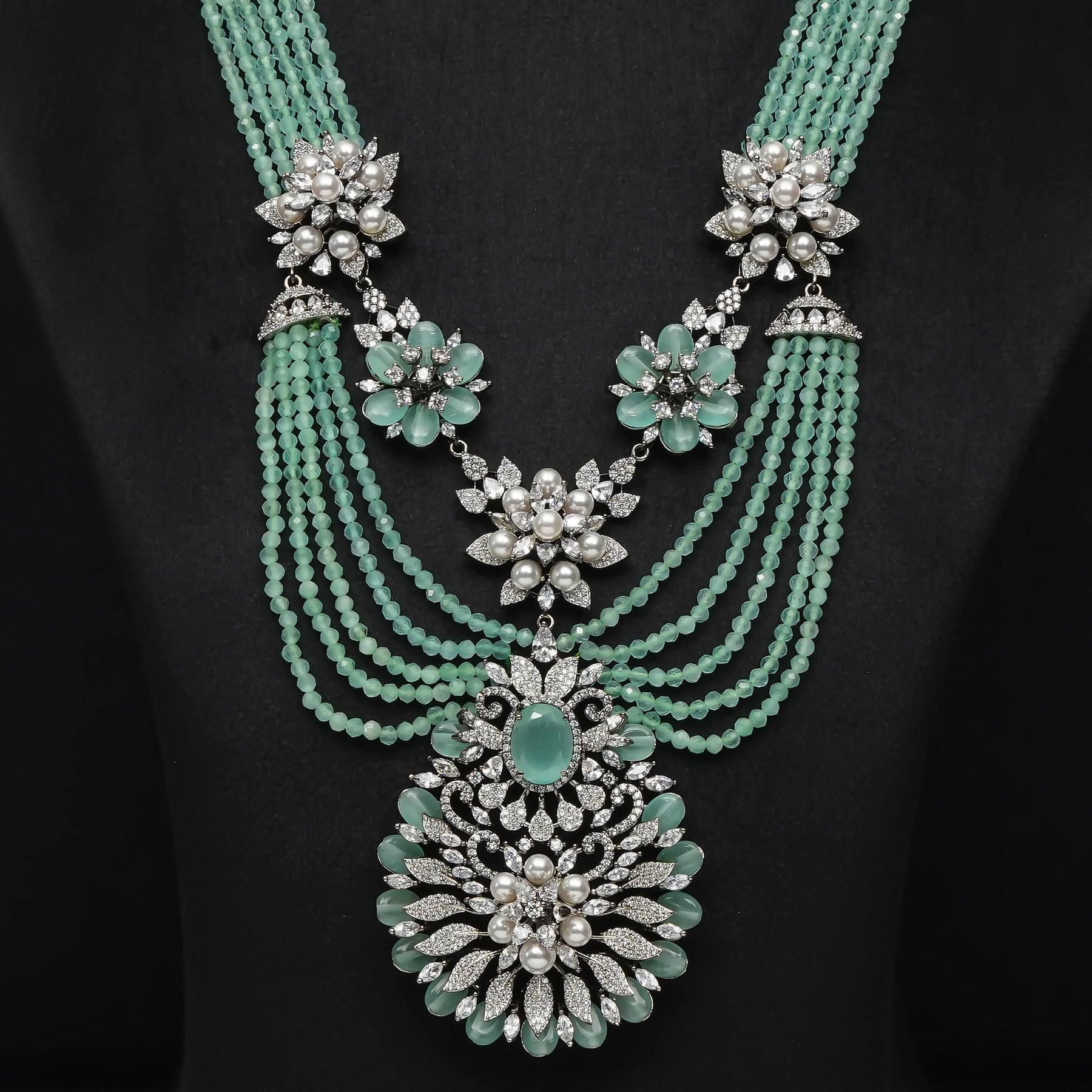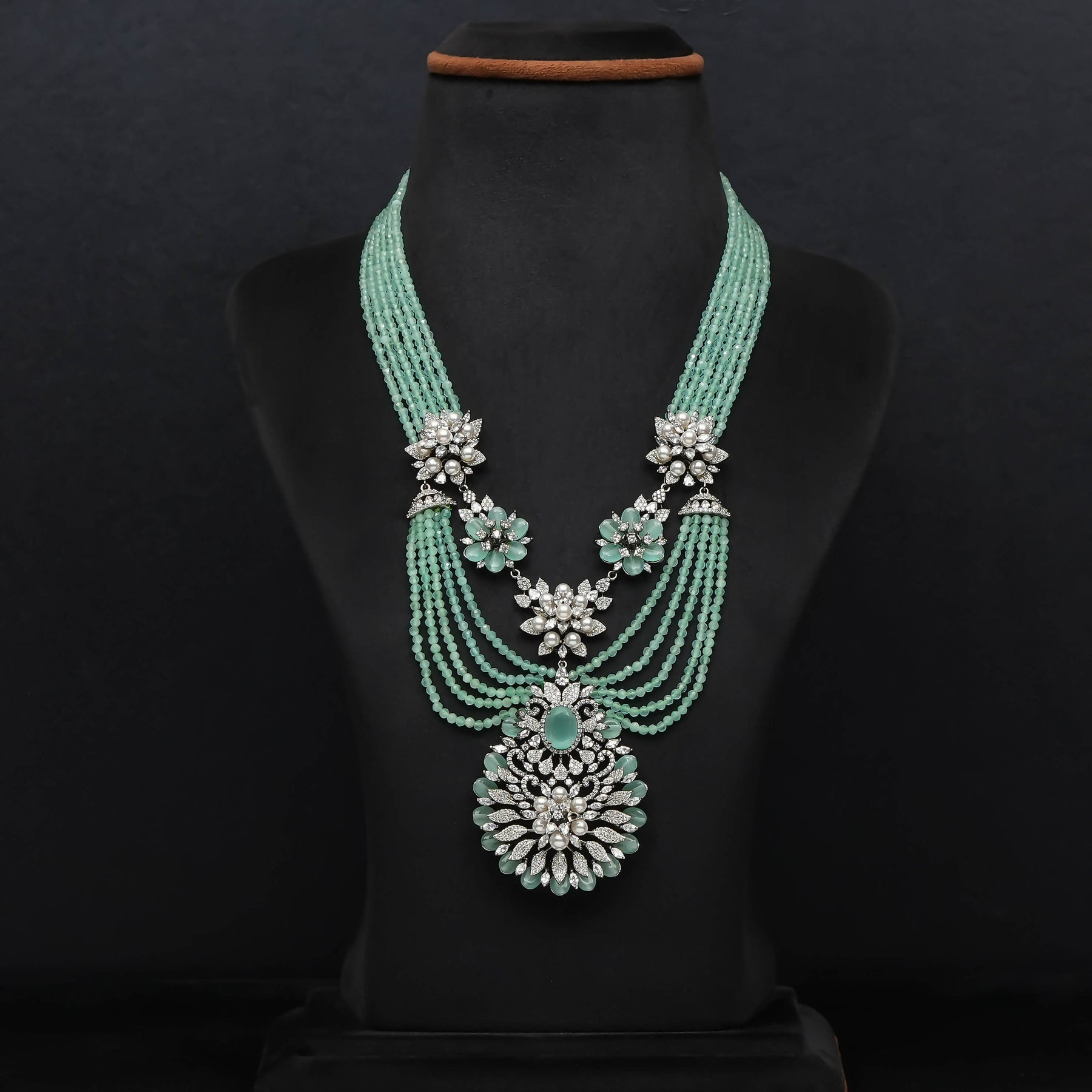 This handcrafted crystal bead necklace set features real CZ stones intricately arranged across multiple strands, creating a distinctive layered look. Each piece showcases a one-of-a-kind design that combines elegance with expert craftsmanship, providing a unique accessory perfect for elevating any outfit.