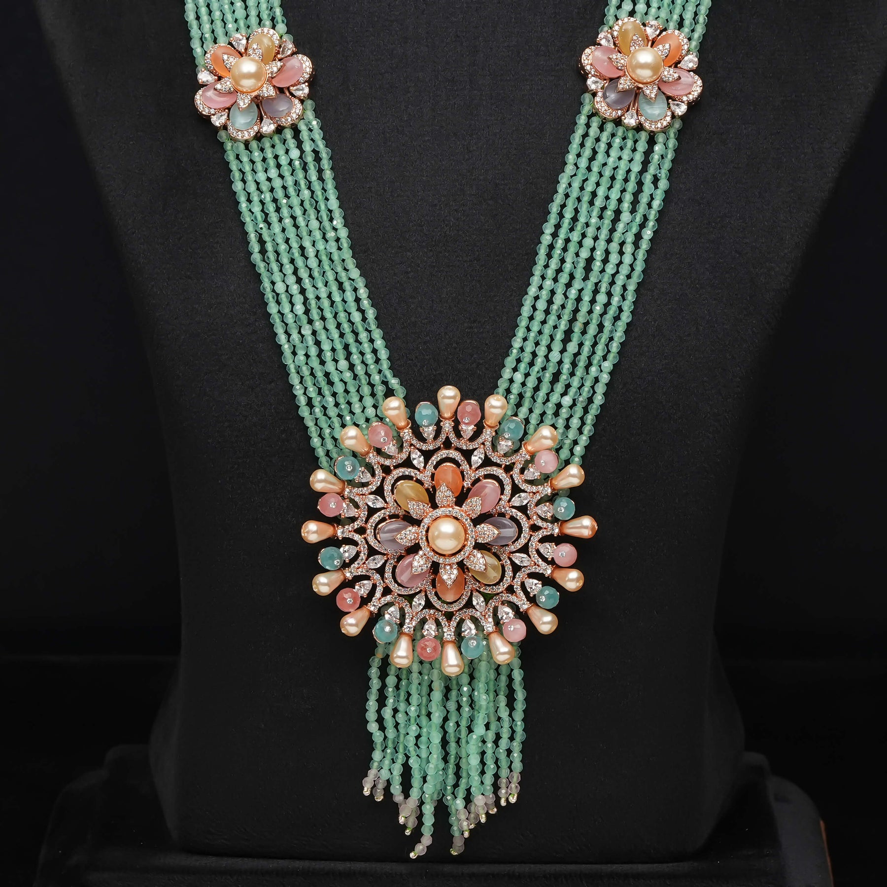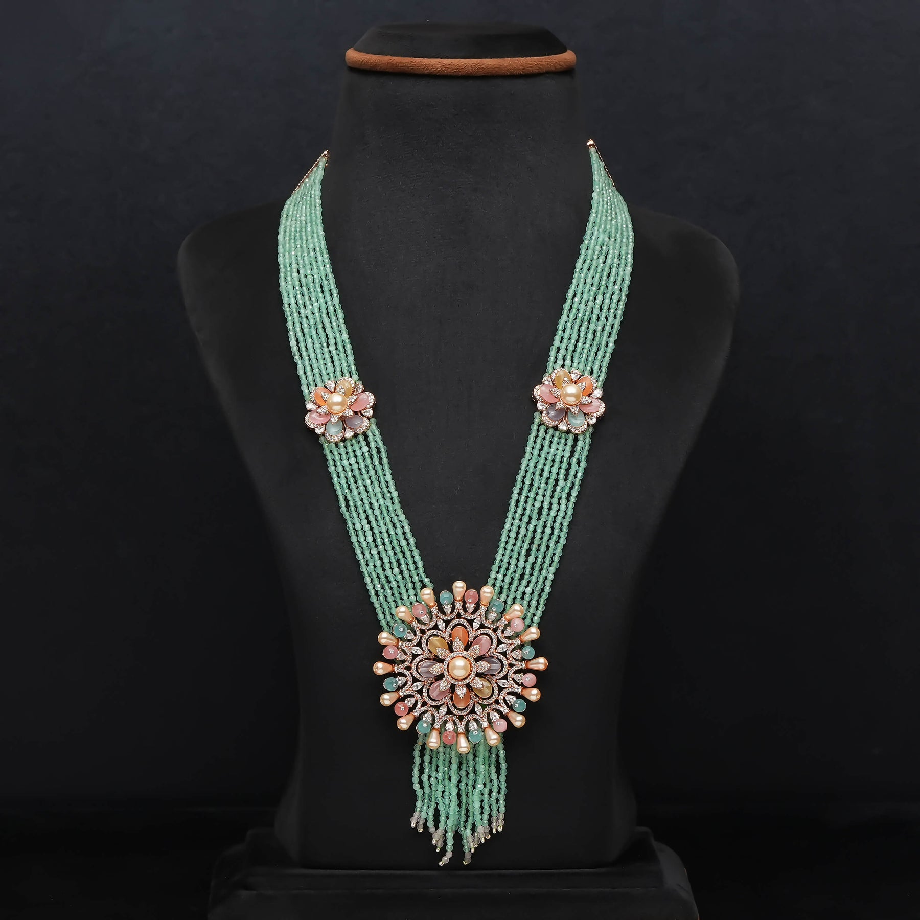 This handcrafted beads necklace set features genuine CZ stones expertly arranged in multi-strand designs. Each piece is uniquely crafted, offering a one-of-a-kind style that enhances any ensemble with subtle sparkle and refined elegance. Perfect for those seeking distinctive, high-quality jewelry with meticulous attention to detail.