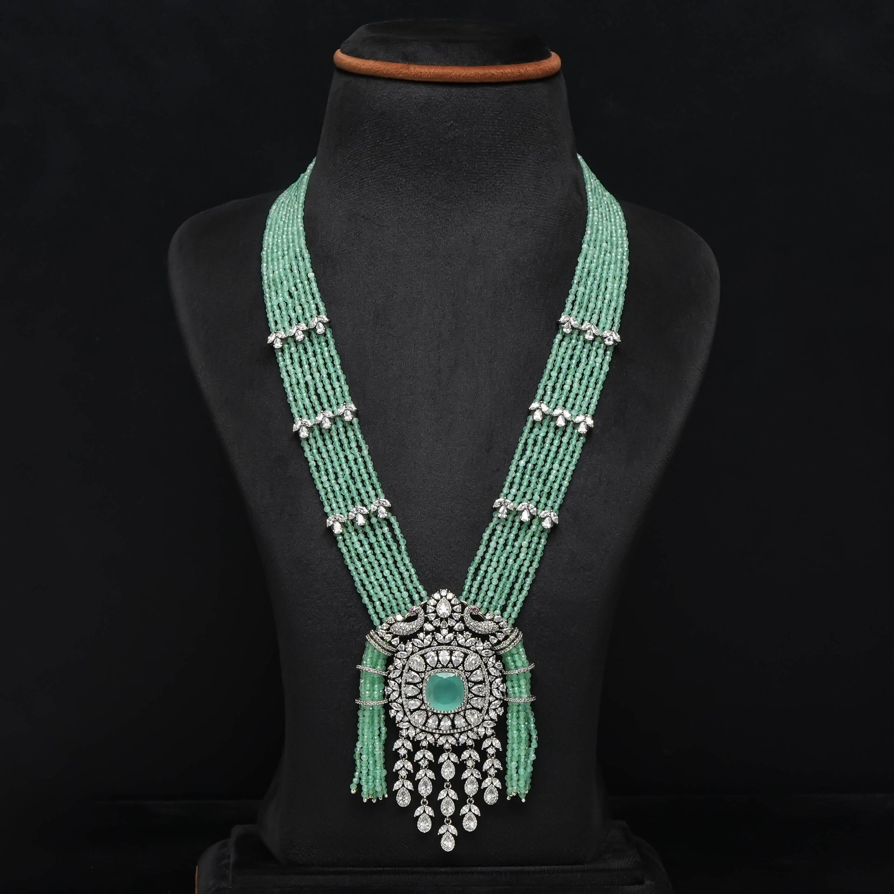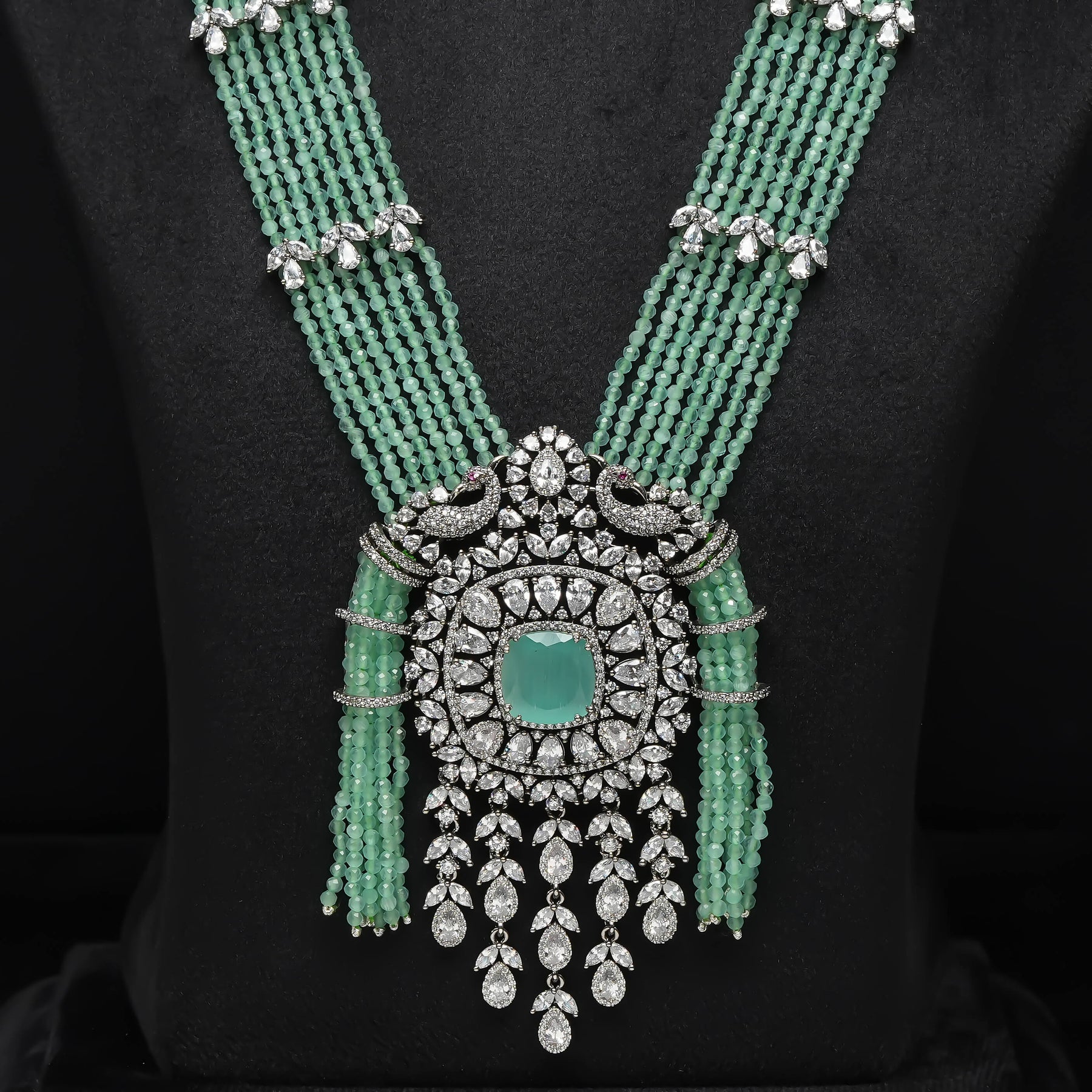 This handcrafted beads necklace set features multiple strands adorned with real CZ stones, offering a unique sparkle and sophisticated appeal. Each piece is meticulously crafted to create a one-of-a-kind design that adds elegance and refinement to any outfit. Perfect for those who appreciate expert craftsmanship and distinctive jewelry.