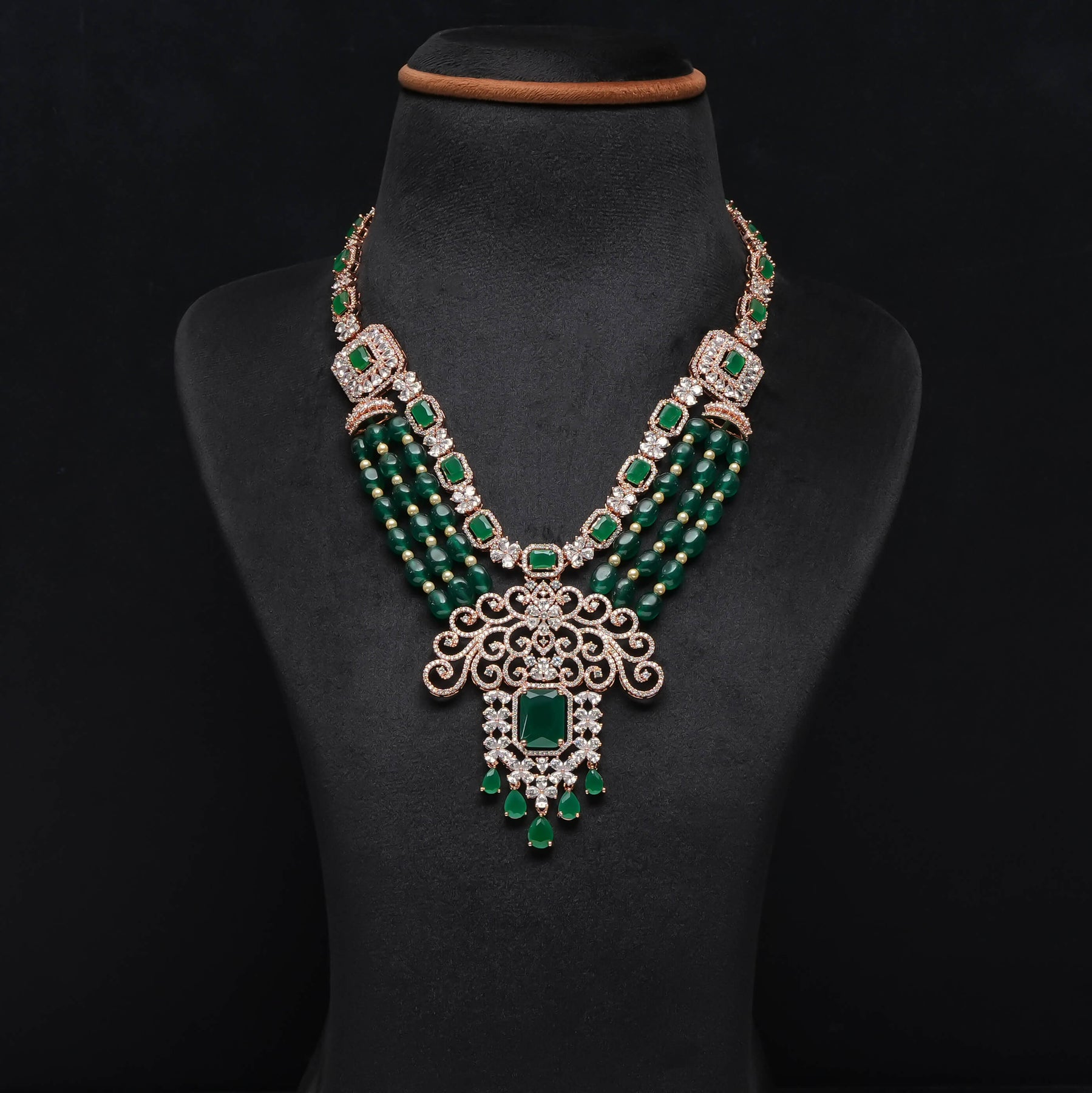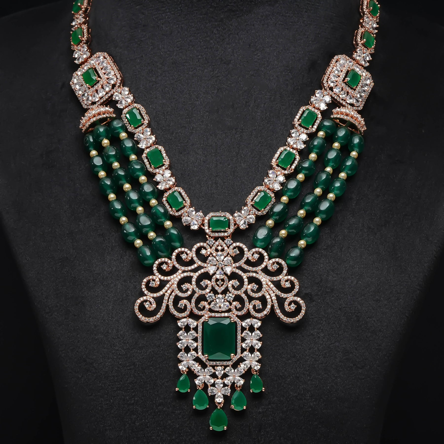 This handcrafted bead necklace set features real cubic zirconia stones, expertly strung across multiple strands for a rich, textured look. Each piece is a unique creation, showcasing an exclusive design that combines elegance with artisanal craftsmanship. Perfect for those seeking a distinctive accessory with sparkle and sophistication.
