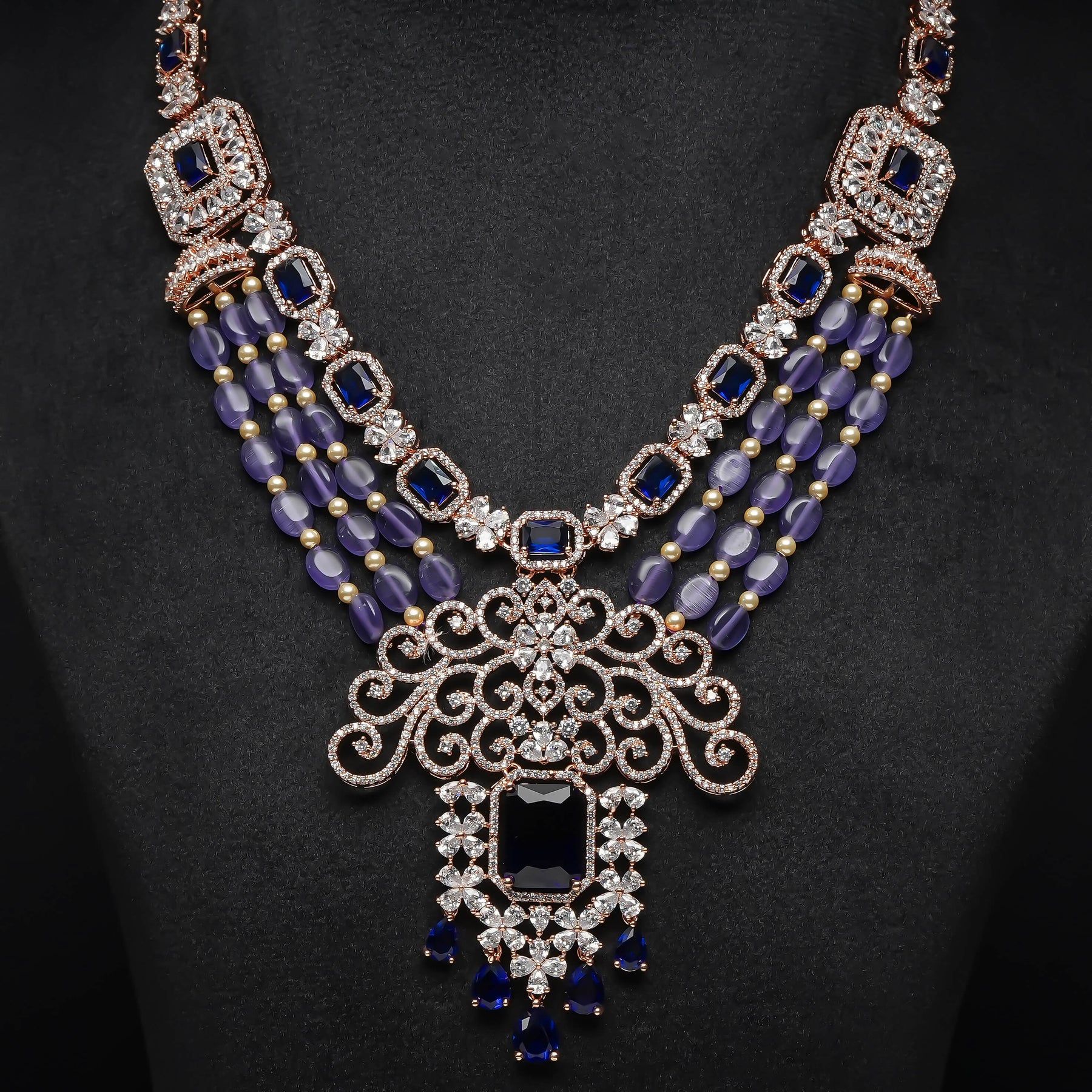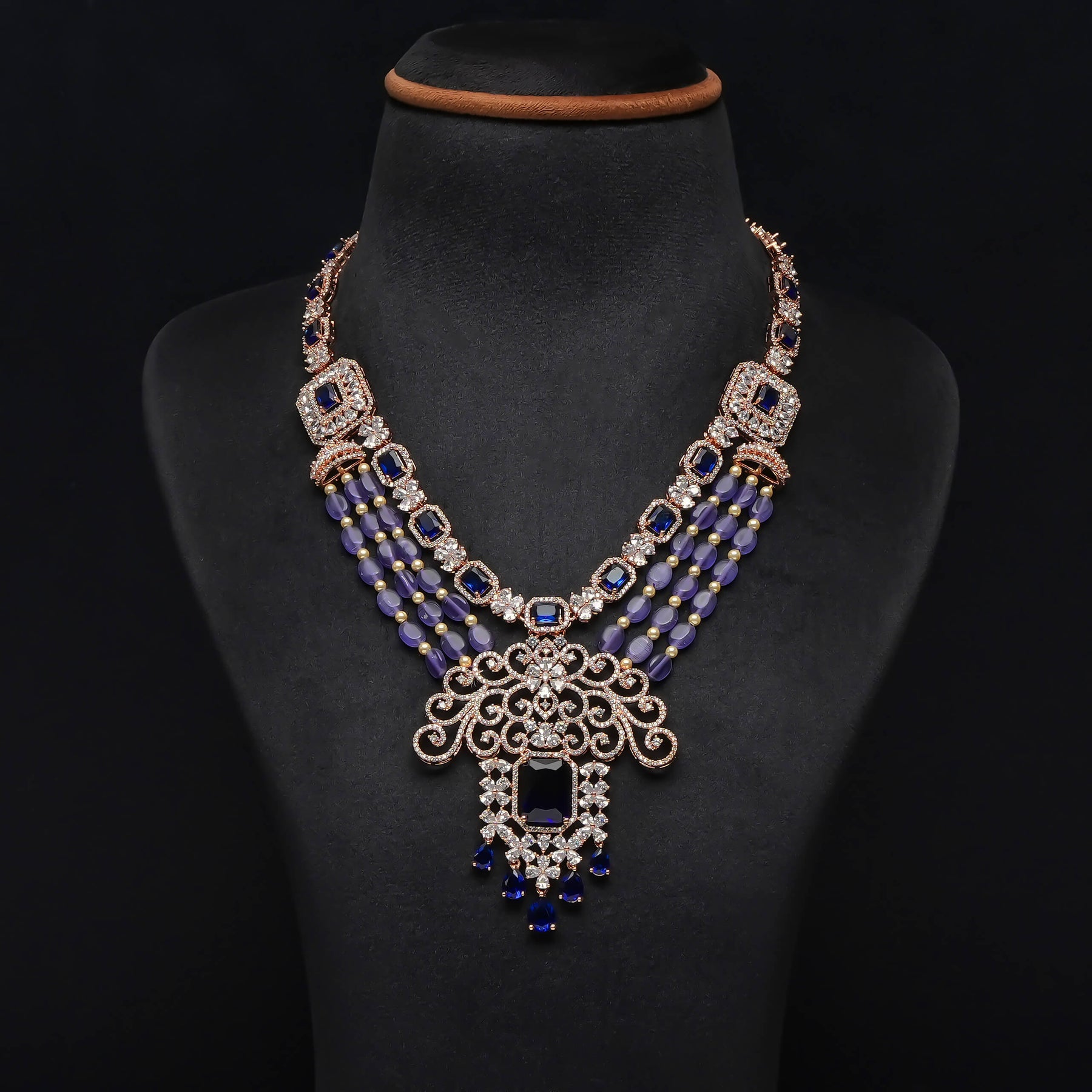 This handcrafted beads necklace set features real cubic zirconia stones elegantly incorporated into multiple strands for a layered look. Each piece is uniquely designed, offering an exclusive accessory that reflects expert craftsmanship and sophisticated style. Perfect for elevating any outfit with its distinctive charm.
