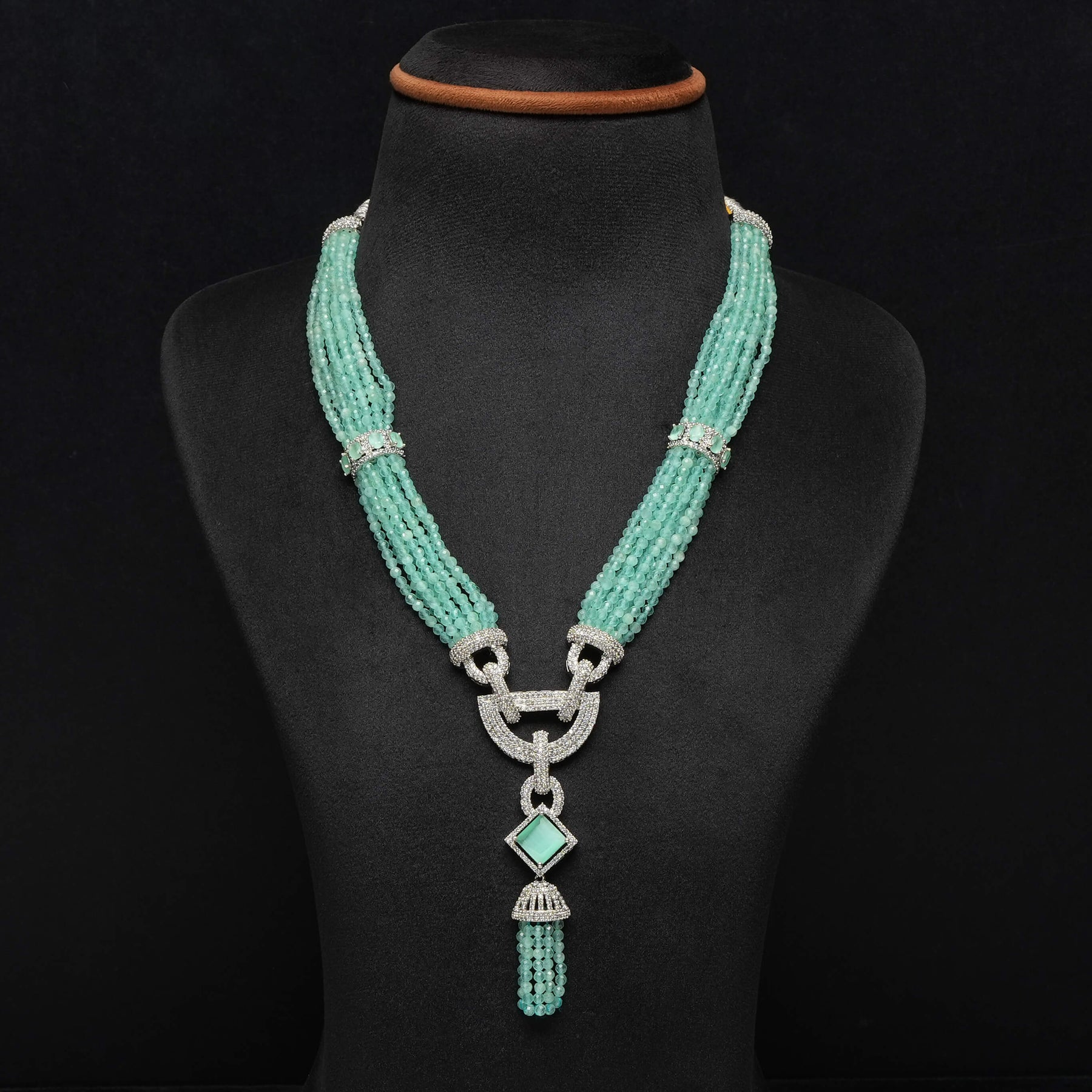This handcrafted beads necklace set features genuine cubic zirconia stones expertly arranged in multi-strand designs. Each piece showcases meticulous craftsmanship, resulting in a unique accessory that complements both formal and casual attire. Its one-of-a-kind style makes it a standout addition to any jewelry collection.