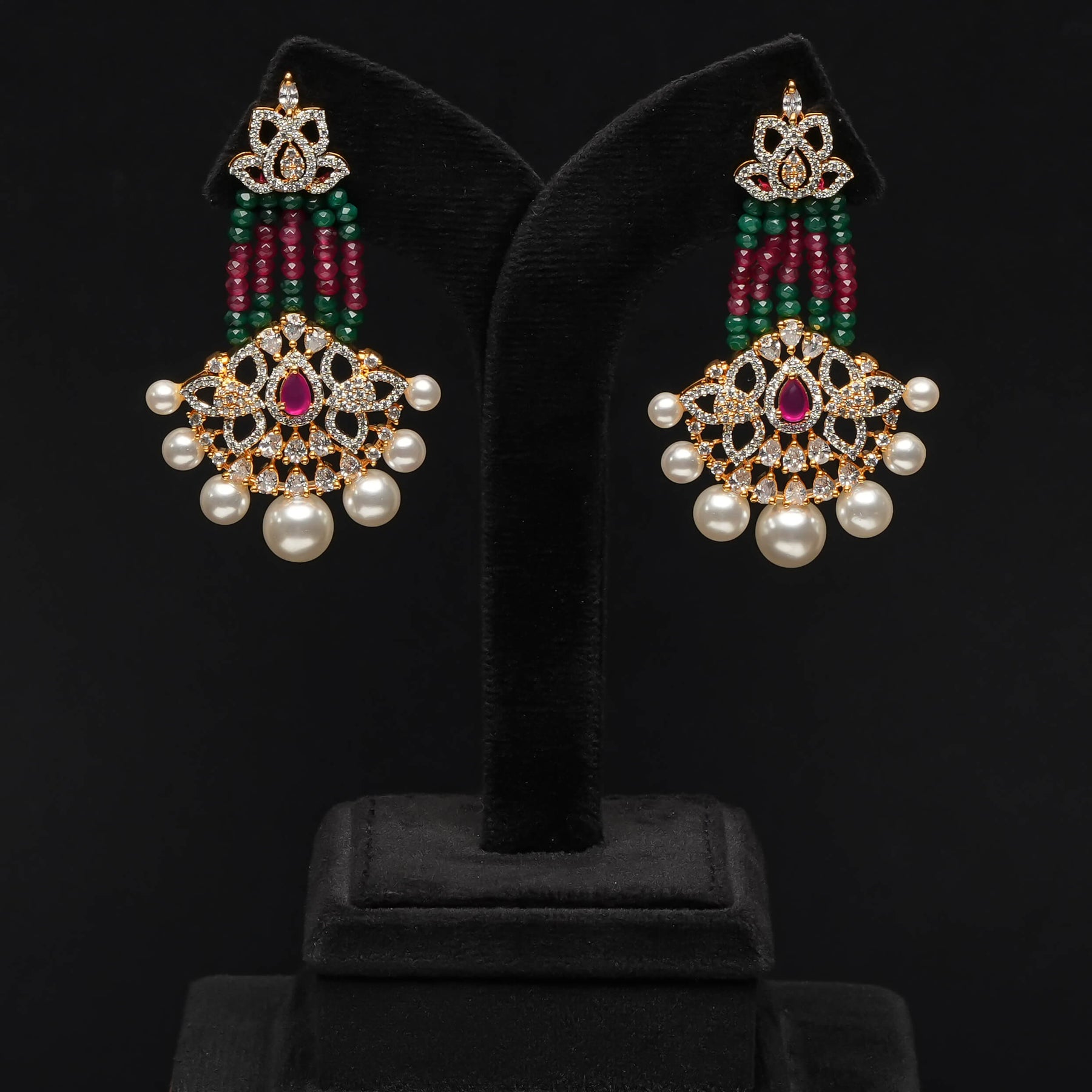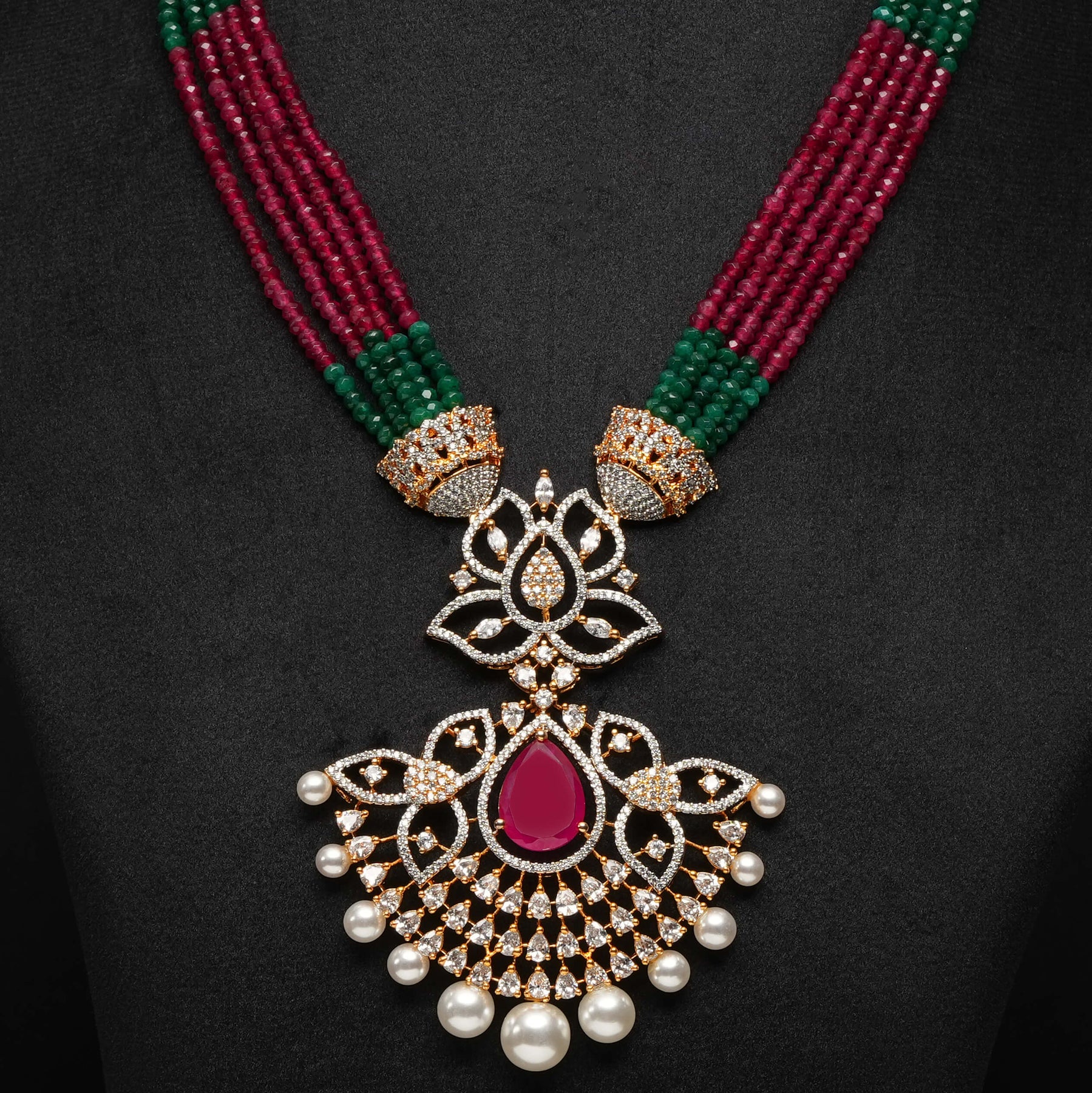 Elevate your ensemble with this expertly handcrafted beads necklace set featuring a unique locket in a shimmering diamond finish. Adorned with real cubic zirconia stones, its intricate design harmonizes beautifully with the matching earrings, offering a sophisticated and distinctive look. Each piece is a one-of-a-kind creation, meticulously crafted to add timeless elegance to your collection.