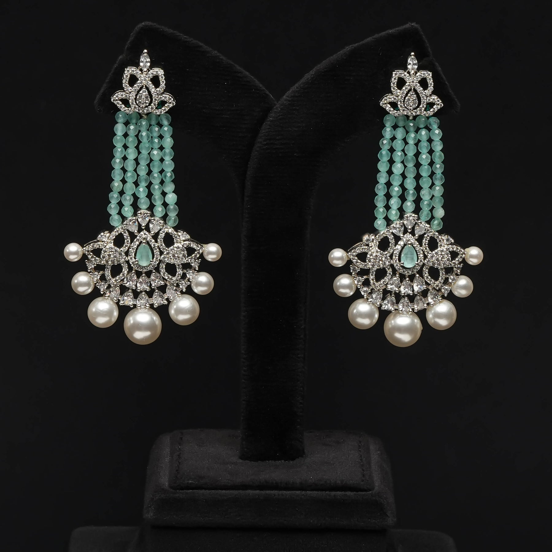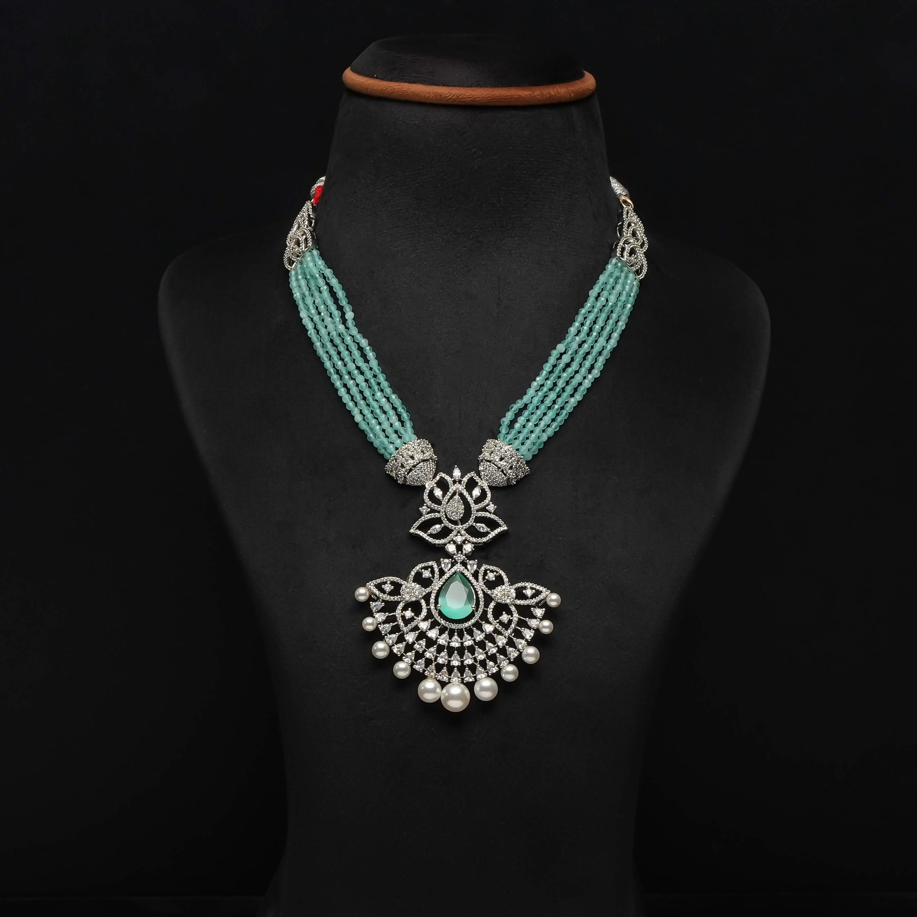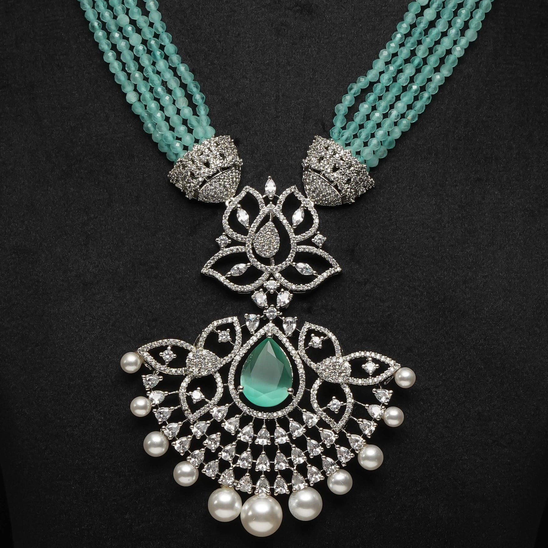 This exquisite beads necklace set features a white gold finish and is adorned with real CZ stones, showcasing intricate craftsmanship. Each piece is handcrafted to highlight its unique, one-of-a-kind design. The set includes a matching locket and earrings, perfectly complementing each other for a sophisticated and elegant look. Ideal for those seeking artistry and refinement in their jewelry collection.