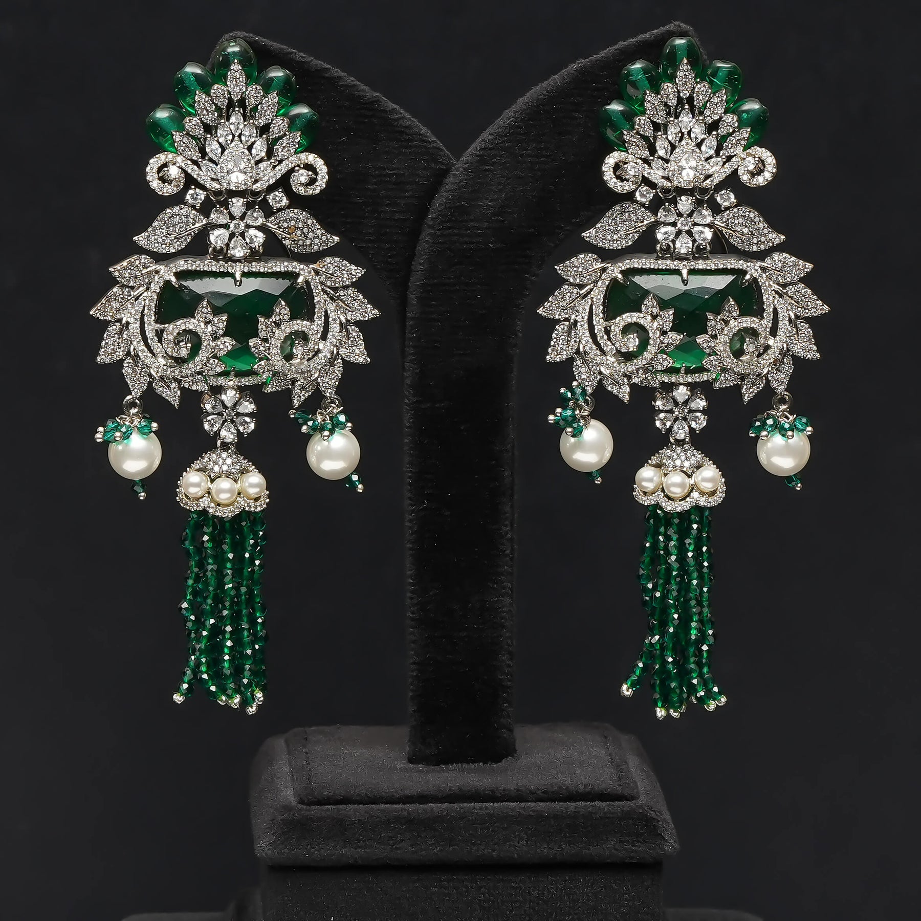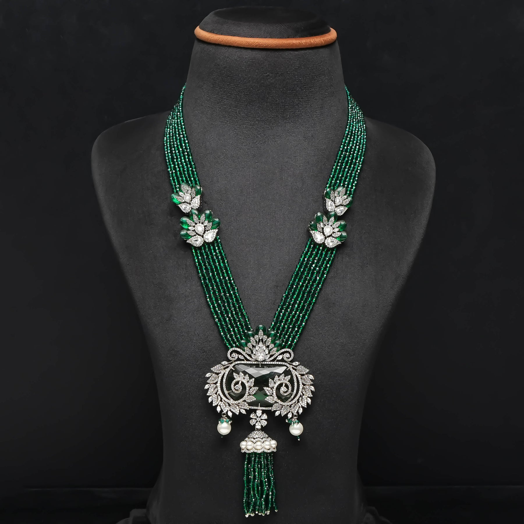 This handcrafted beads necklace set features a unique locket design finished in elegant white gold. Embedded with genuine CZ stones, it offers a delicate sparkle that enhances its intricate artistry. Paired with matching earrings, this one-of-a-kind ensemble blends craftsmanship with refined style, perfect for those who appreciate exclusive jewelry pieces.
