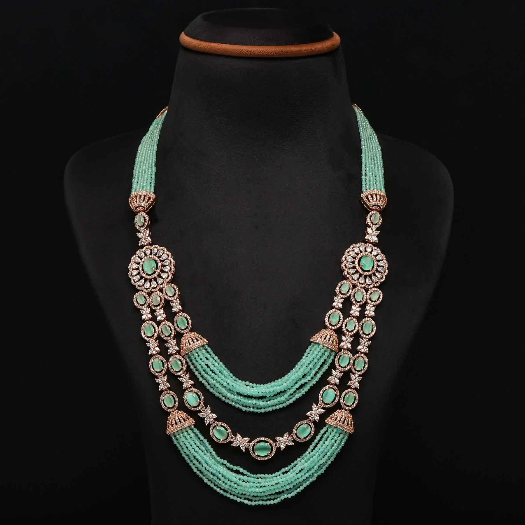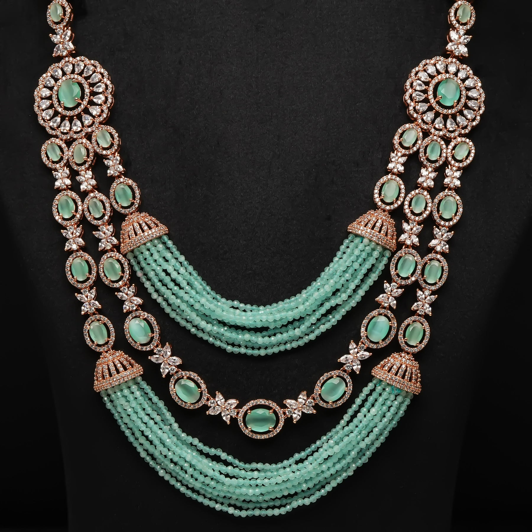 Elevate your elegance with this handcrafted Beads Necklace Set in a rose gold finish. Featuring genuine CZ stones, each piece showcases a unique, royal-inspired design that complements formal and traditional attire. Meticulously crafted for a one-of-a-kind appearance, this necklace offers timeless charm and enduring quality.