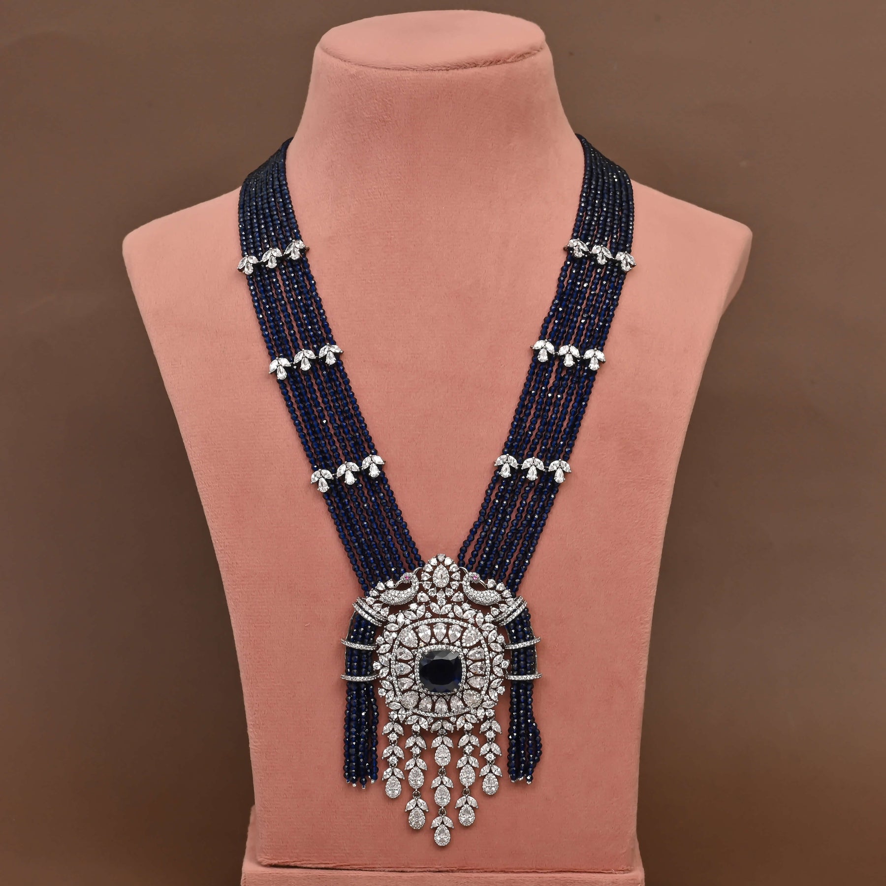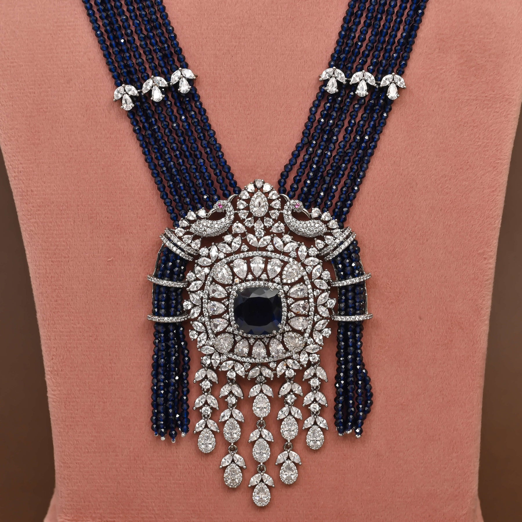This beads necklace set features a refined white gold finish that underscores its royal elegance. Expertly handcrafted and embellished with authentic cubic zirconia stones, it showcases a unique design that stands apart. Combining artistry and luxury, this necklace is an exceptional choice for those seeking a one-of-a-kind statement piece.