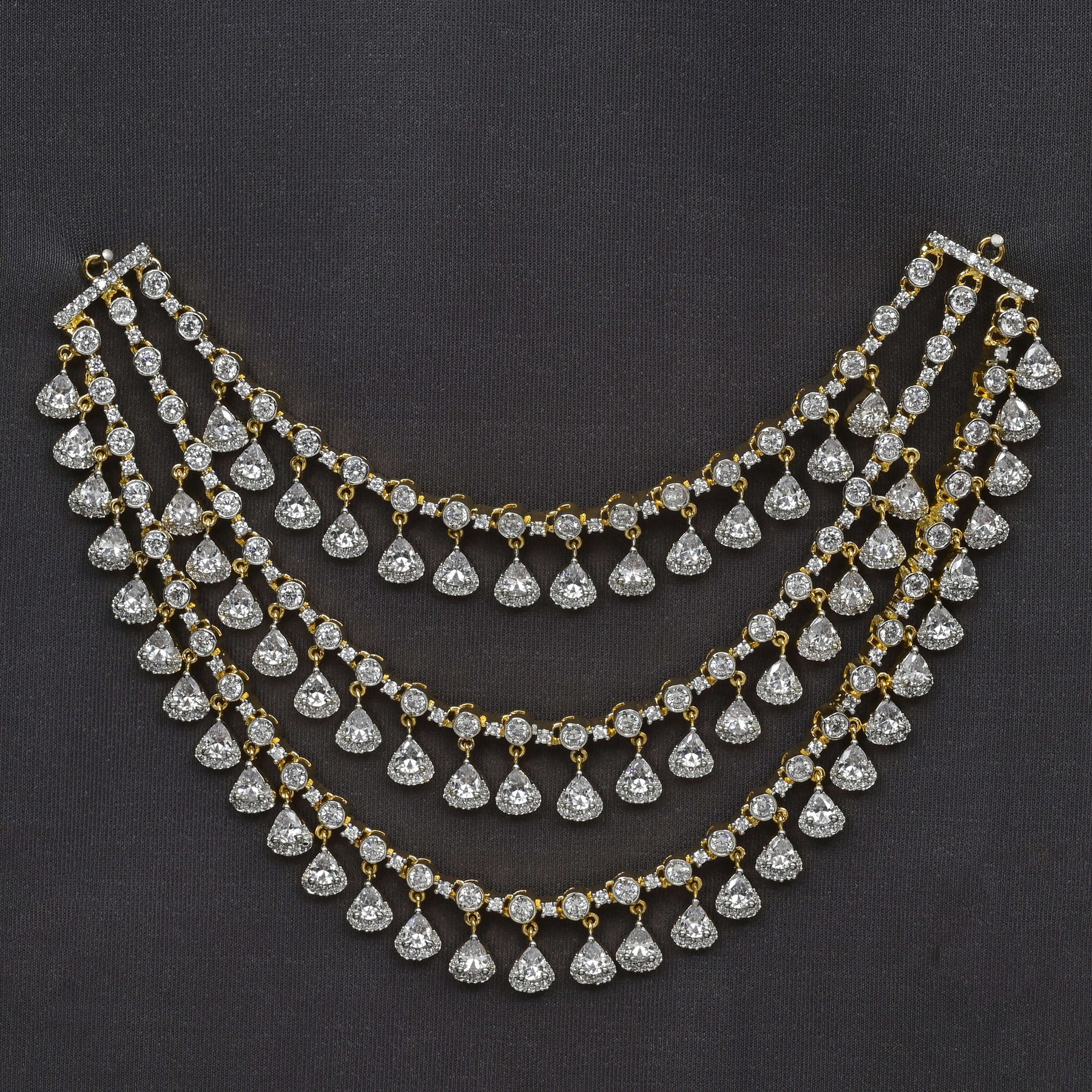 Elevate your traditional look with these CZ Diamond Finish Champasaralu, meticulously handcrafted using genuine CZ stones. Designed to mimic the brilliance of real diamonds, each piece showcases a unique, one-of-a-kind pattern that adds a distinctive charm. Perfect for those who appreciate expert craftsmanship and timeless elegance in their jewelry collection.
