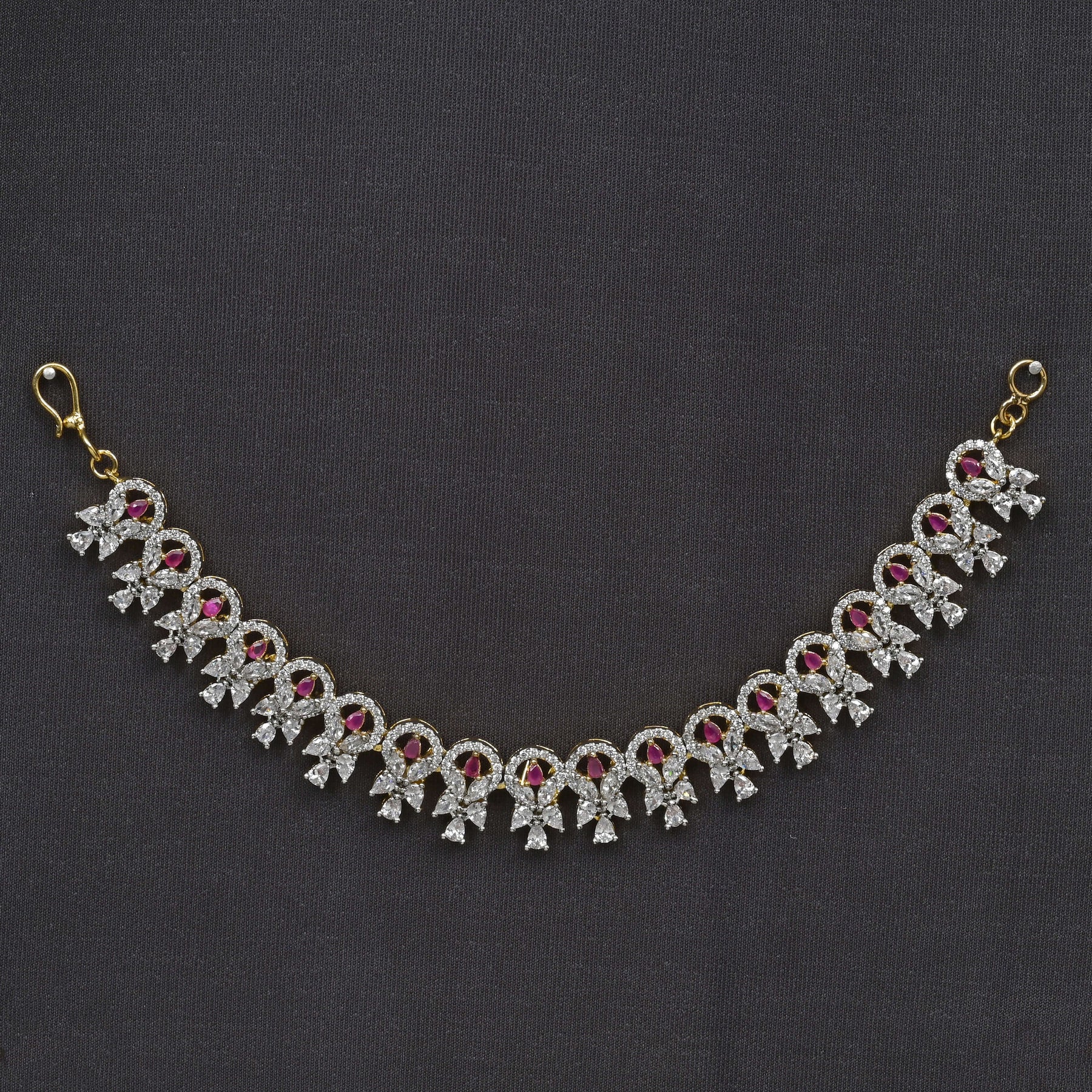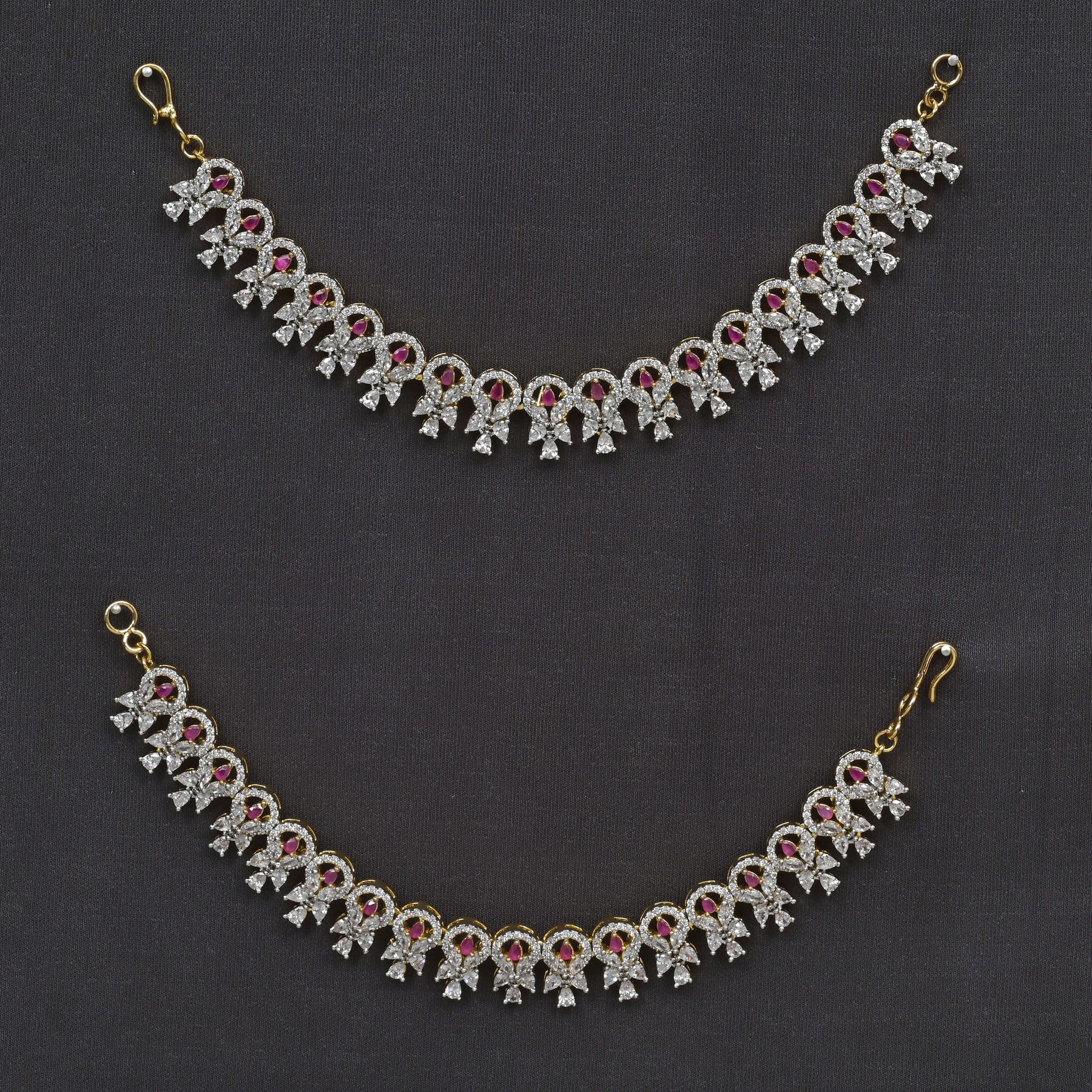 Experience the elegance of our CZ Diamond Finish Champasaralu, meticulously handcrafted using genuine cubic zirconia stones that emulate the brilliance of real diamonds. This exclusive piece showcases a one-of-a-kind design, combining expert craftsmanship with timeless beauty, perfect for those who appreciate sophistication with affordability.