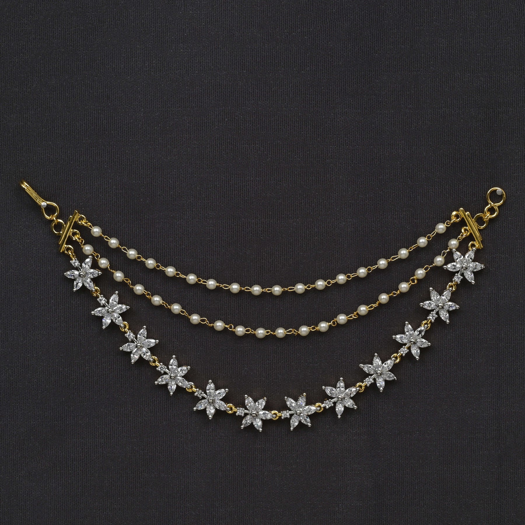 Discover the elegance of our CZ Diamond Finish Champasaralu, featuring authentic CZ stones that mimic the brilliance of real diamonds. Handcrafted with exquisite pearl strands, this unique design offers a one-of-a-kind statement piece that combines tradition with contemporary craftsmanship. Perfect for adding refined sparkle to any occasion.