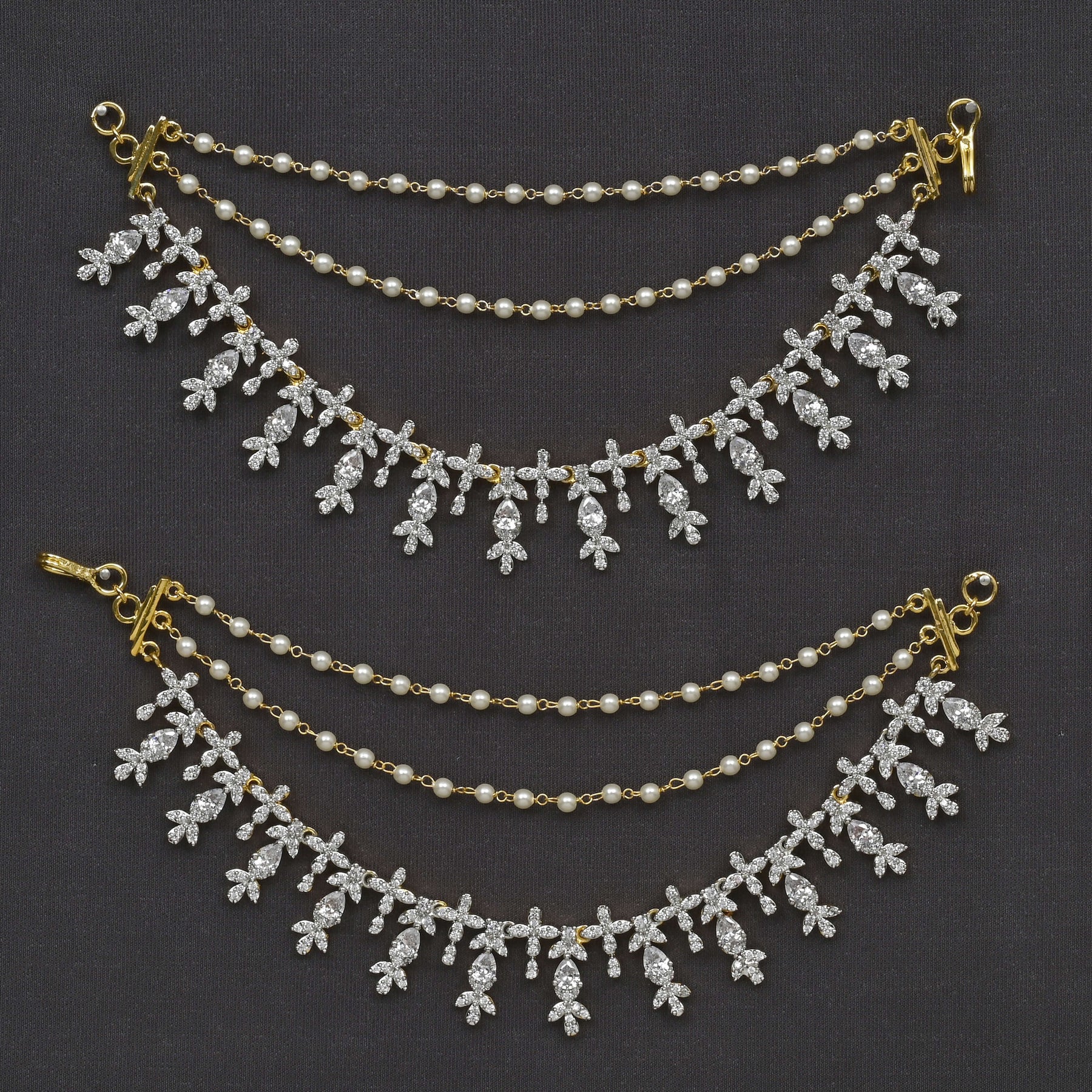 Experience the elegance of CZ Diamond Finish Champasaralu, crafted with genuine cubic zirconia stones that mimic the brilliance of real diamonds. Each piece features lustrous pearl strands, expertlyExperience elegance with the CZ Diamond Finish Champasaralu, featuring genuine cubic zirconia stones that mimic the brilliance of real diamonds. Handcrafted with precision, each piece showcases exquisite pearl strands combined with a unique, one-of-a-kind design, ensuring a sophisticated and timeless accessory for any occasion.