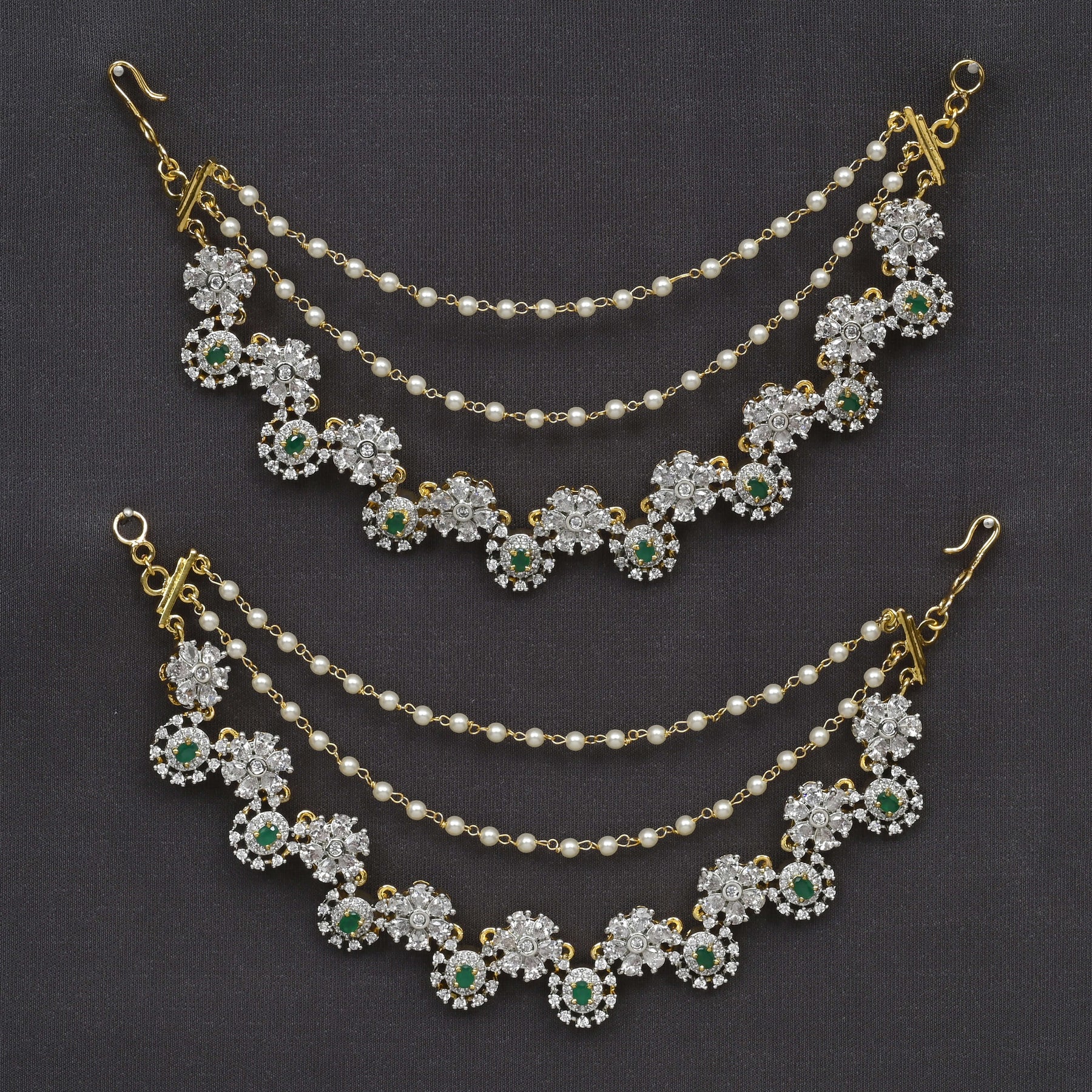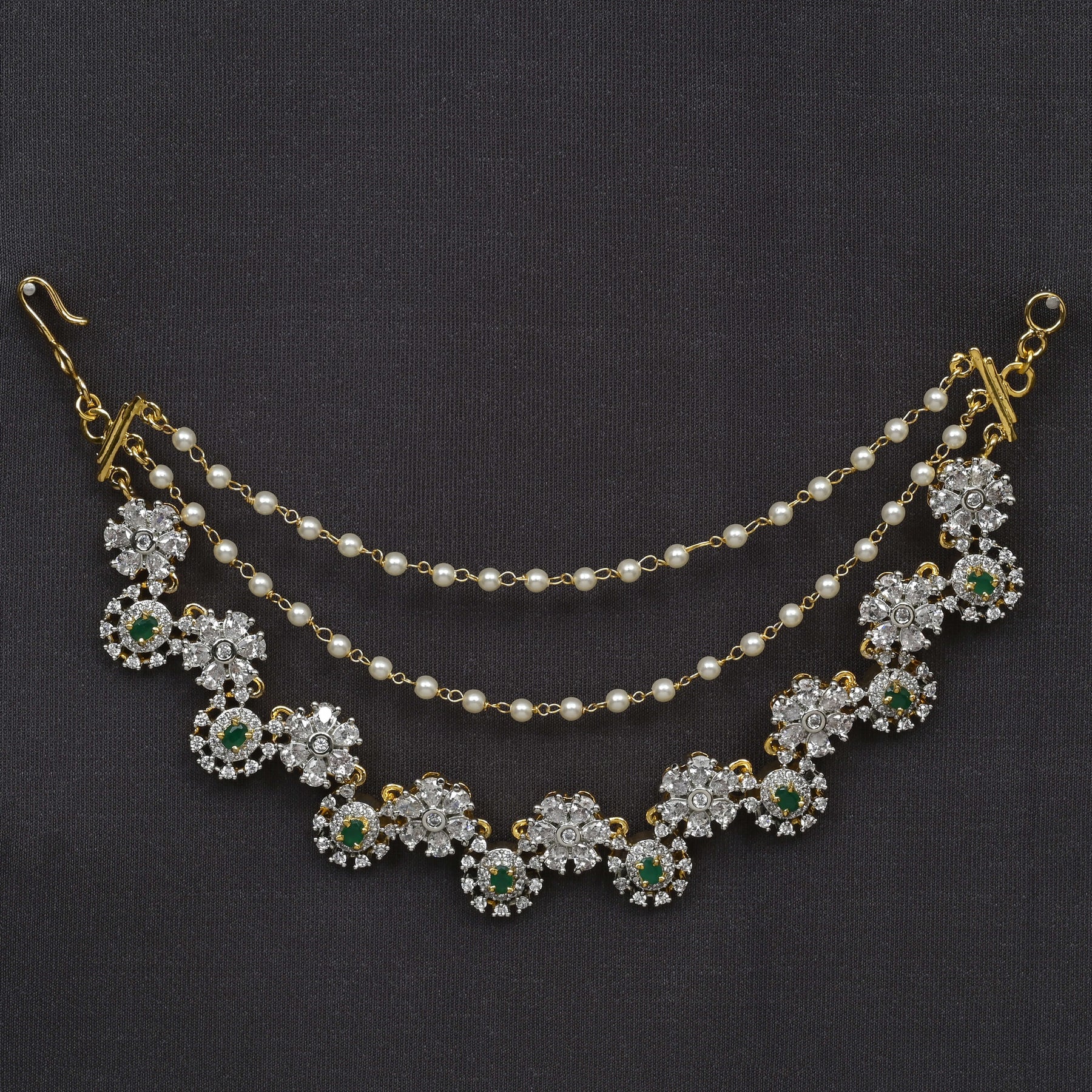 Elevate your traditional attire with the CZ Emerald Champasaralu, featuring authentic cubic zirconia stones that mimic the brilliance of real diamonds. Handcrafted to perfection, each piece showcases exquisite pearl strands complementing the unique, one-of-a-kind design. This jewelry combines classic elegance with expert craftsmanship, offering a stunning diamond-like sparkle for a refined and timeless look.
