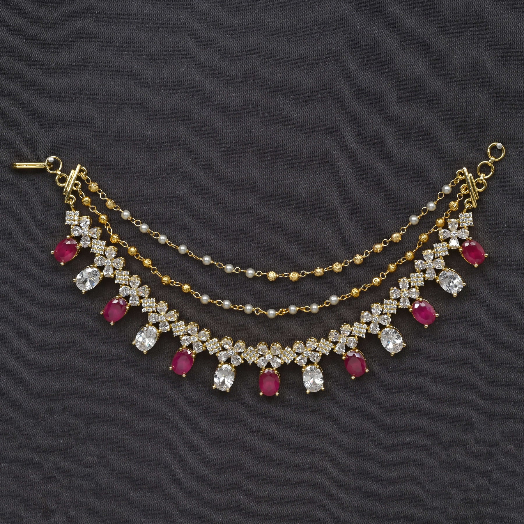 Experience the elegance of CZ Ruby Champasaralu, featuring real CZ stones that mimic the brilliance of diamonds. This handcrafted piece combines semi-precious ruby stones and delicate pearl strands, creating a unique design that stands out. Perfect for those seeking a one-of-a-kind accessory with the sparkle and sophistication of fine jewelry.