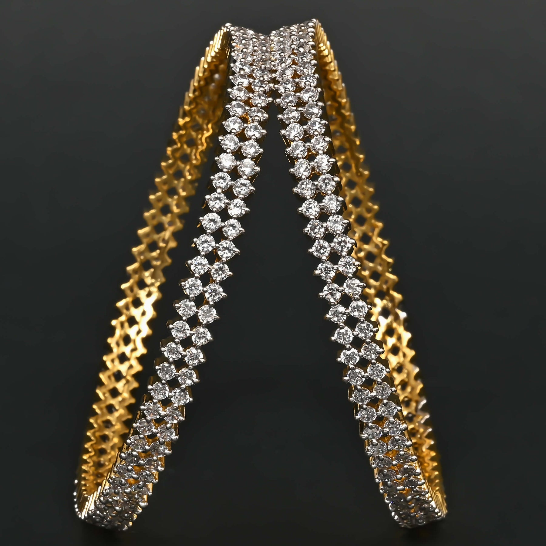 Experience elegance with these CZ Diamond Finish Bangles, meticulously handcrafted and featuring genuine CZ stones that sparkle like diamonds. Designed with a convenient side screw, they offer effortless wear and removal. Each piece is unique, showcasing one-of-a-kind artistry that combines comfort with distinctive style. Perfect for adding a refined touch to any ensemble.