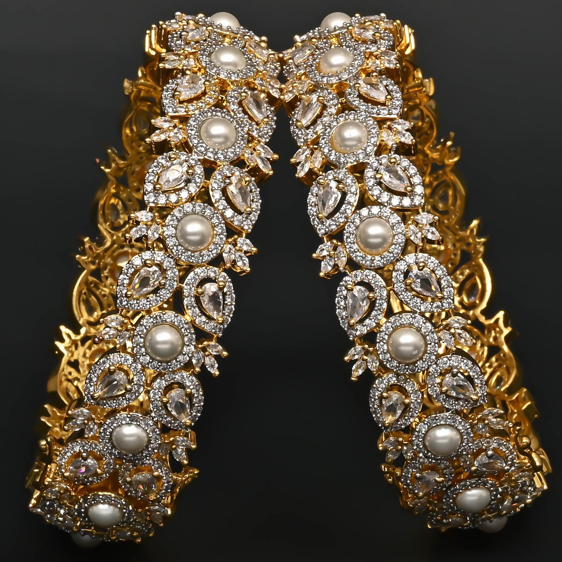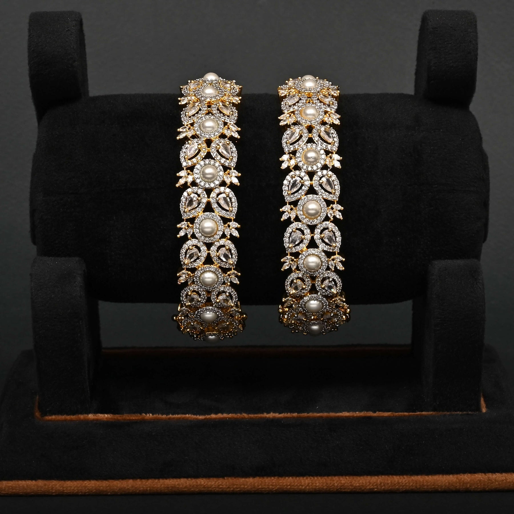 Crafted with precision, these CZ Diamond Finish Bangles feature genuine CZ stones and elegant pearl accents, creating a stunning diamond-like sparkle. Designed for ease, the side screw mechanism ensures comfortable wear while maintaining a secure fit. Each bangle is handcrafted, making every piece a unique expression of exquisite artistry. Ideal for those seeking refined sophistication in jewelry with lasting brilliance.