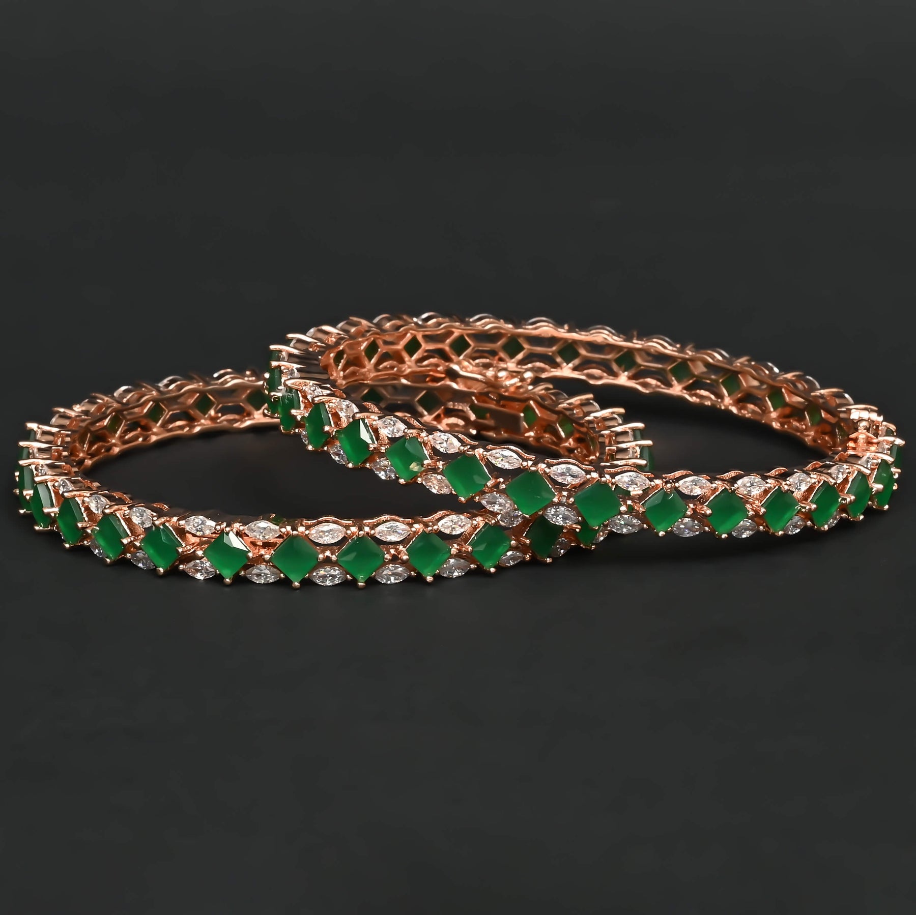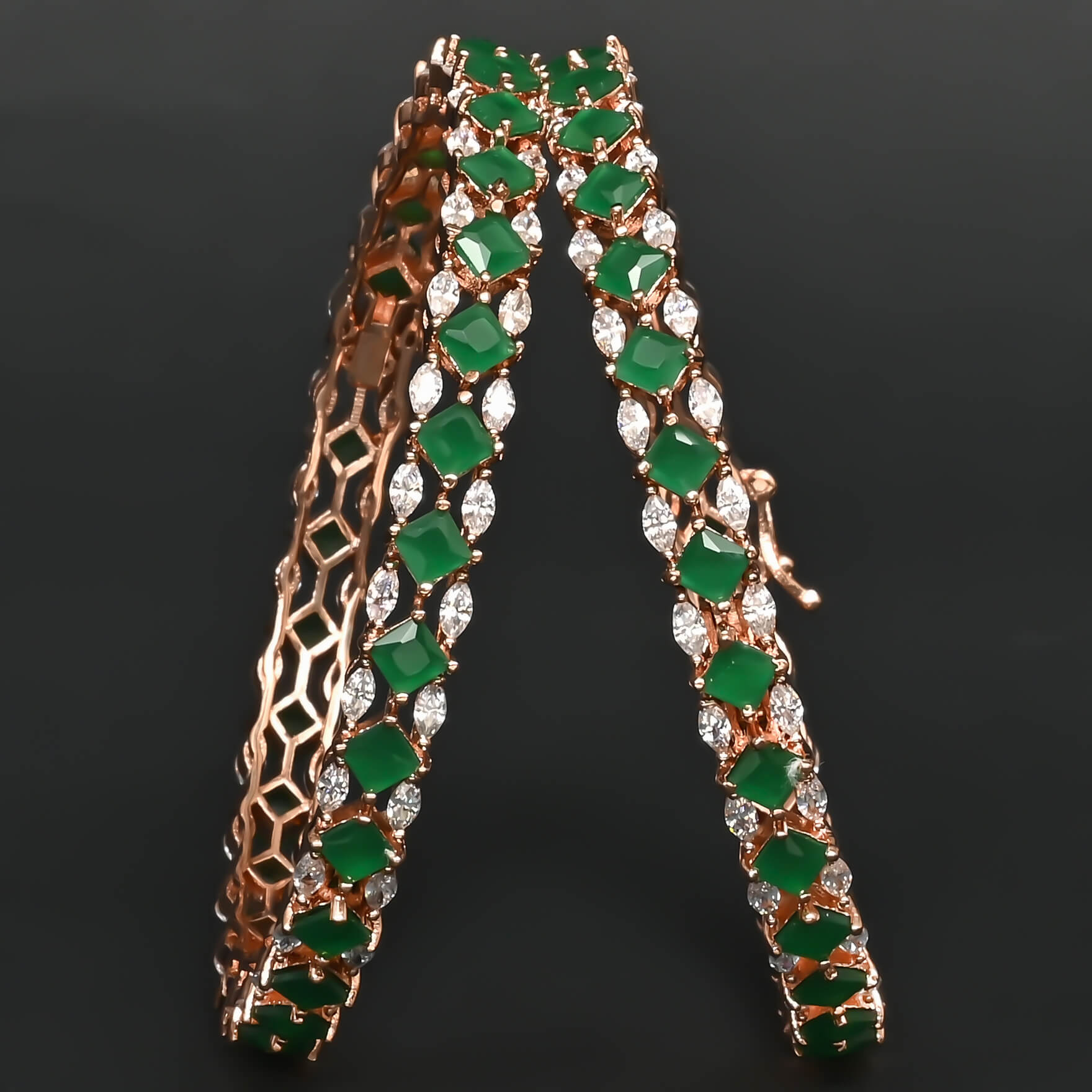 Elevate your collection with these expertly handcrafted CZ Emerald Bangles, featuring a rose gold finish that exudes sophistication. Adorned with genuine cubic zirconia stones alongside semi-precious emeralds, they offer a diamond-like brilliance with distinctive green accents. The innovative side screw design ensures effortless wear, combining elegance with practicality in a truly one-of-a-kind creation.