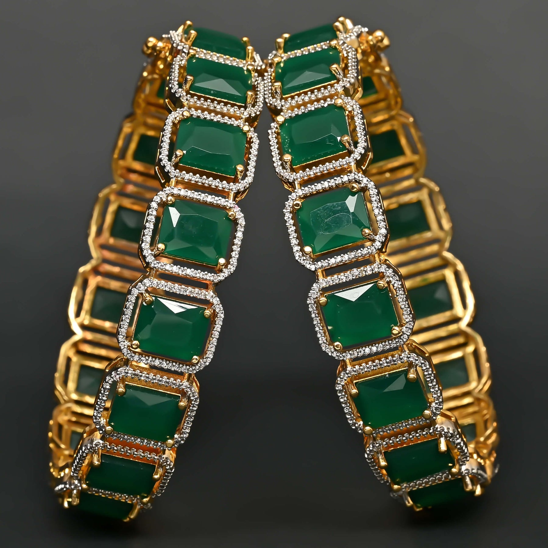 These CZ Emerald Bangles showcase a diamond-like finish with genuine cubic zirconia stones and semi-precious emerald accents, combining brilliance with a touch of color. Handcrafted with a unique design, each piece is distinct and refined. The side screw mechanism ensures easy and secure wear, offering both elegance and practicality for those seeking exceptional craftsmanship.