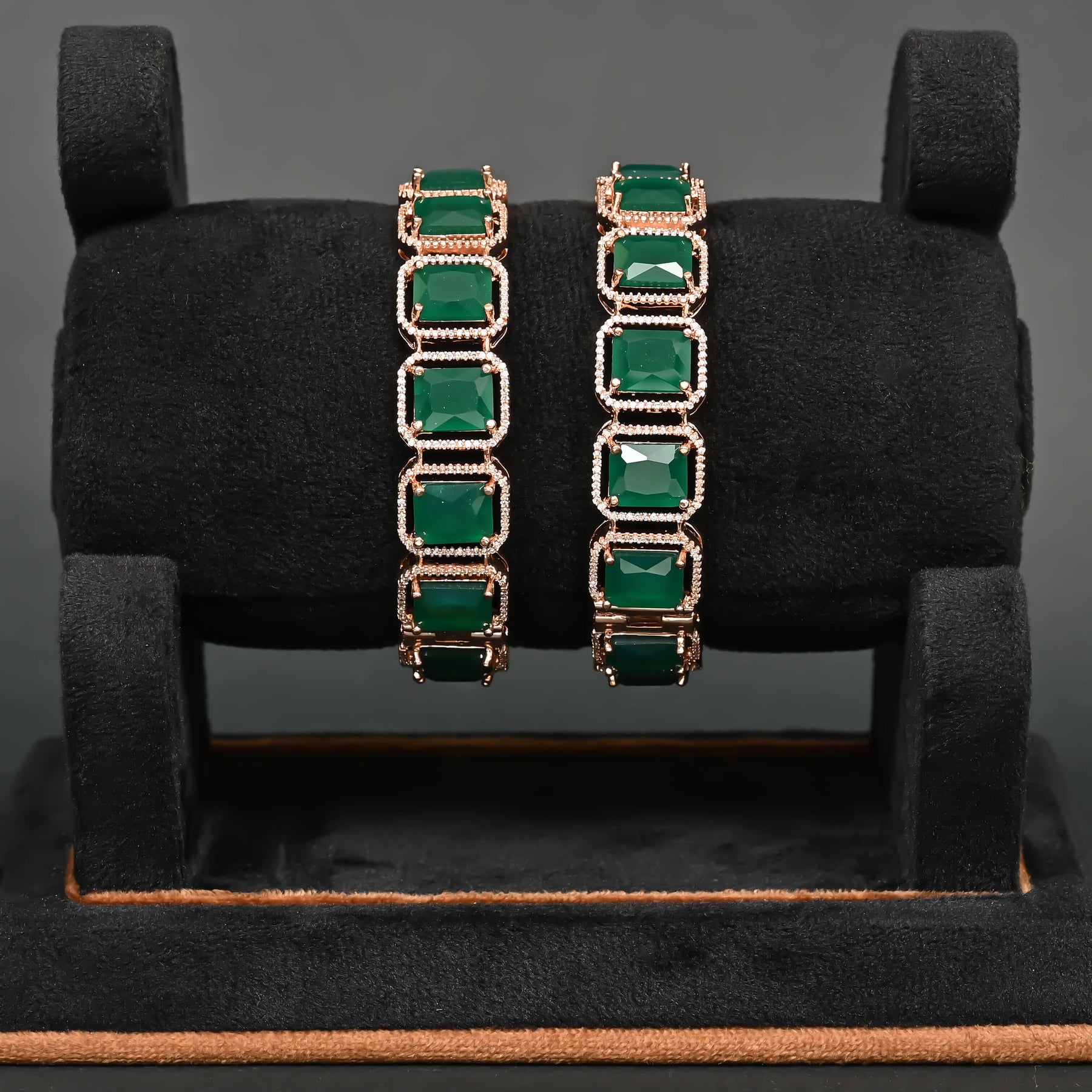 These CZ Emerald Bangles showcase a sophisticated blend of craftsmanship and elegance. Expertly handcrafted with a rose gold finish, they feature real CZ stones complemented by semi-precious emerald accents, creating a diamond-like sparkle. Designed for convenience, the side screw allows easy wear while ensuring a secure fit. Each bangle is a unique piece, reflecting an exclusive design tailored for refined taste.