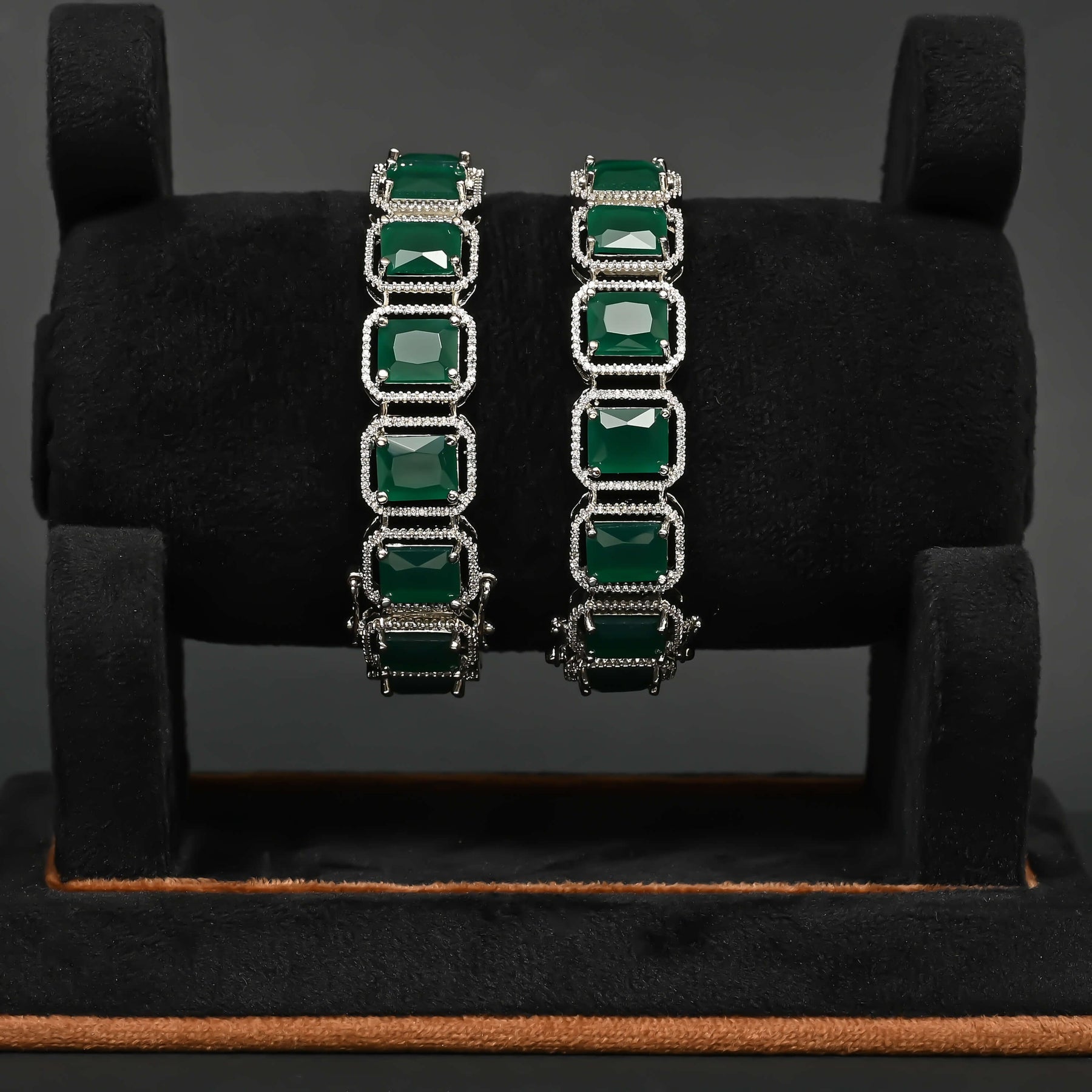 These CZ Emerald Bangles feature a white gold finish, showcasing genuine CZ stones that mimic the brilliance of diamonds. Highlighted by semi-precious emerald accents, their unique handcrafted design ensures an exclusive, one-of-a-kind accessory. The side screw mechanism allows for effortless wearing, combining elegance with practicality for a refined look.