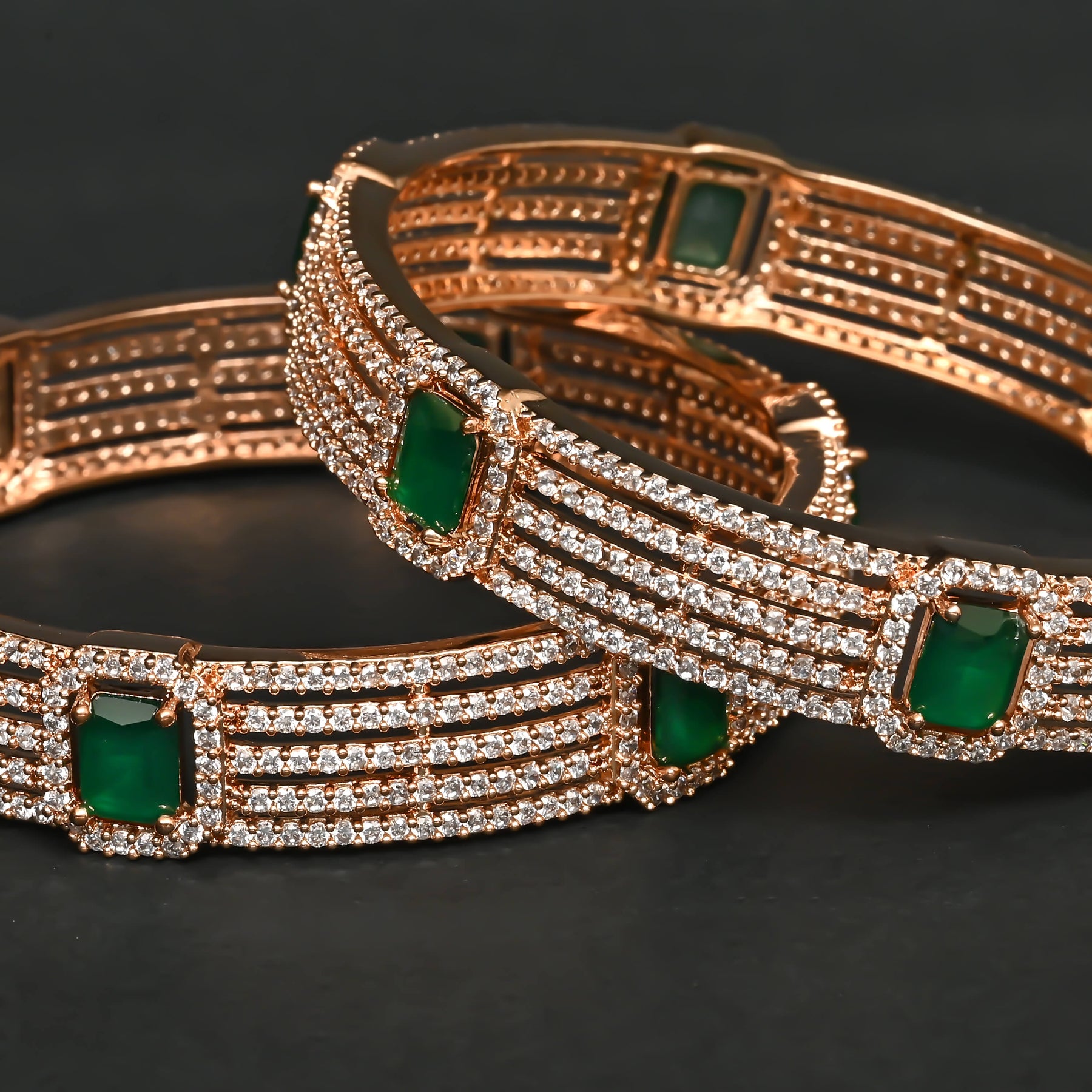 These CZ Emerald Bangles showcase a refined rose gold finish adorned with genuine cubic zirconia stones and semi-precious emerald accents. Handcrafted with meticulous attention to detail, each bangle features a unique design and a convenient side screw for easy wearing. This blend of expert craftsmanship and quality materials creates a distinctive piece that combines elegance with comfort.