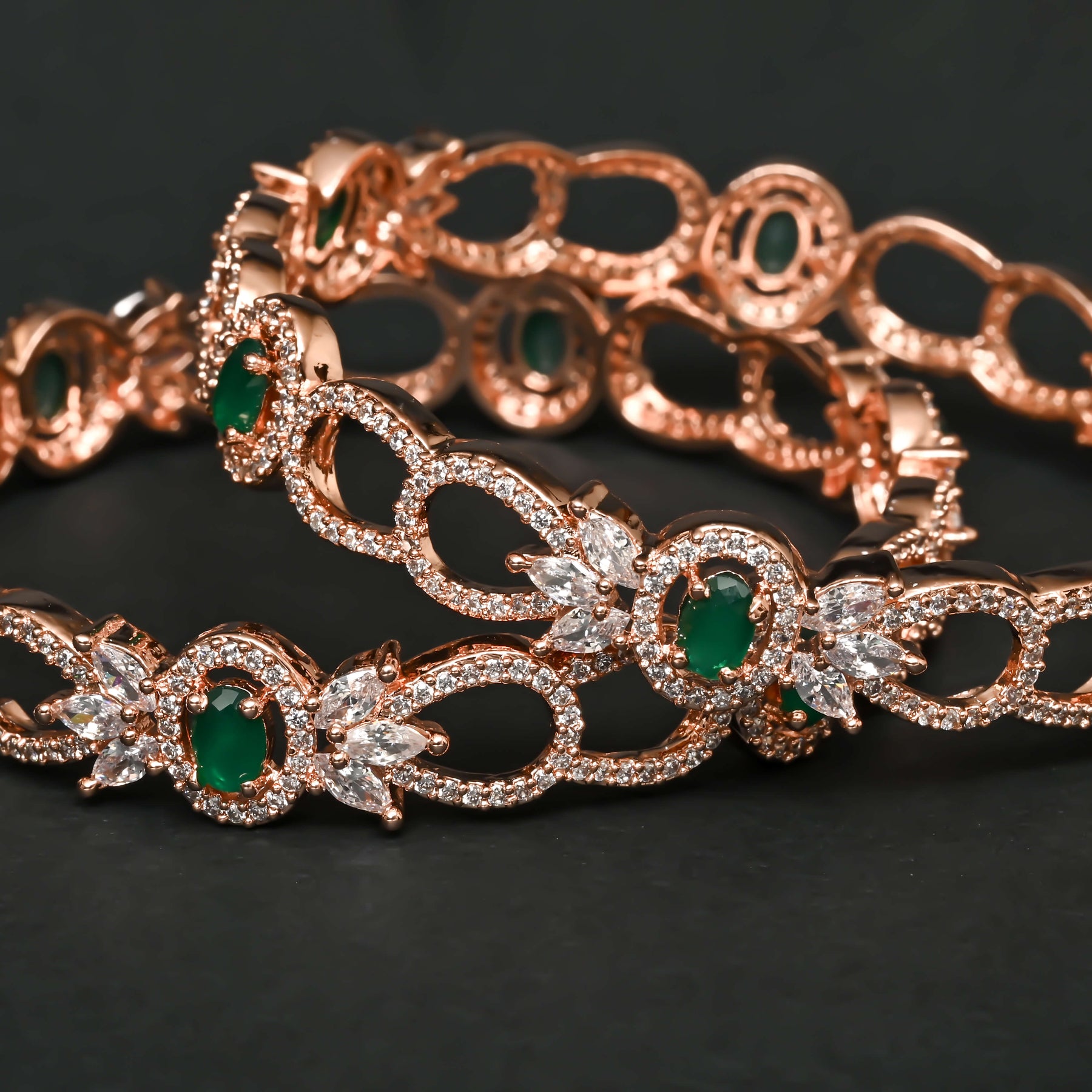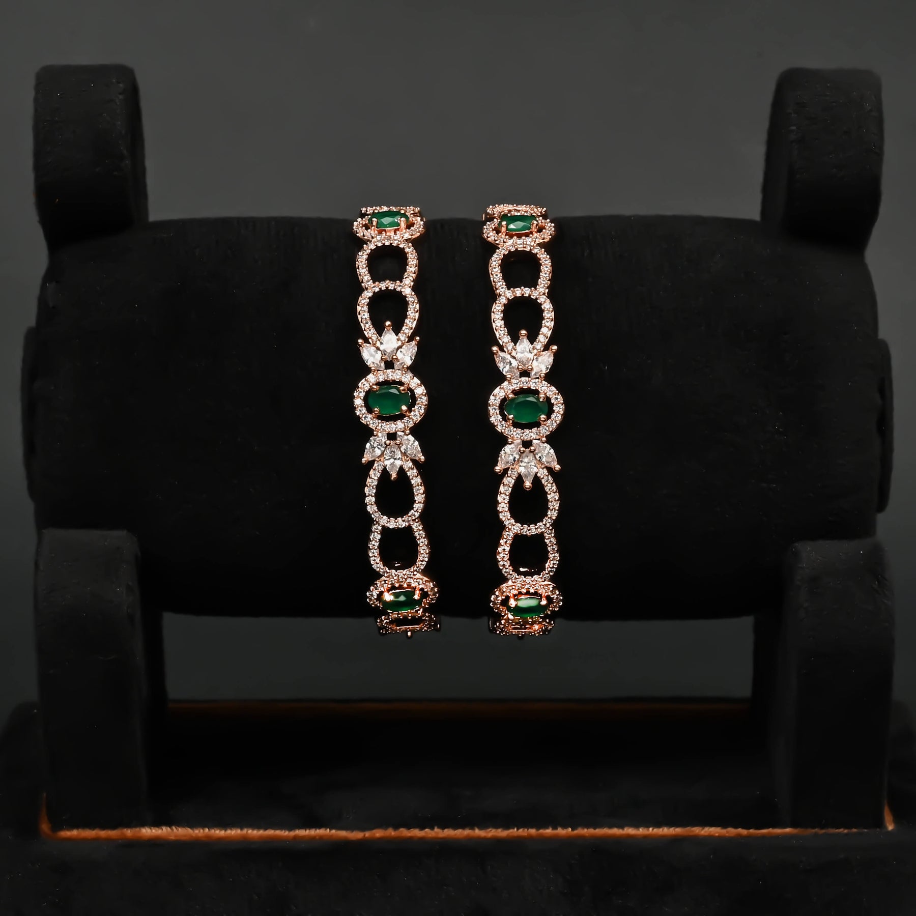 Experience elegance with our CZ Emerald Bangles, expertly handcrafted to showcase real cubic zirconia stones paired with semi-precious emeralds. Designed with a practical side screw, these rose gold-finished bangles offer secure and effortless wear. Each piece features a unique, one-of-a-kind design, blending timeless craftsmanship with modern sophistication. Perfect for those seeking refined beauty with enduring quality.