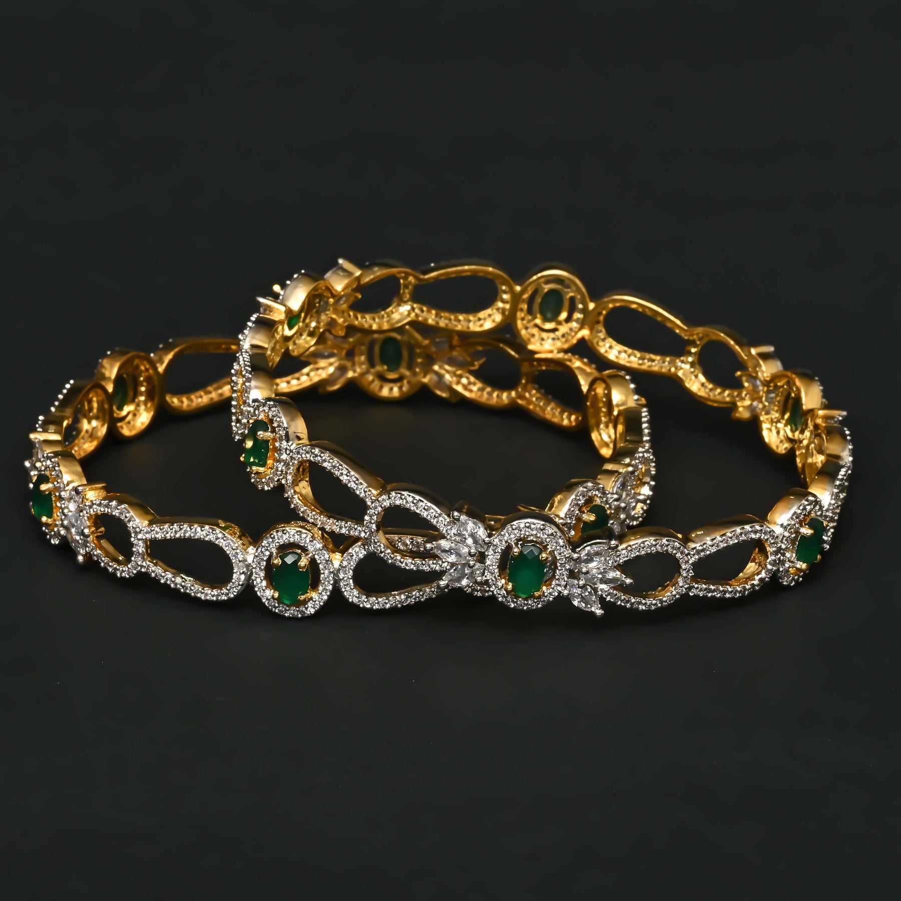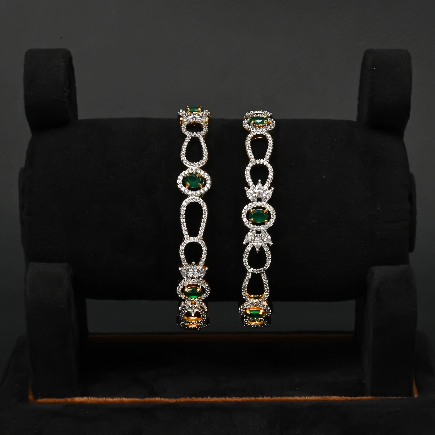 These hand-crafted CZ Emerald Bangles showcase a unique design, featuring real cubic zirconia stones enhanced with semi-precious emeralds. The diamond-finish setting adds brilliant sparkle, while the side screw mechanism ensures effortless wear and secure fit. Each bangle is a one-of-a-kind piece, combining expert craftsmanship with elegant style.