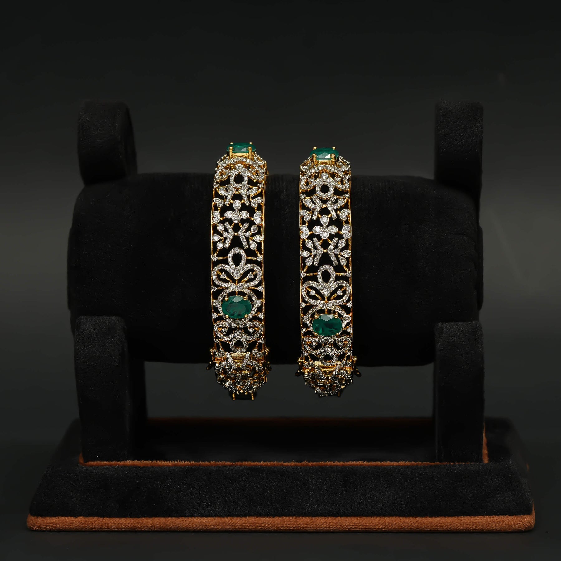 These CZ Emerald Bangles feature a sophisticated diamond finish and are meticulously handcrafted to ensure exceptional quality. Set with genuine CZ stones and semi-precious emeralds, they offer a unique brilliance and color contrast. Designed with a side screw mechanism, they guarantee easy wear and a secure fit. Each piece showcases a one-of-a-kind design, blending elegance with expert craftsmanship for a timeless addition to your collection.