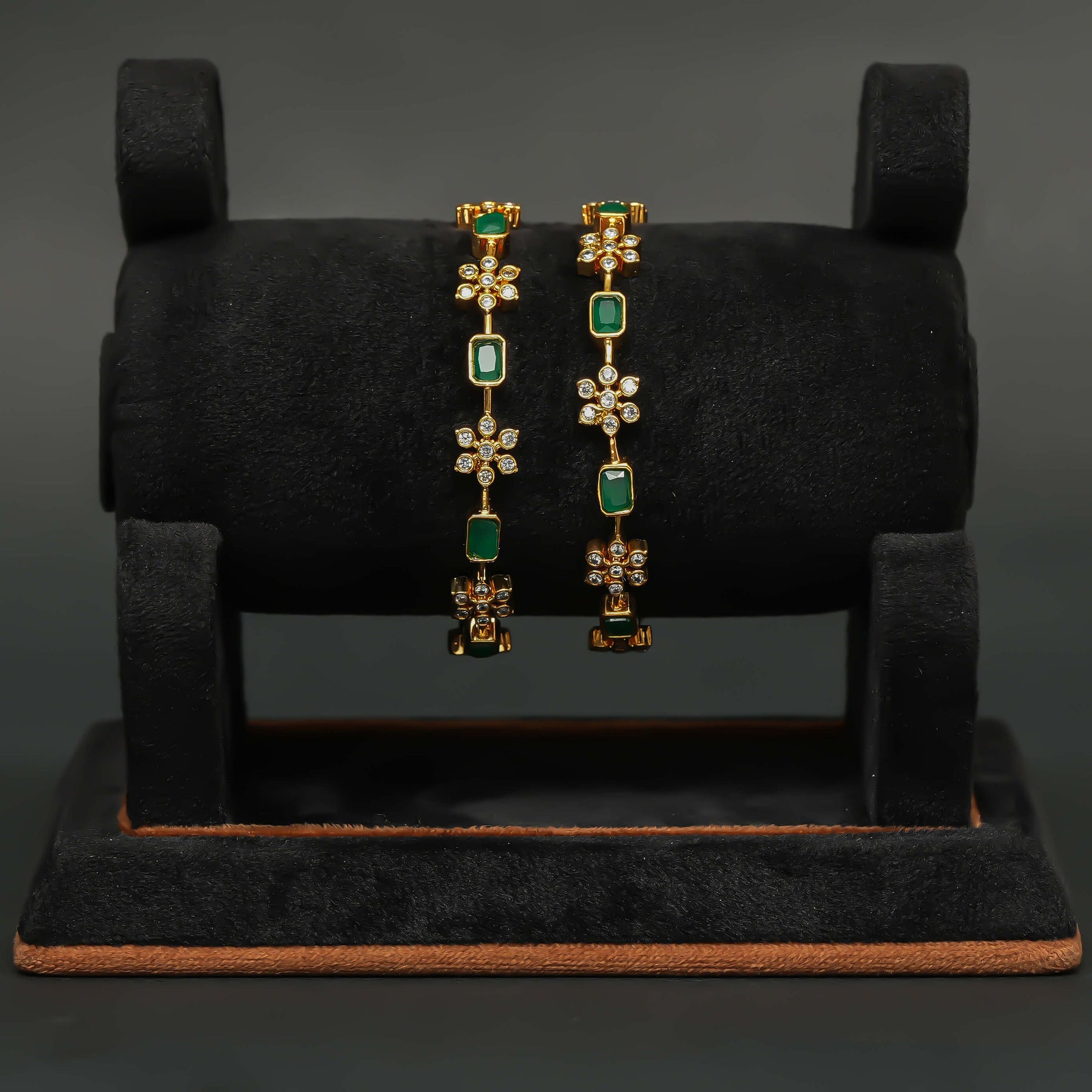 Elevate your style with these expertly handcrafted CZ Emerald Bangles. Featuring real cubic zirconia stones paired with semi-precious emeralds, each bangle showcases a unique, one-of-a-kind design. The gold finish adds timeless elegance, while the side screw mechanism ensures effortless wear and a secure fit. Perfect for those who appreciate detailed craftsmanship and distinctive jewelry pieces.