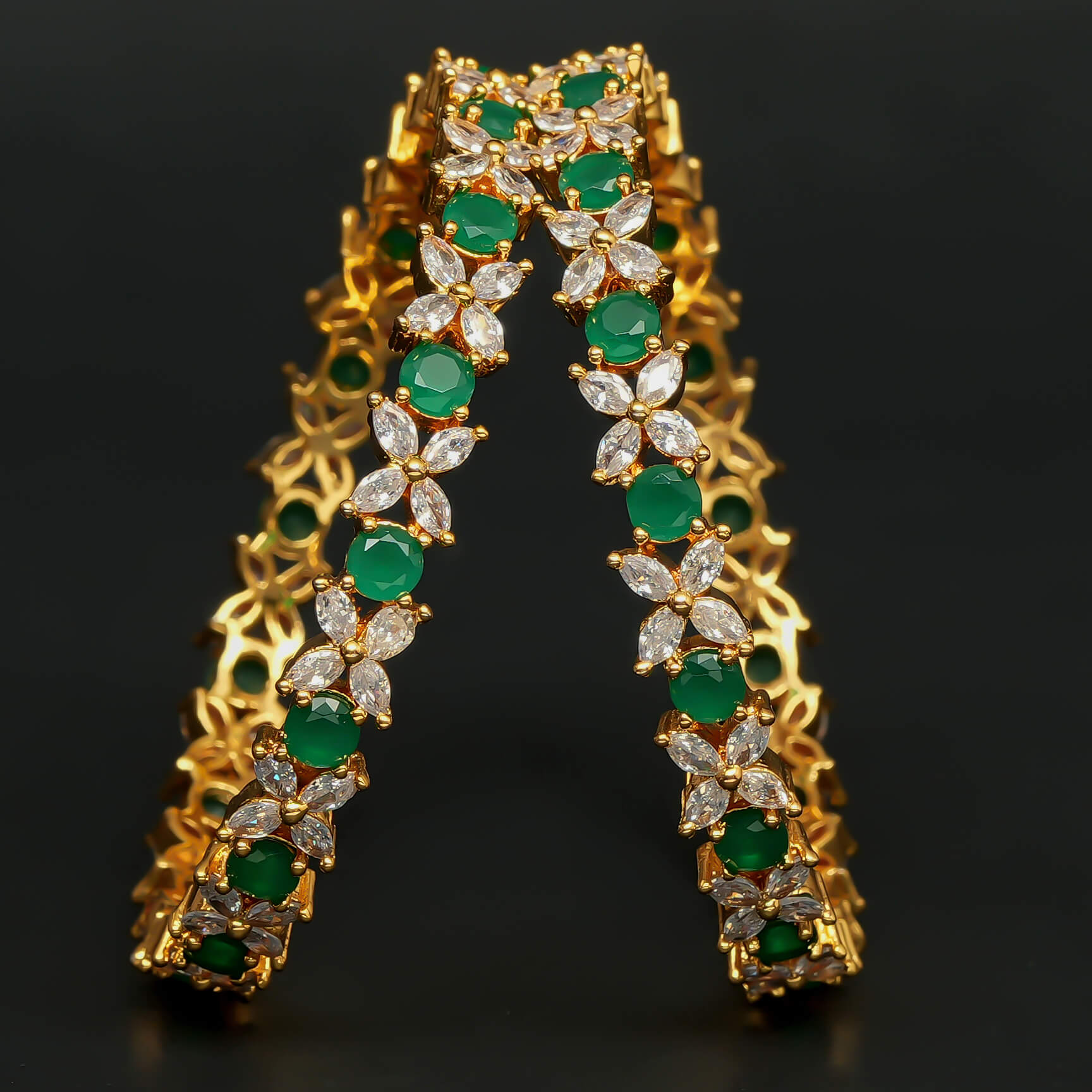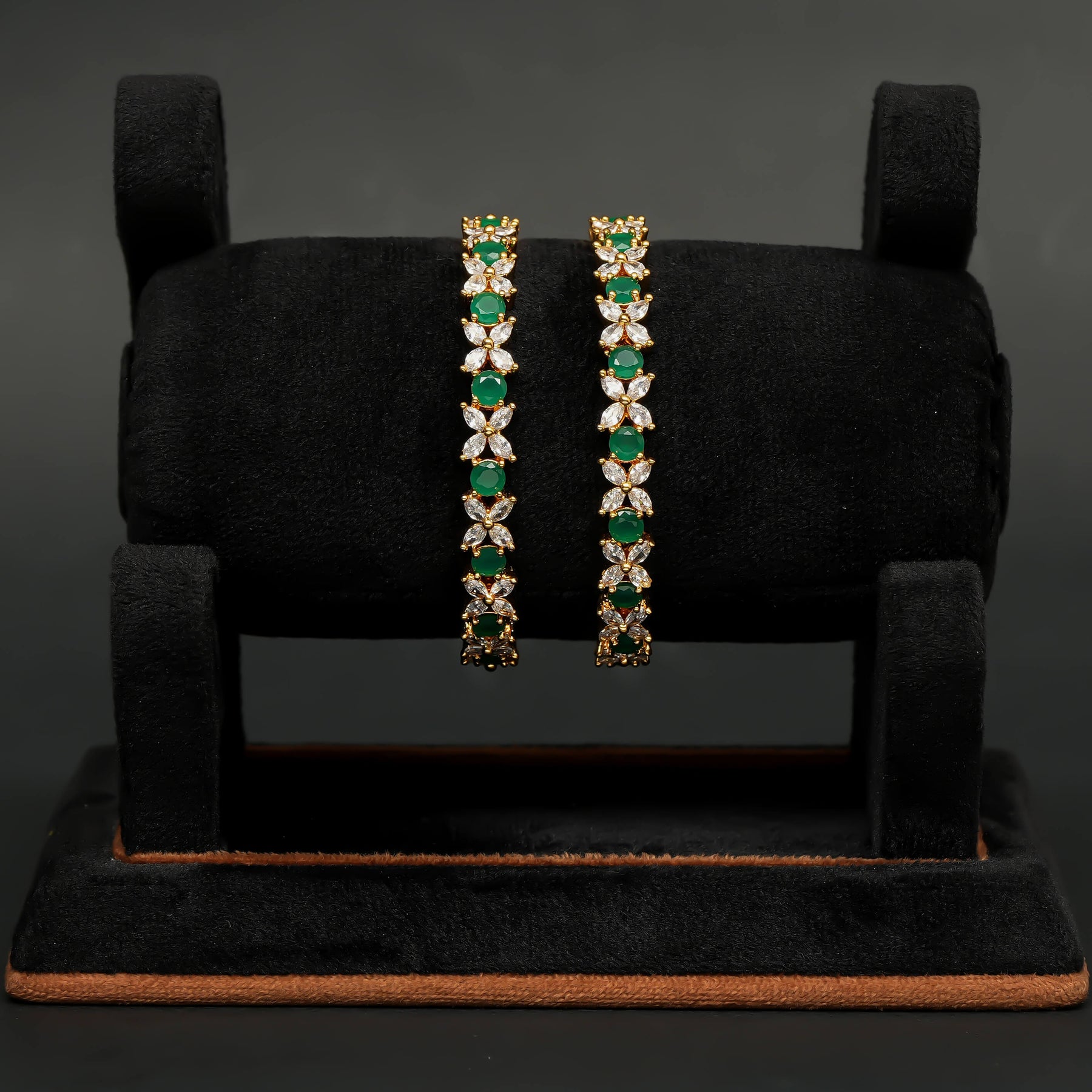 Elevate your elegance with these expertly handcrafted CZ Emerald Bangles, featuring a sophisticated gold finish and genuine CZ stones complemented by semi-precious emerald accents. Designed with a unique one-of-a-kind pattern and a convenient side screw mechanism, these bangles offer both style and effortless wearability. Ideal for adding a refined touch to any ensemble, they exemplify craftsmanship and timeless beauty.
