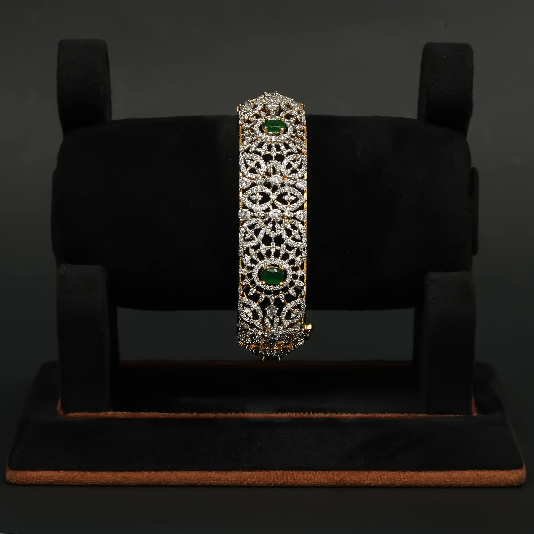 These CZ Emerald Bangles showcase expert craftsmanship with real cubic zirconia stones and semi-precious emerald accents. Handcrafted for precision, their unique one-of-a-kind design features a side screw mechanism that ensures secure and easy wear. The diamond finish adds refined brilliance, making these bangles an exquisite addition to any jewelry collection.