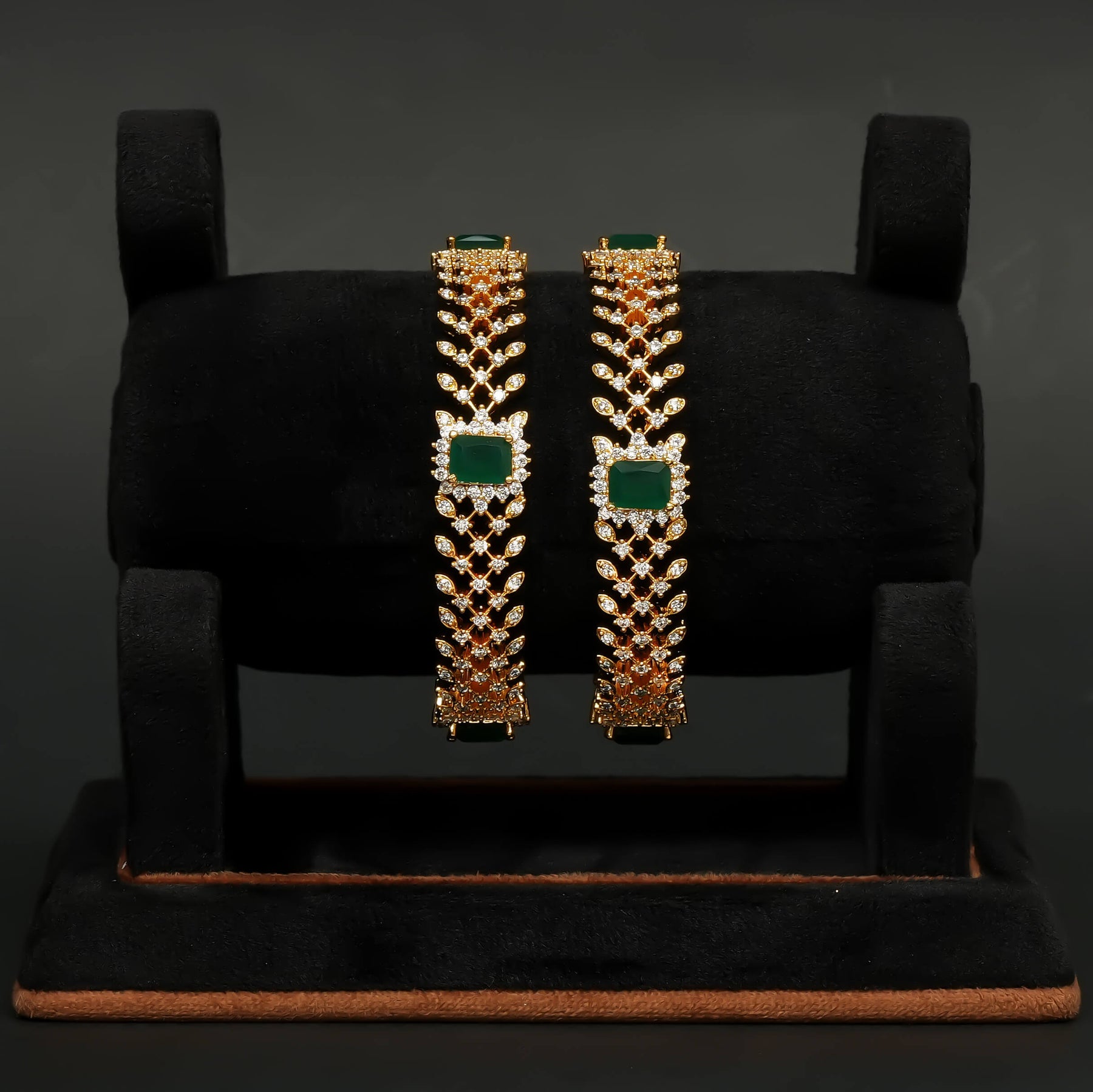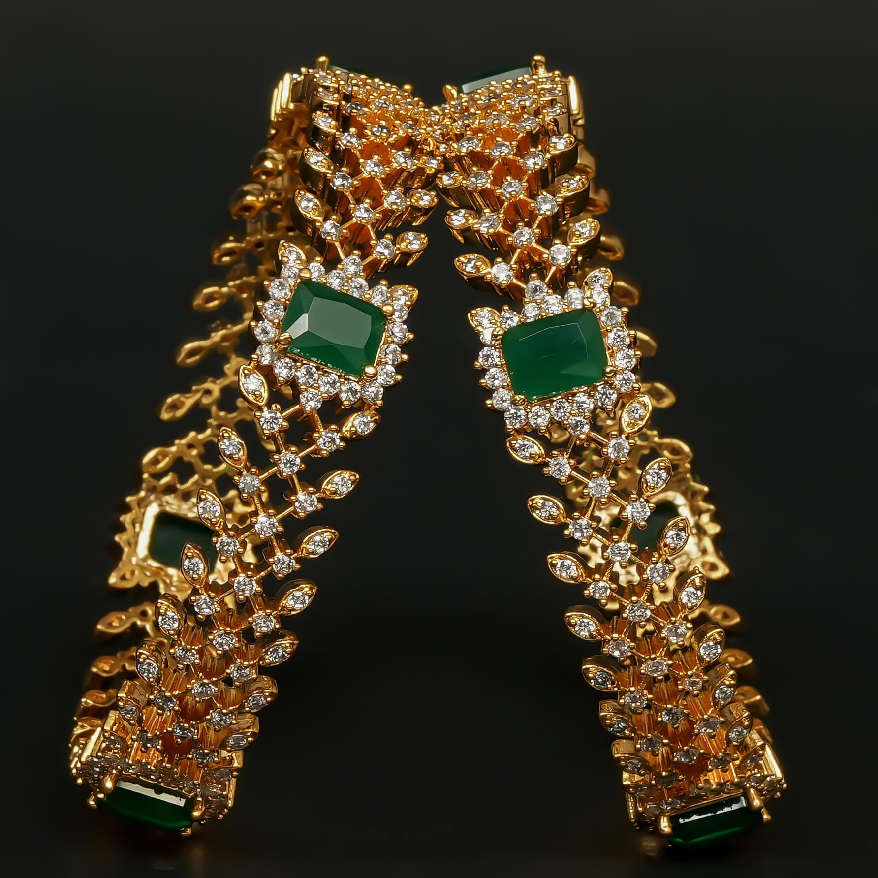 These CZ Emerald Bangles showcase a unique handcrafted design, blending real cubic zirconia stones with semi-precious emeralds set in a rich gold finish. Featuring a convenient side screw mechanism, they ensure easy wear and a secure fit. Each bangle is crafted as a one-of-a-kind piece, combining exquisite detailing with lasting elegance for discerning jewelry enthusiasts.