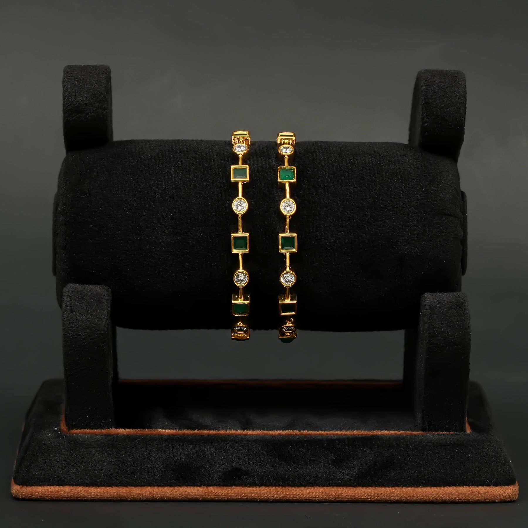 Elevate your elegance with these CZ Emerald Bangles, expertly handcrafted to perfection. Featuring genuine cubic zirconia stones and semi-precious emerald accents, these bangles combine timeless beauty with lasting brilliance. The innovative side screw design ensures effortless wear and secure fit, while the gold finish adds a luxurious touch. Each piece is uniquely crafted, making it a distinctive addition to your fine jewelry collection.