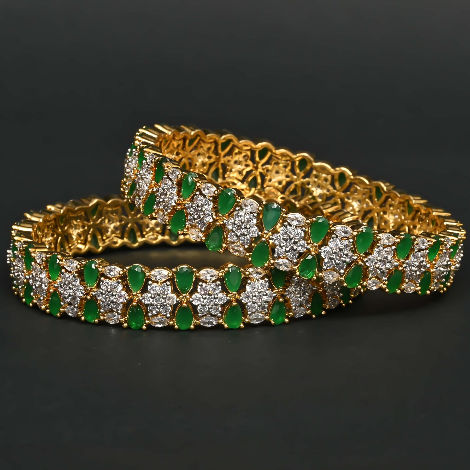 Expertly handcrafted CZ Emerald Bangles in a dazzling diamond finish showcase genuine cubic zirconia stones complemented by semi-precious emerald accents. The side clip design ensures easy wear and a secure fit, while each bangle features a unique, one-of-a-kind design that blends exquisite craftsmanship with timeless elegance.