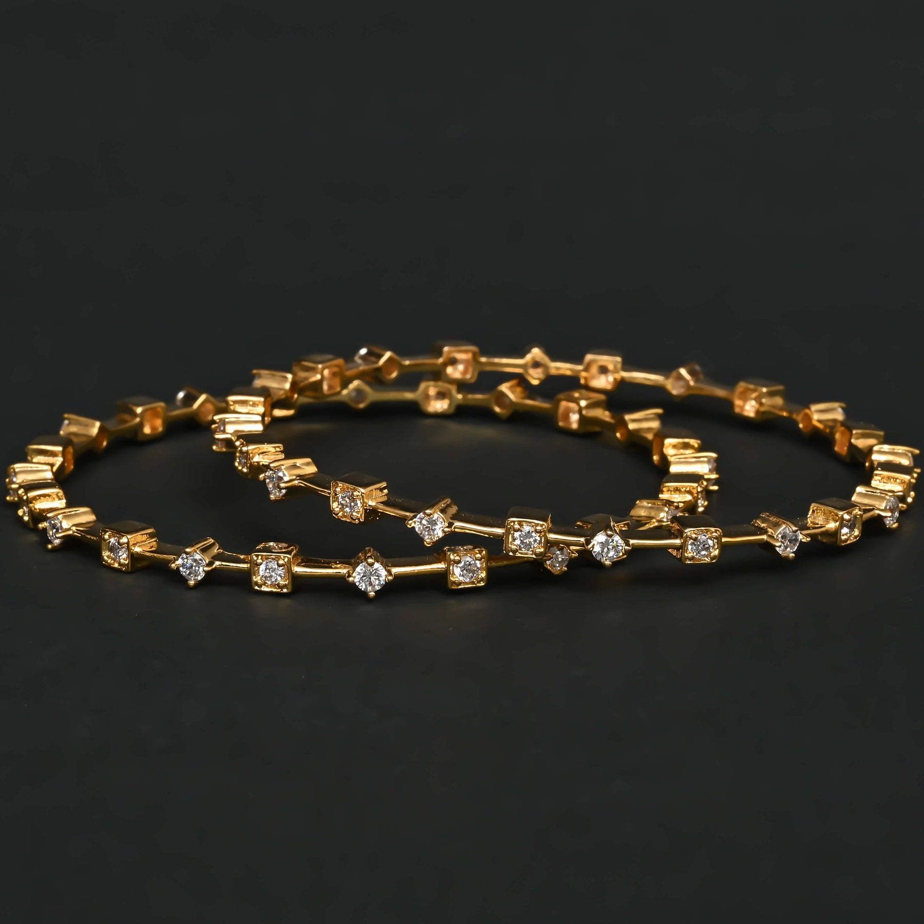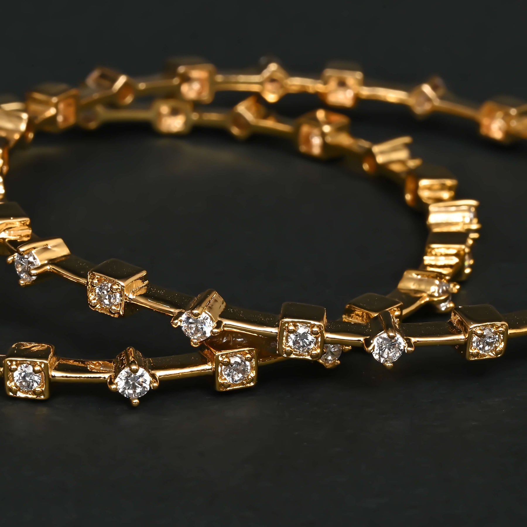 These CZ Gold Finish Bangles showcase exquisite craftsmanship with real CZ stones that mimic the brilliance of diamonds. Handcrafted with precision, each bangle features a unique design that stands out, combining elegance with a timeless appeal. Perfect for adding a sophisticated sparkle to any ensemble, these bangles offer both luxury and exceptional quality.