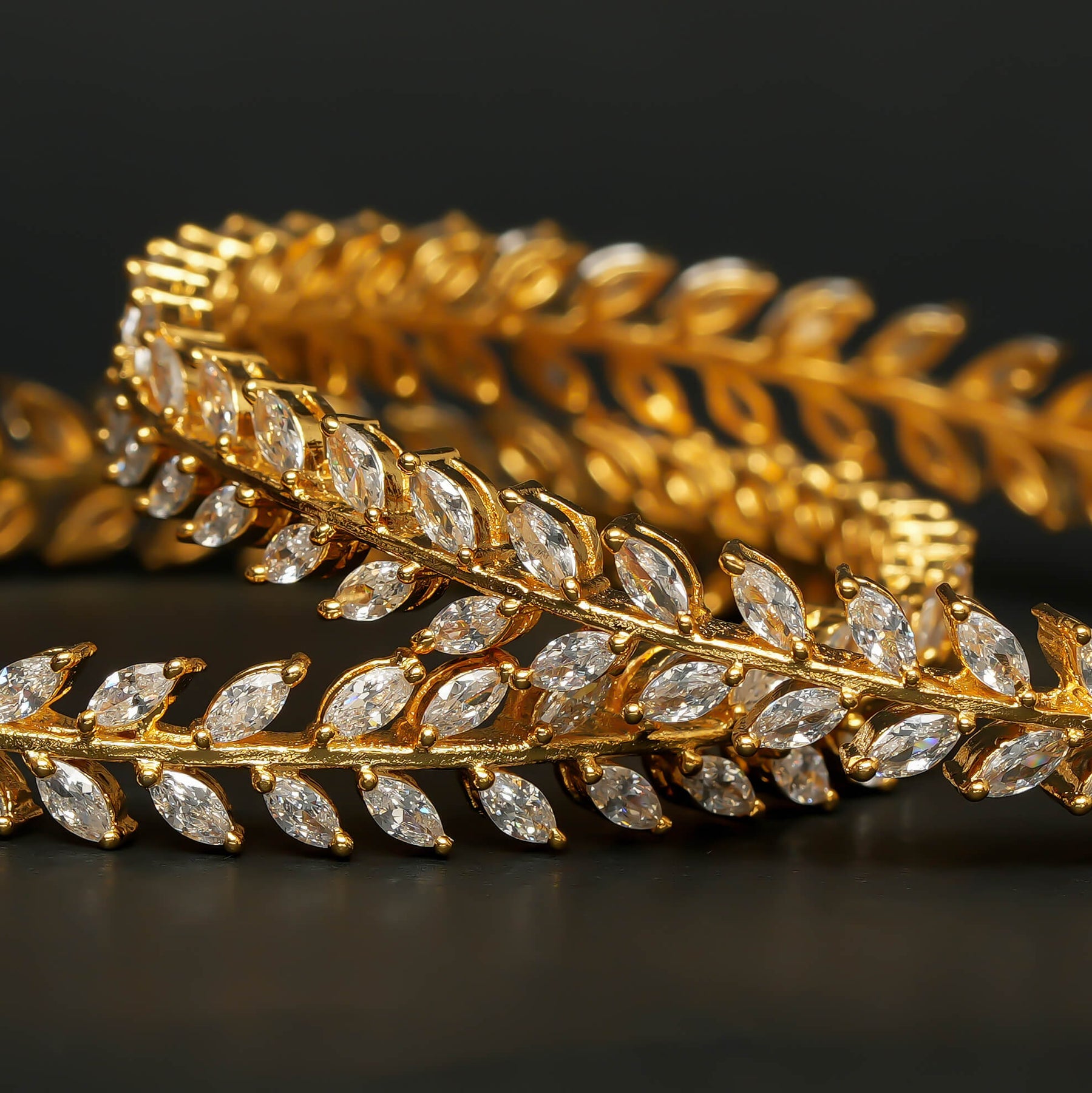 These CZ Gold Finish Bangles showcase expertly handcrafted design with real cubic zirconia stones, offering a stunning alternative to traditional gold jewelry. The unique side screw mechanism ensures easy wear and a secure fit. Their one-of-a-kind design adds a refined elegance, making them a distinguished addition to any collection.