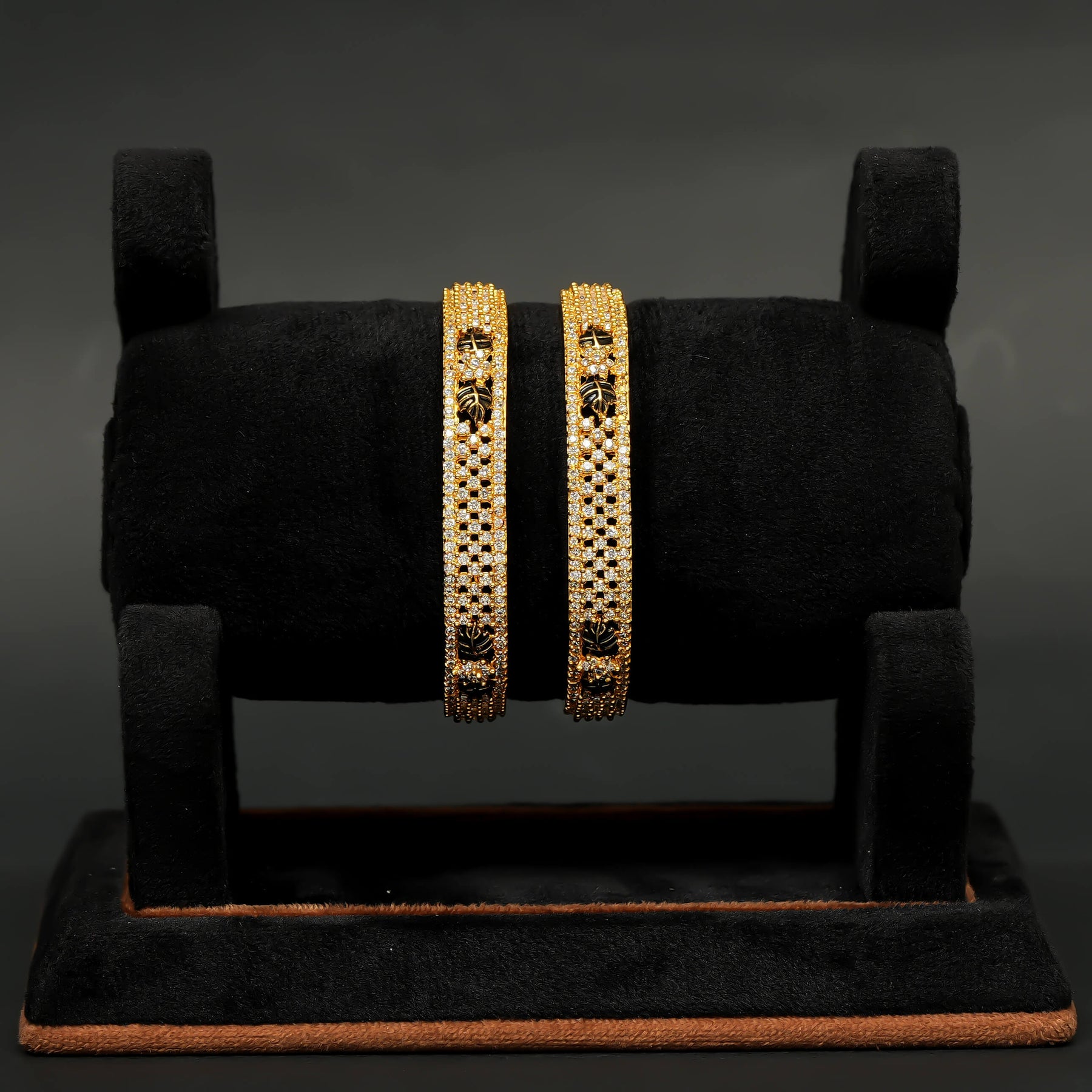 These CZ Gold Finish Bangles showcase expertly handcrafted design featuring genuine CZ stones for a brilliant sparkle. The unique one-of-a-kind pattern complements the elegant gold finish, while the side screw mechanism ensures secure and easy wear. Perfect for those seeking timeless sophistication combined with practical functionality.
