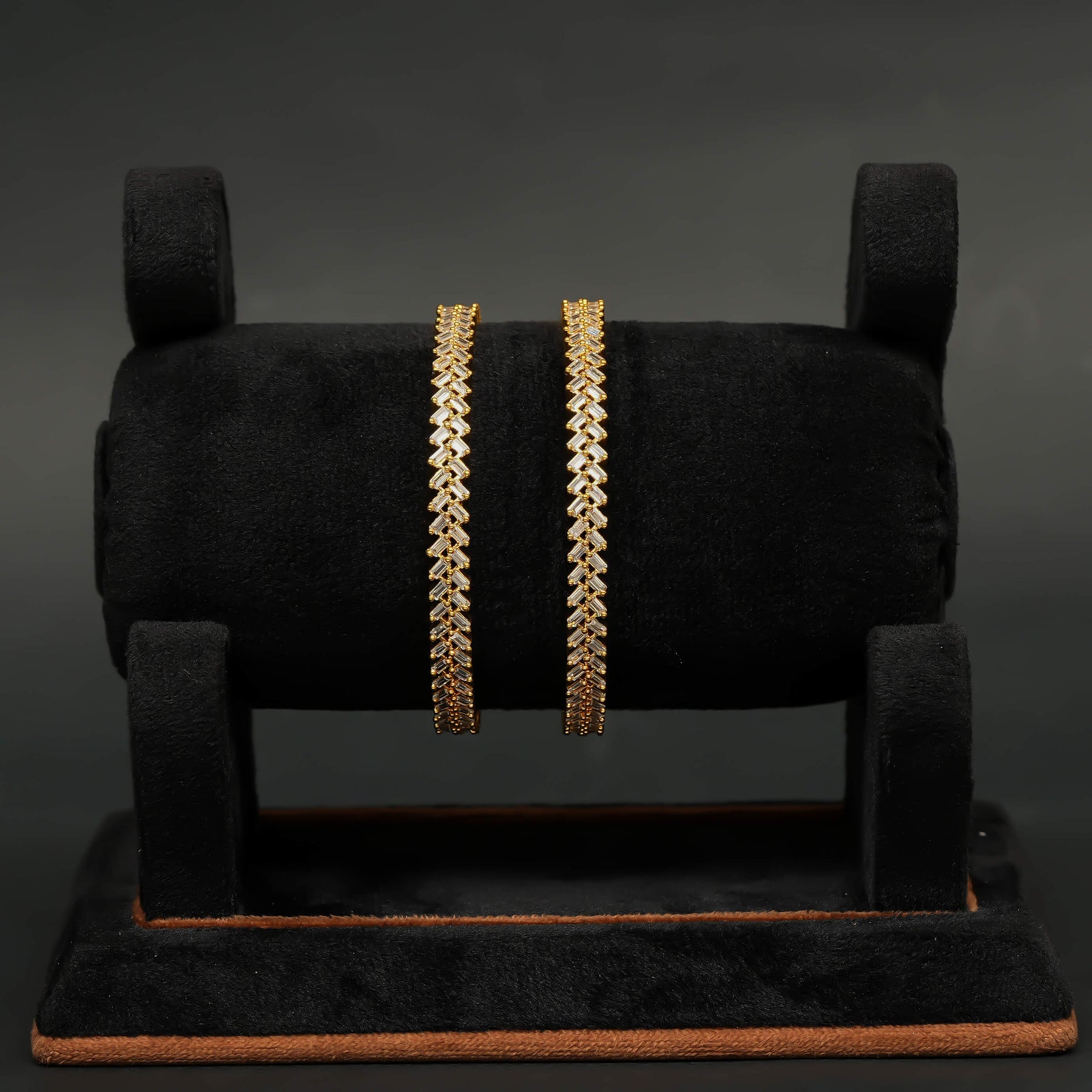 These CZ Gold Finish Bangles showcase a unique, handcrafted design set with genuine CZ stones, offering both elegance and durability. Featuring a side screw mechanism, they ensure effortless wear and secure fit. With their distinctive craftsmanship and refined gold finish, these bangles are a sophisticated addition to any jewelry collection.