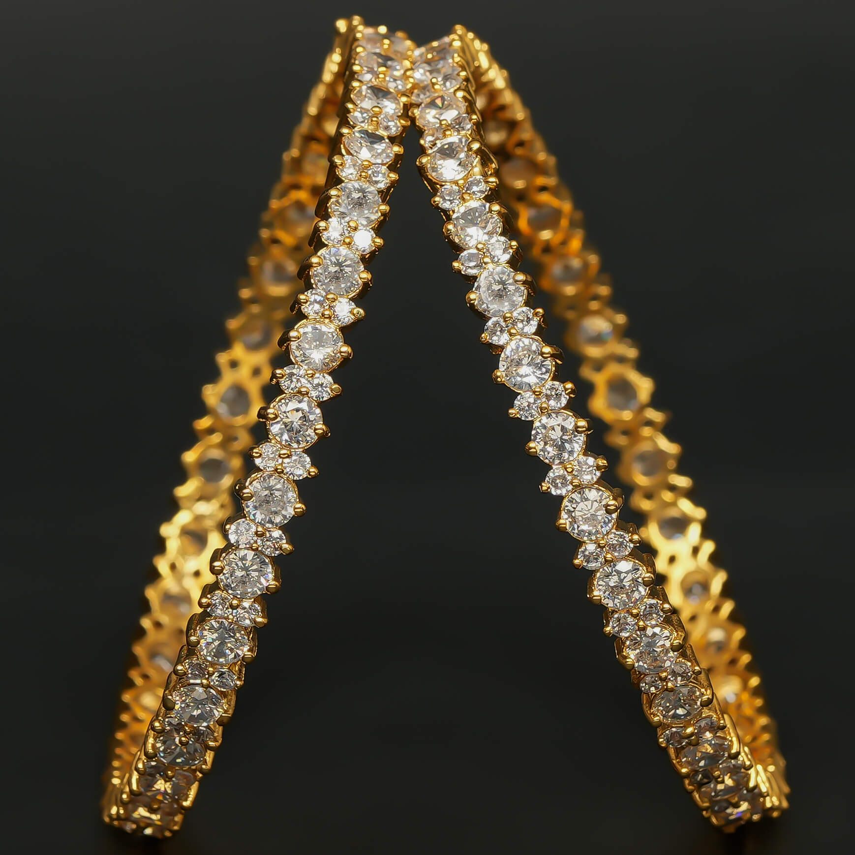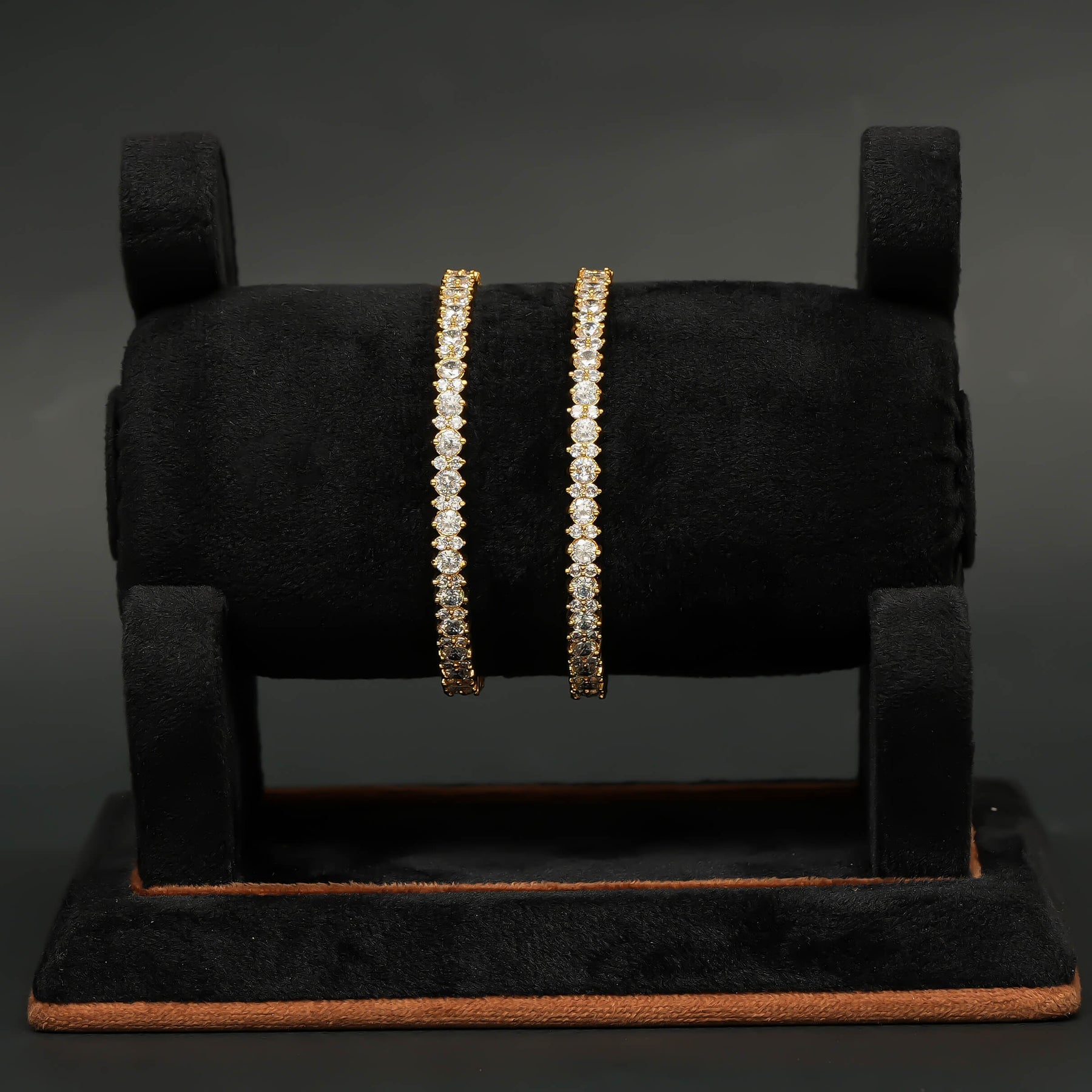Experience elegance with these CZ Gold Finish Bangles, expertly handcrafted to highlight real CZ stones for lasting brilliance. The unique design features a side screw mechanism, allowing effortless wear and secure fit. This one-of-a-kind piece combines sophistication with practicality, enhancing your collection with timeless charm and exceptional craftsmanship.