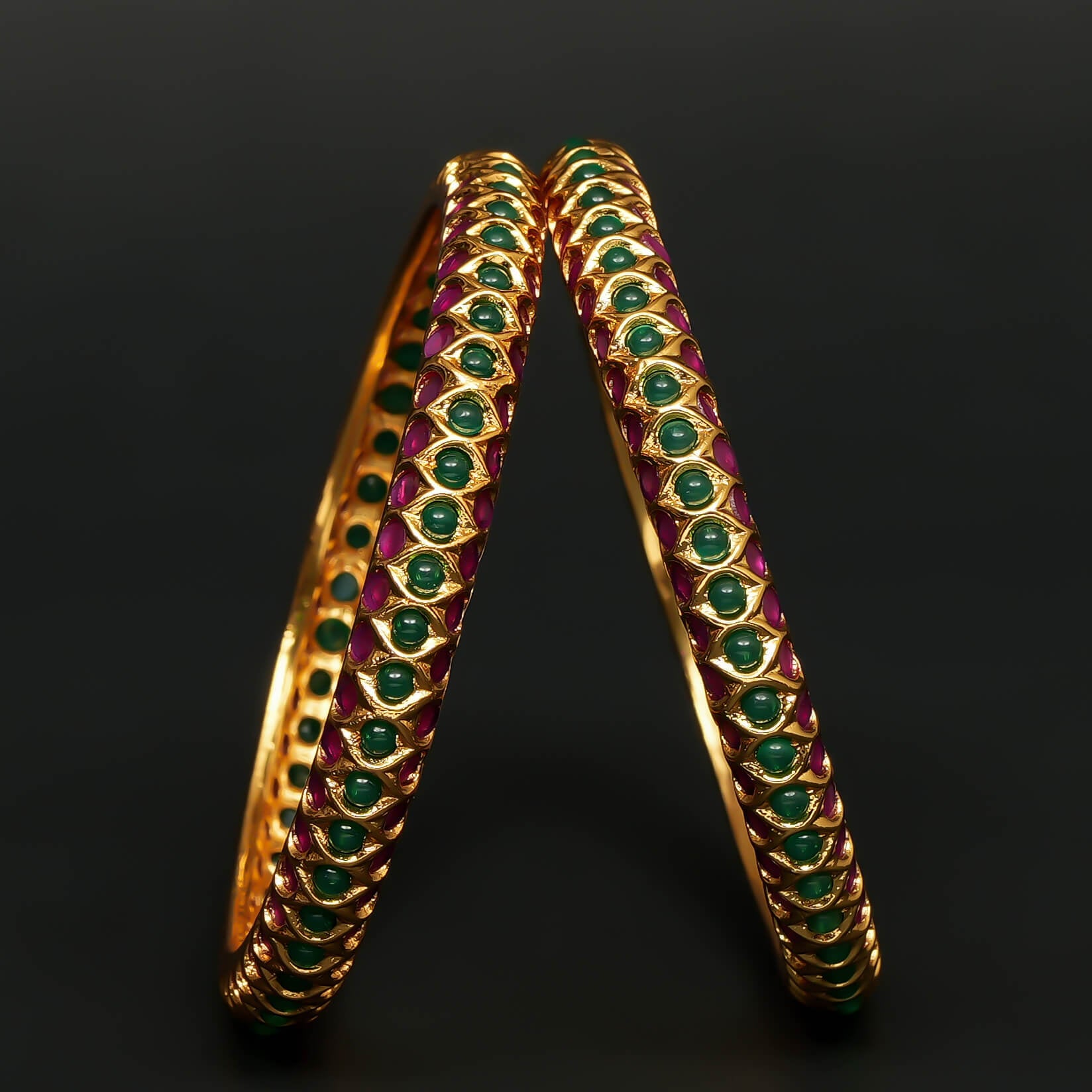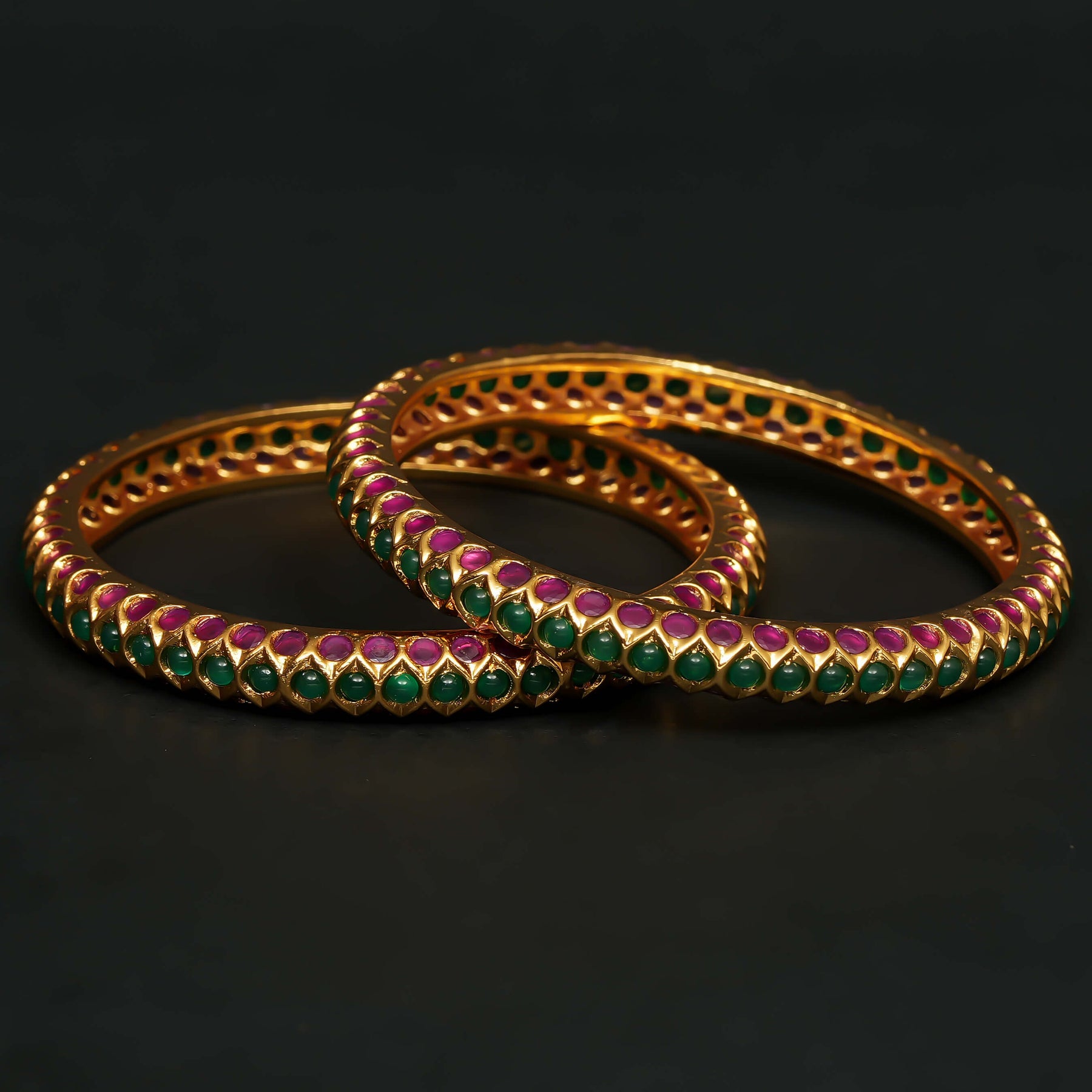 These CZ Gold Finish Bangles showcase expert craftsmanship with genuine CZ stones, accented by semi-precious ruby and emerald highlights. Each bangle is meticulously handcrafted and features a convenient side screw for effortless wearing. The unique, one-of-a-kind design ensures a distinctive and elegant addition to any jewelry collection.