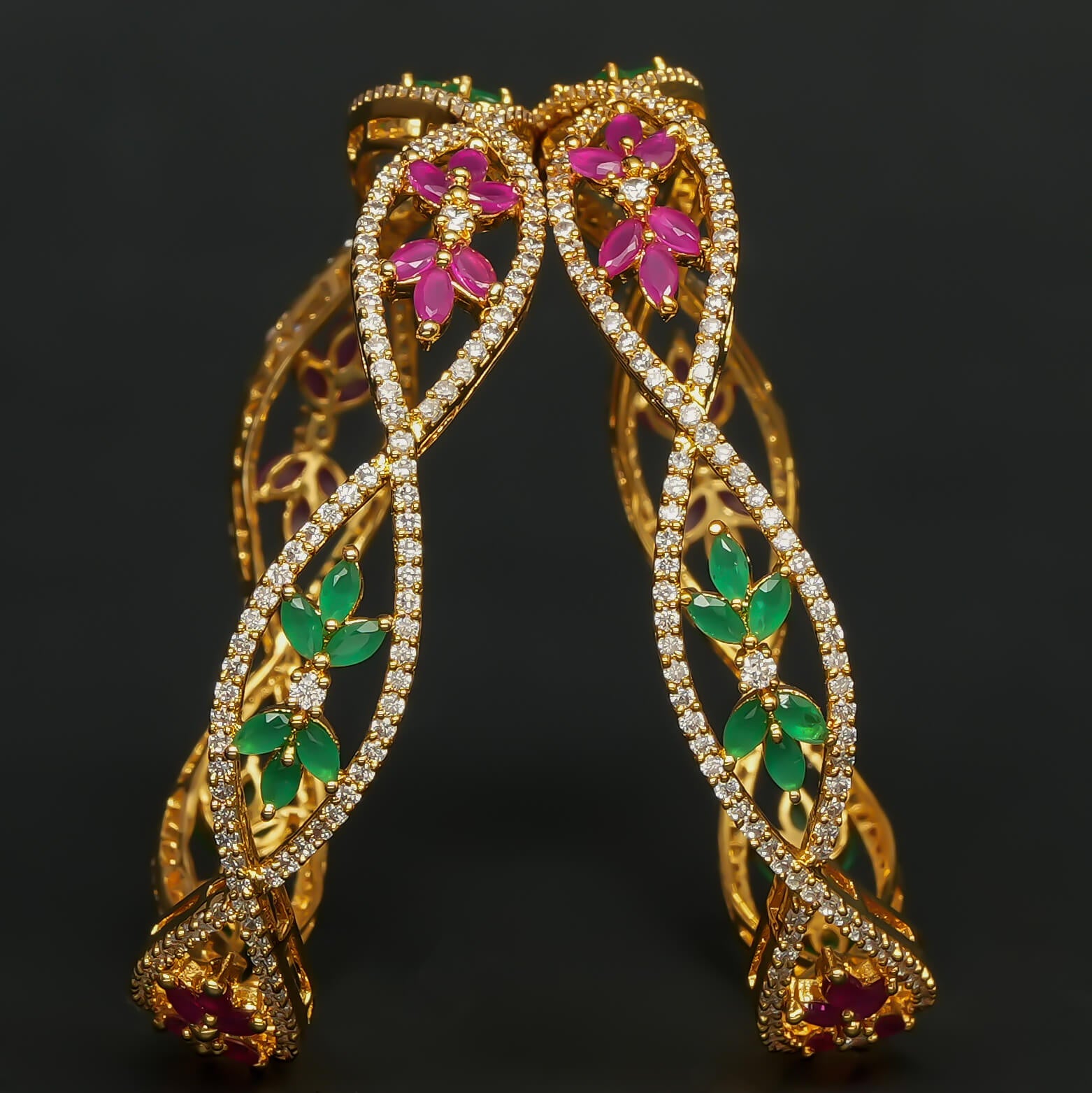Experience elegance with these CZ Gold Finish Bangles, meticulously handcrafted to showcase real cubic zirconia stones alongside semi-precious ruby and emerald accents. Designed with a unique one-of-a-kind pattern, each bangle features a side screw mechanism for effortless wearing. Perfectly blending craftsmanship and style, these bangles add a sophisticated touch to any ensemble.