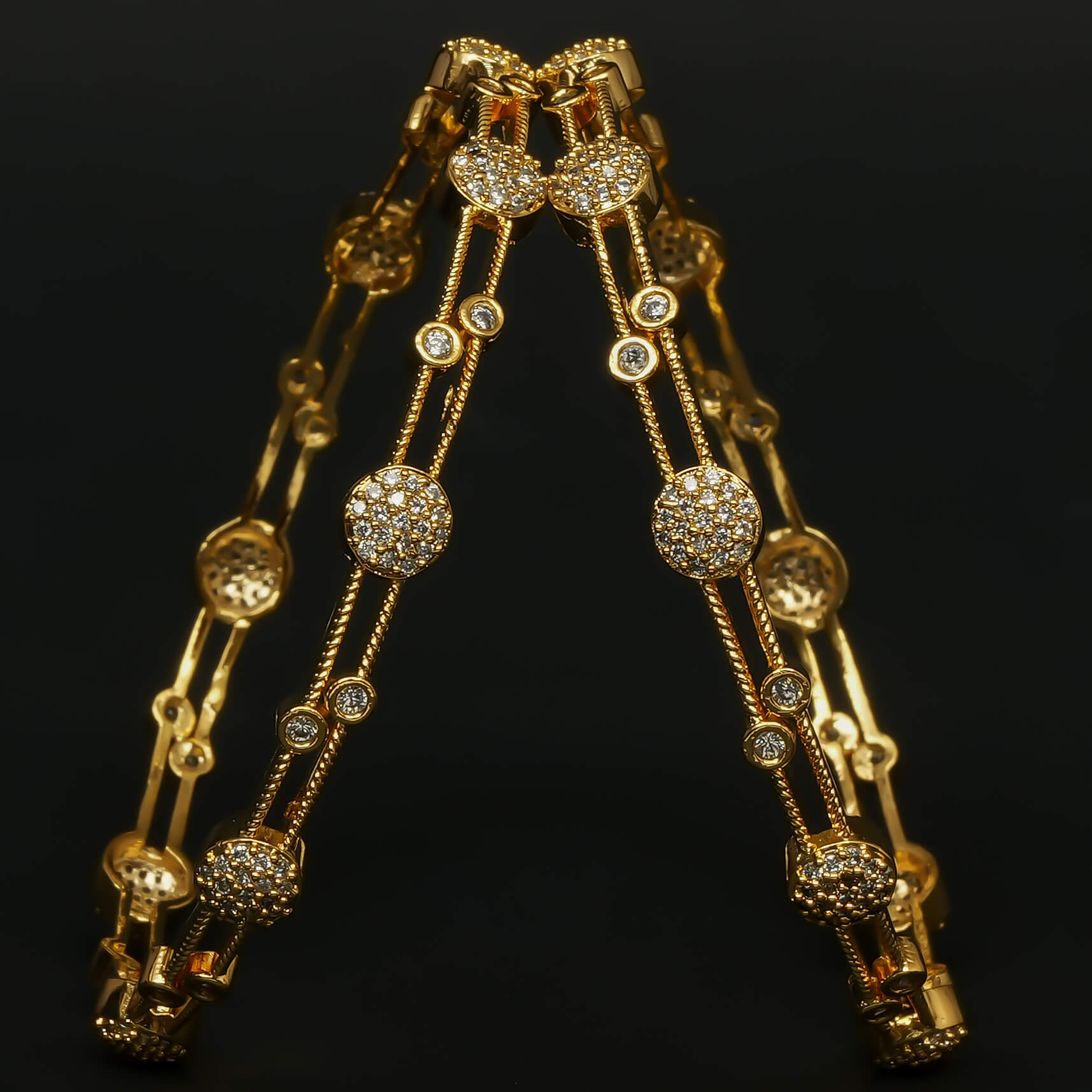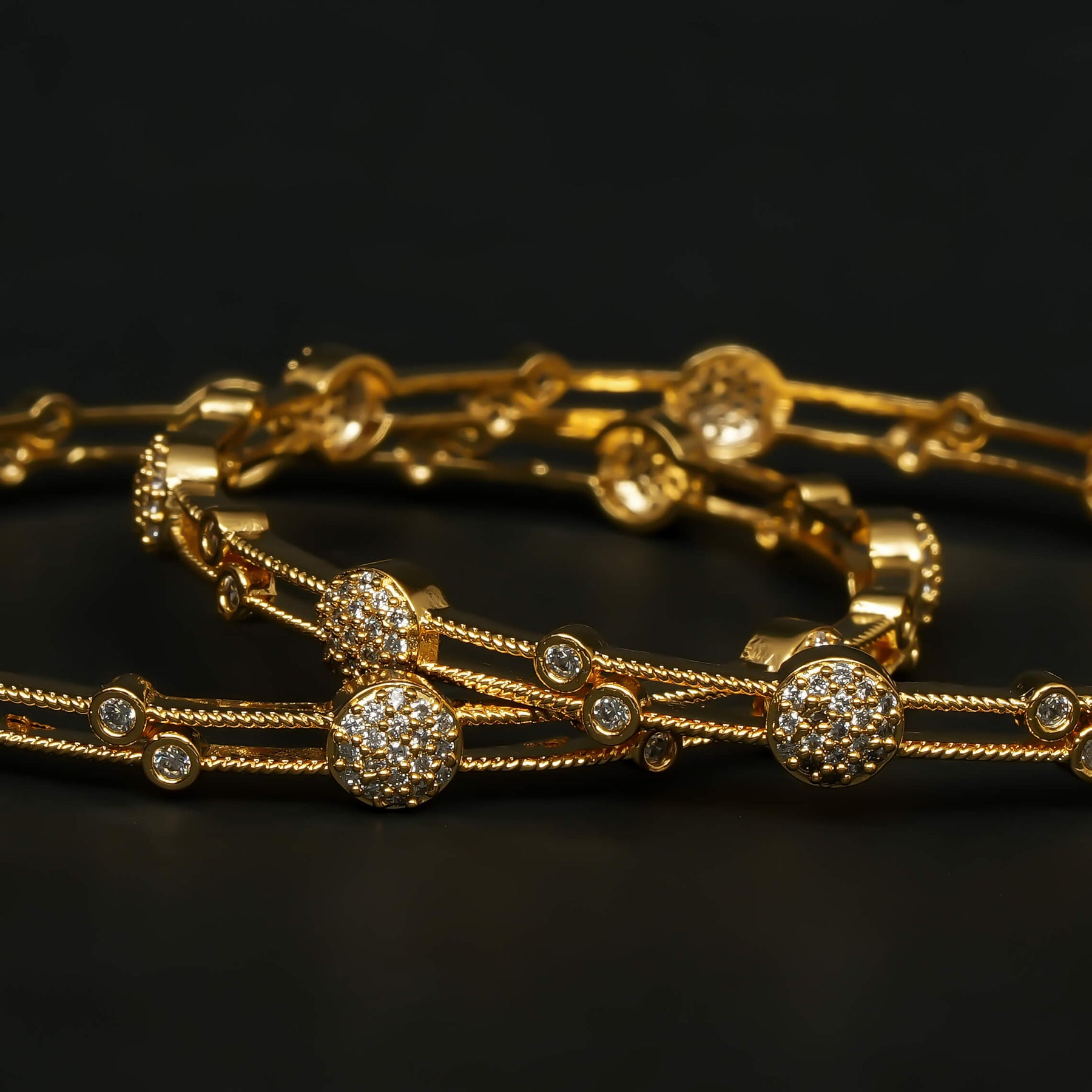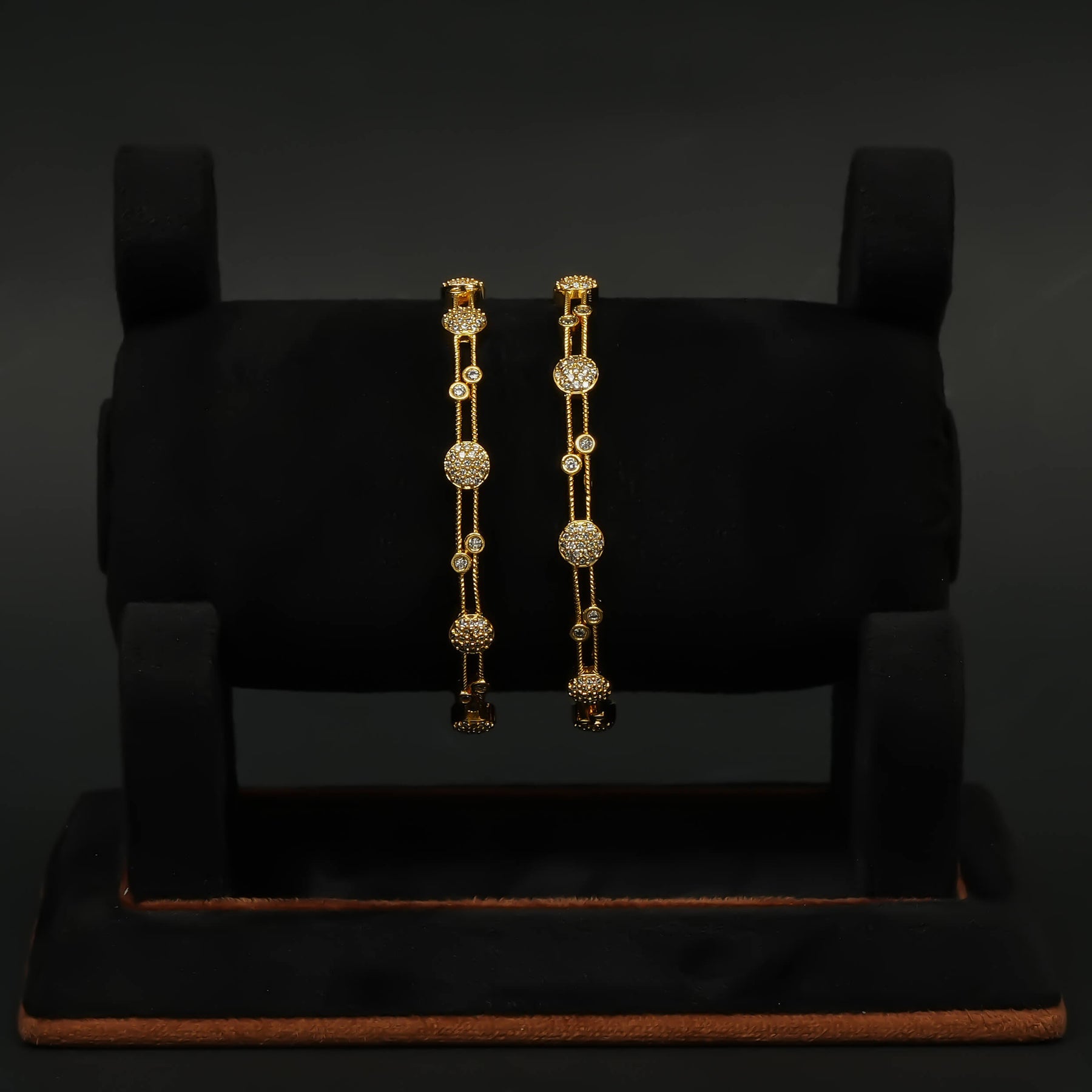 Experience elegance with these CZ Gold Finish Bangles, expertly handcrafted to showcase genuine CZ stones. The unique, one-of-a-kind design offers a distinctive look, while the side screw mechanism ensures effortless wearing and secure fit. Perfectly blending style and convenience, these bangles elevate any ensemble with lasting brilliance.