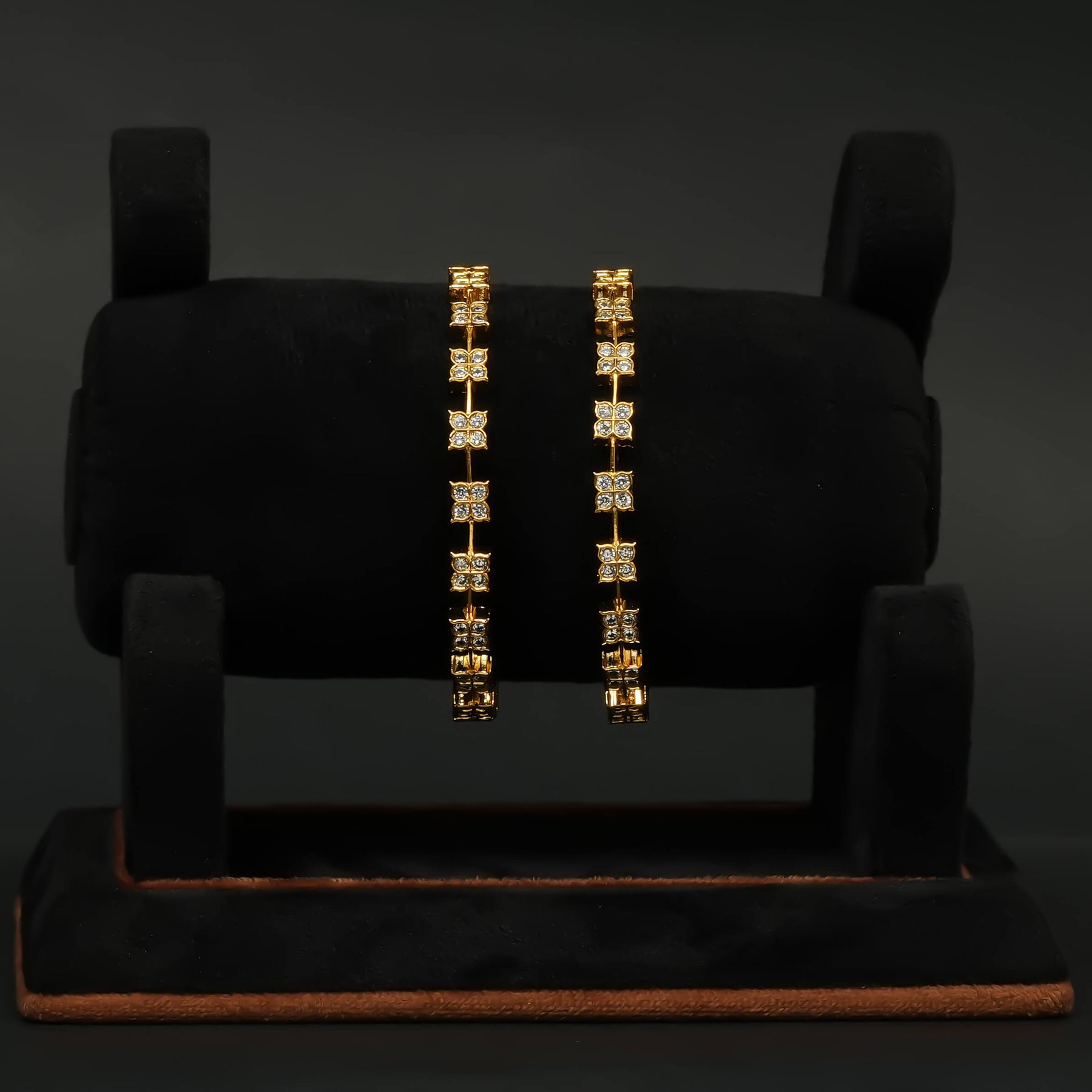 These handcrafted CZ Gold Finish Bangles combine exquisite craftsmanship with lasting elegance. Set with genuine cubic zirconia stones, they offer the brilliance of fine gems while maintaining durability. Designed with a discreet side screw, these bangles ensure effortless wear and secure fit. Each piece features a unique, one-of-a-kind design, making it a distinguished addition to any jewelry collection. Perfect for elevating both everyday and special occasion looks with expert precision.